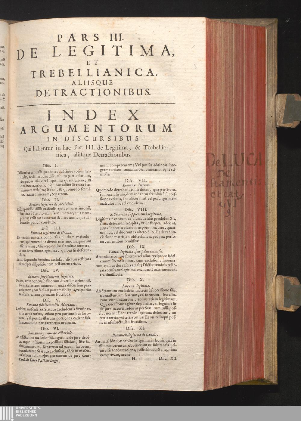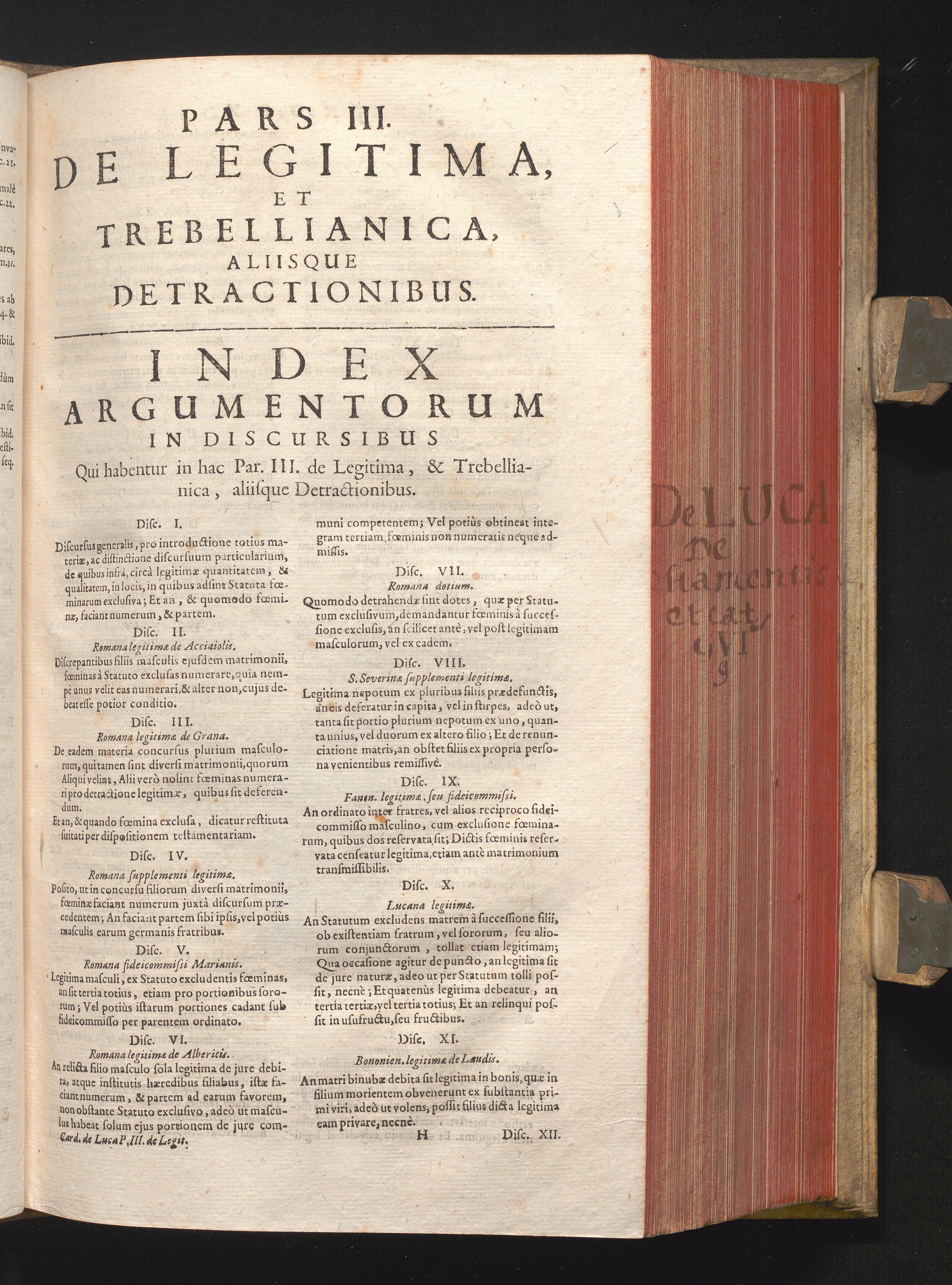 Pars III. De Legitima, Et Trebellianica, aliisque Detractionibus. Index Argumentorum[...]