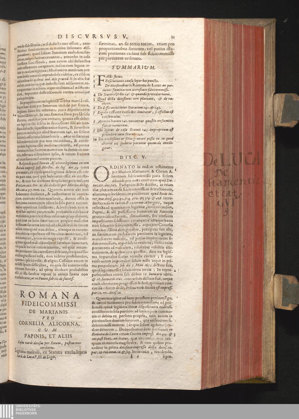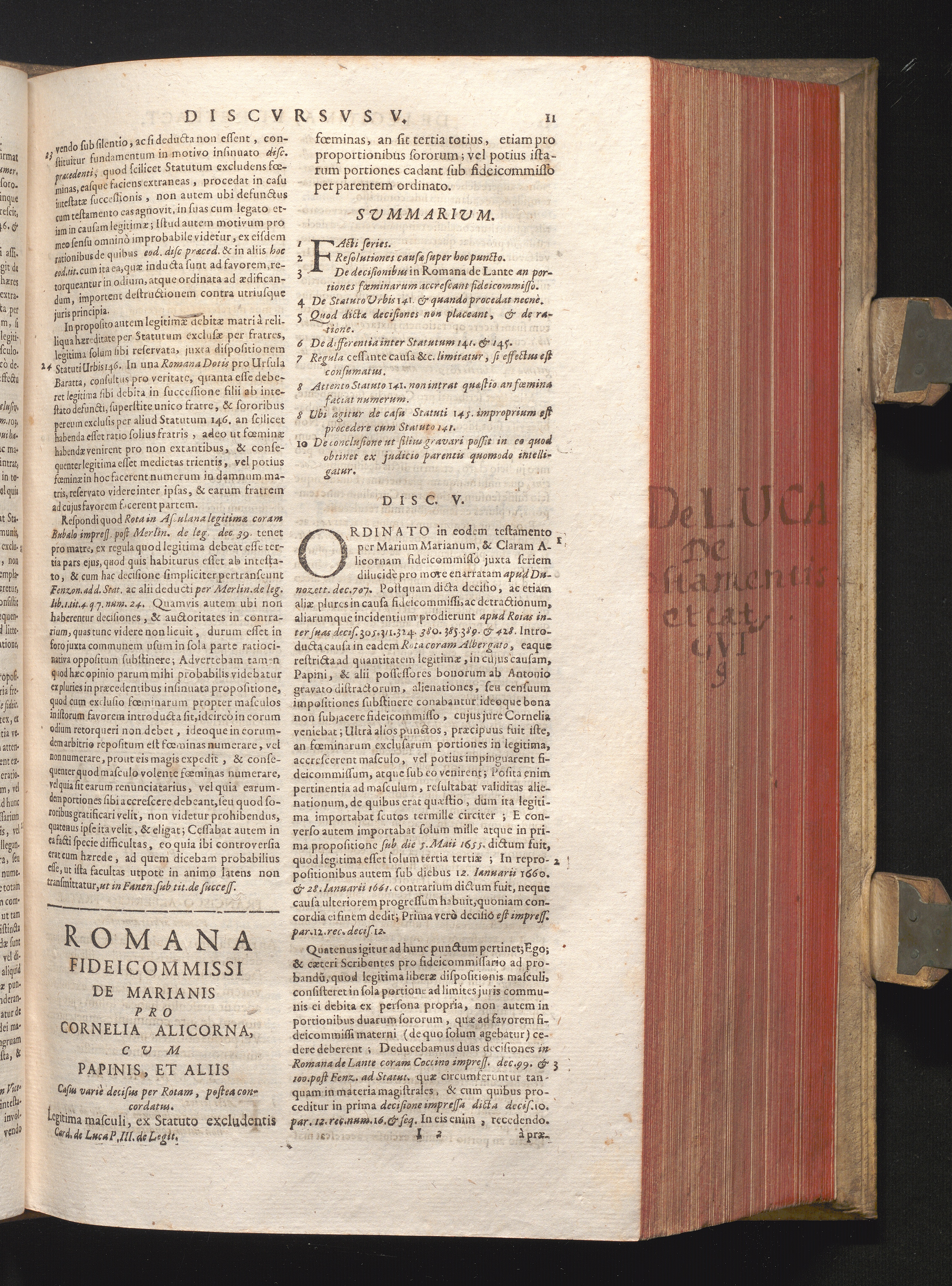 Disc. V. Romana fideicommissi de Marianis. Legitima masculi, ex Statuto excludentis[...]