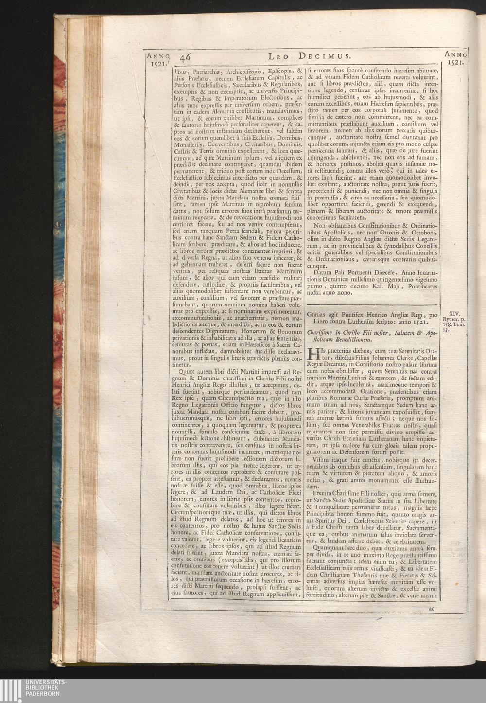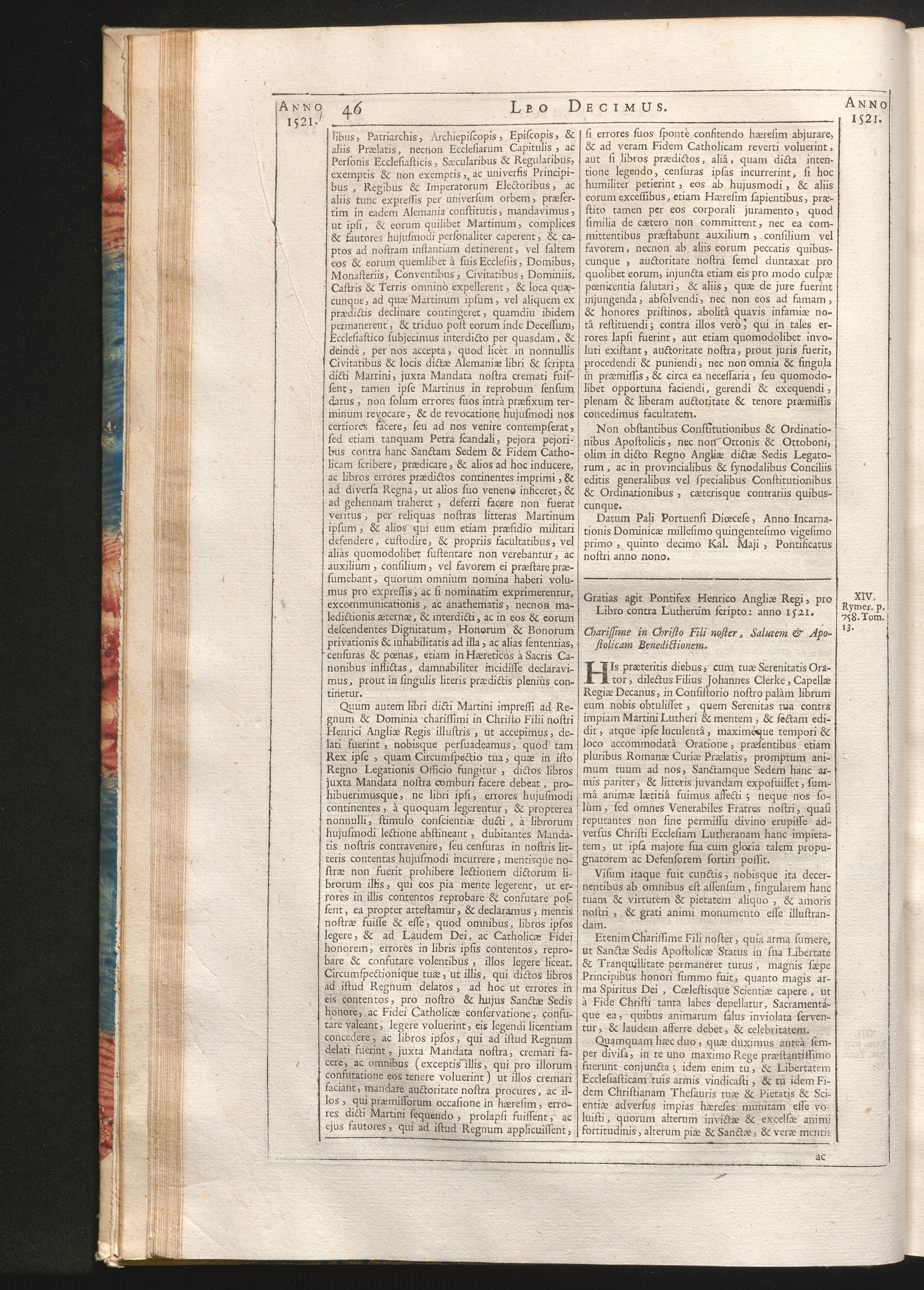 14. His præteritis &c. Gratias agit Pontifex Henrico Angliæ Regi, pro Libro contra[...]
