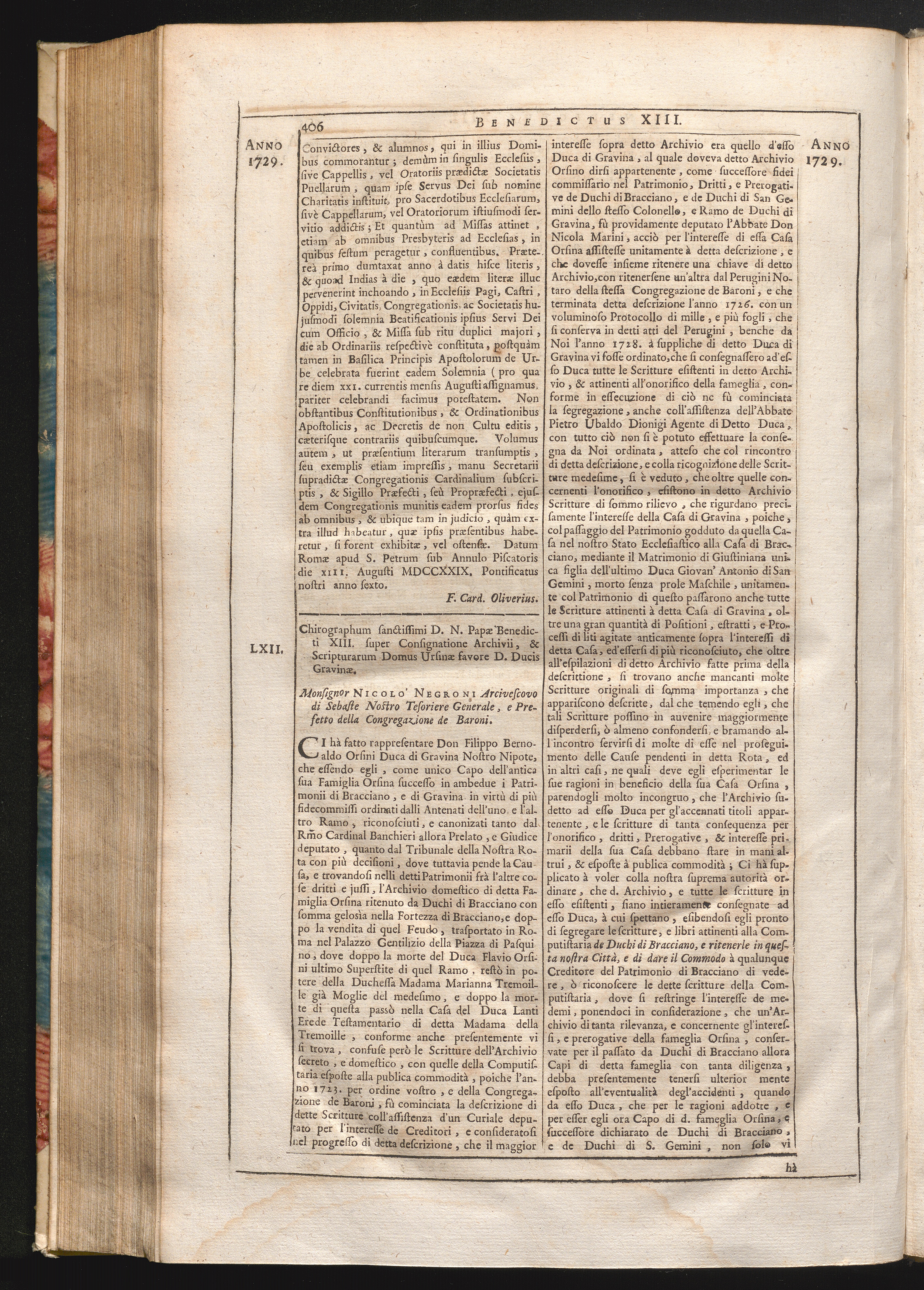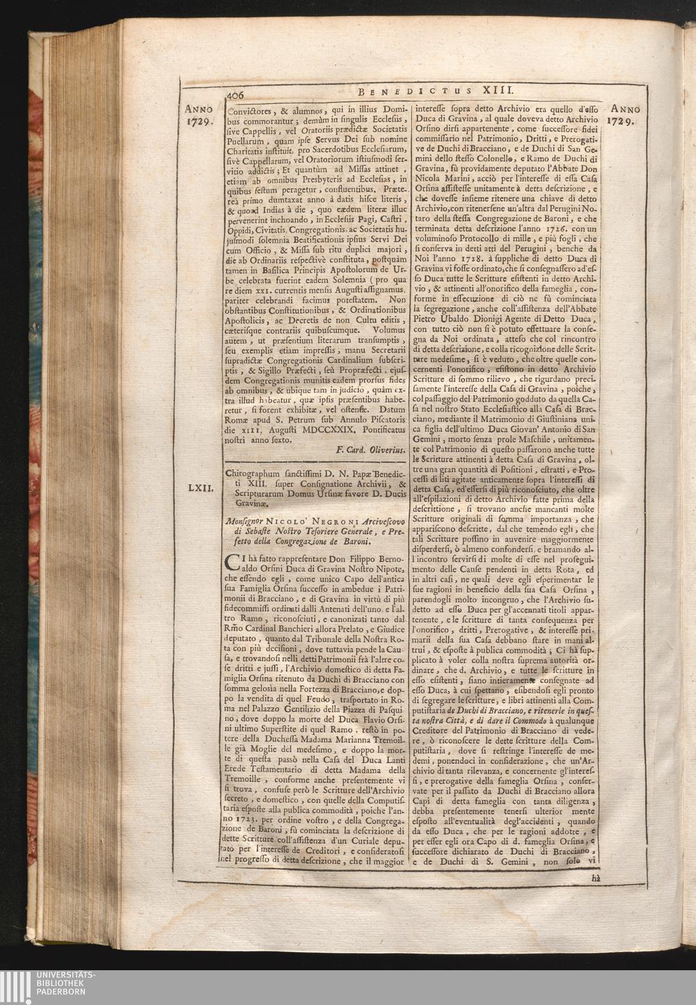 62. Ci hà fatto &c. Chirographum sanctissimi D.N. Papæ Benedicti XIII. super consignatione[...]