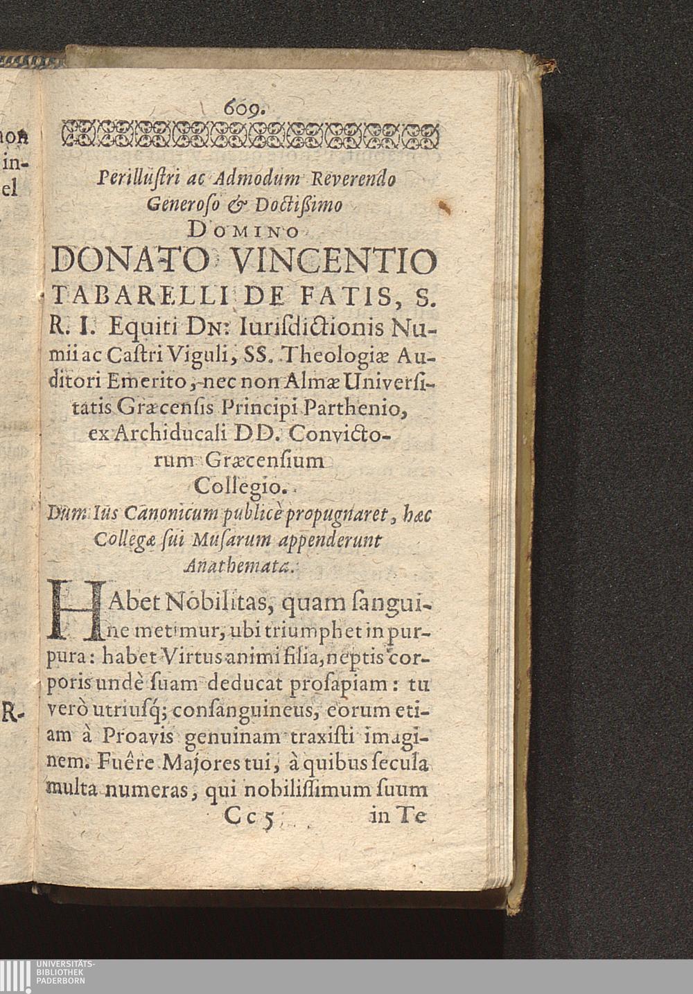 Tractatio Synoptica De Ivdiciis Ad Lib: II. Decretal: Gregorii IX. : Multorum cùm in Foro, tùm Academijs agentium, inprimis verò peregrè abeuntium desiderijs expetita ; Indice cum gemino, uno Capitum, Titulorum & Materiarum, altero Verborum notabilium / Quam antehâc Sub Praesidio R. P. Ferdinandi ab Herberstein è Soc: Iesu SS: Theol: Doctore, & in almâ Vniversitate Graecensi Publico Iuris Canonici Professore: Disquisitioni publicae exposuit Donatus Vincentius Tabarelli De Fatis, S. R. I. Eques, Dn: Jurisdictionis Numii, ac Castri Viguli, SS. Theol: Auditor emeritus, nec non eiusdem Universitatis Princeps Parthenius