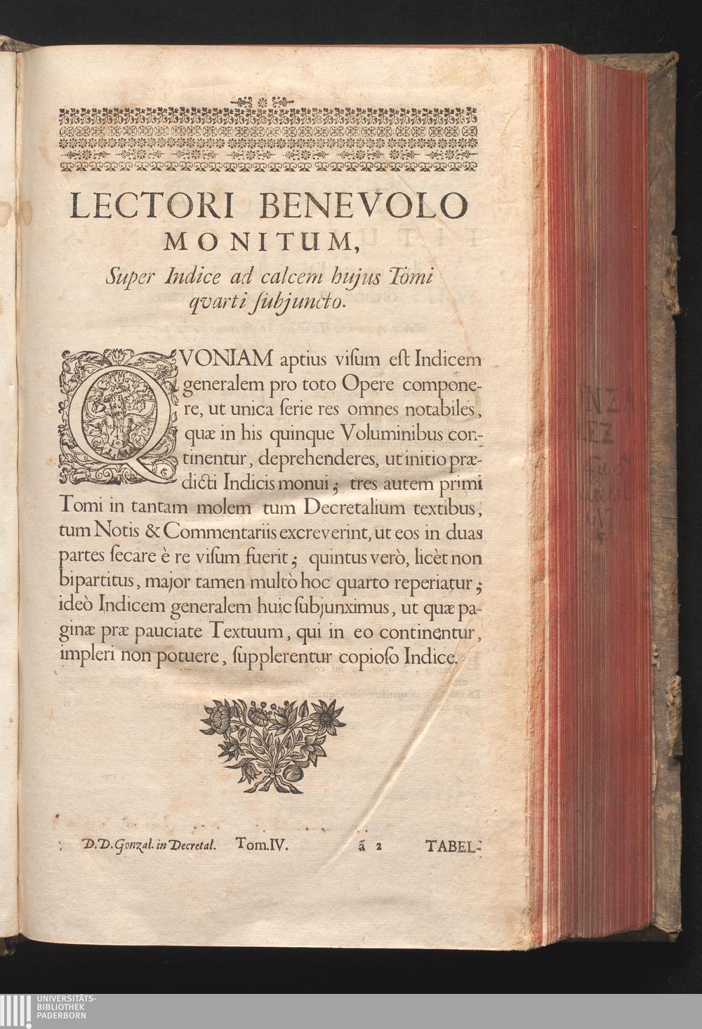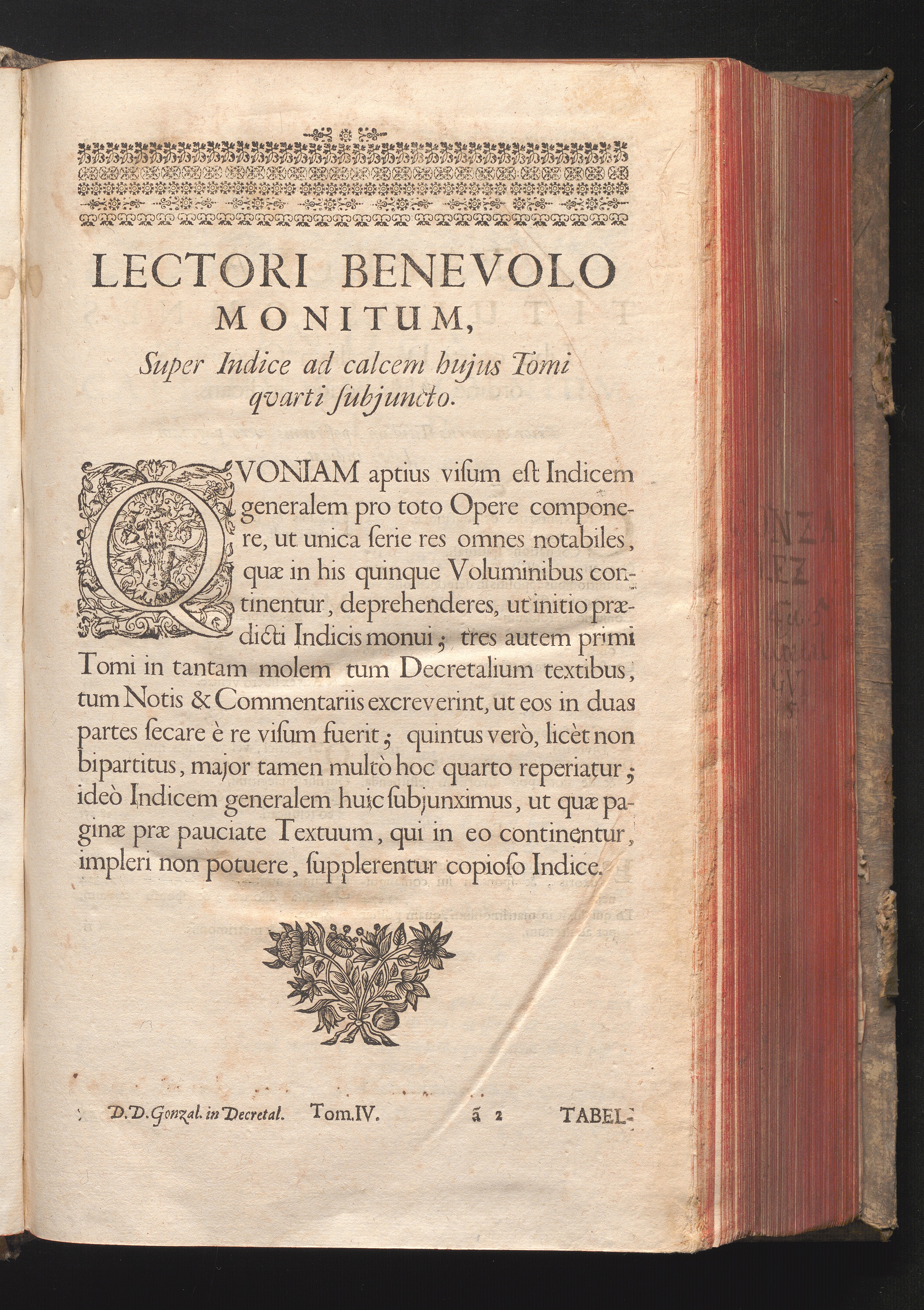 Lectori Benevolo Monitum, Super Indice ad calcem hujus Tomi qvarti subjuncto.