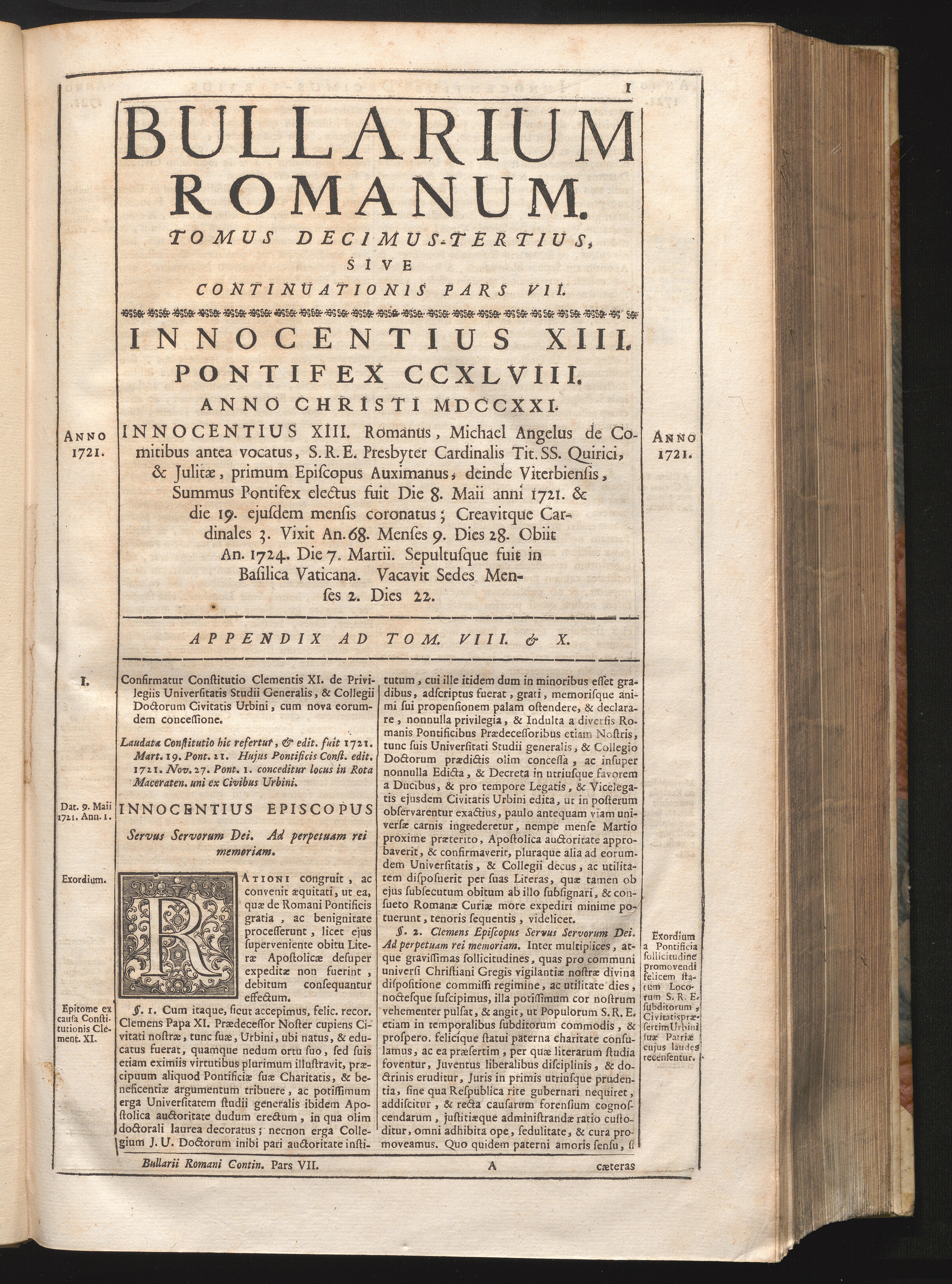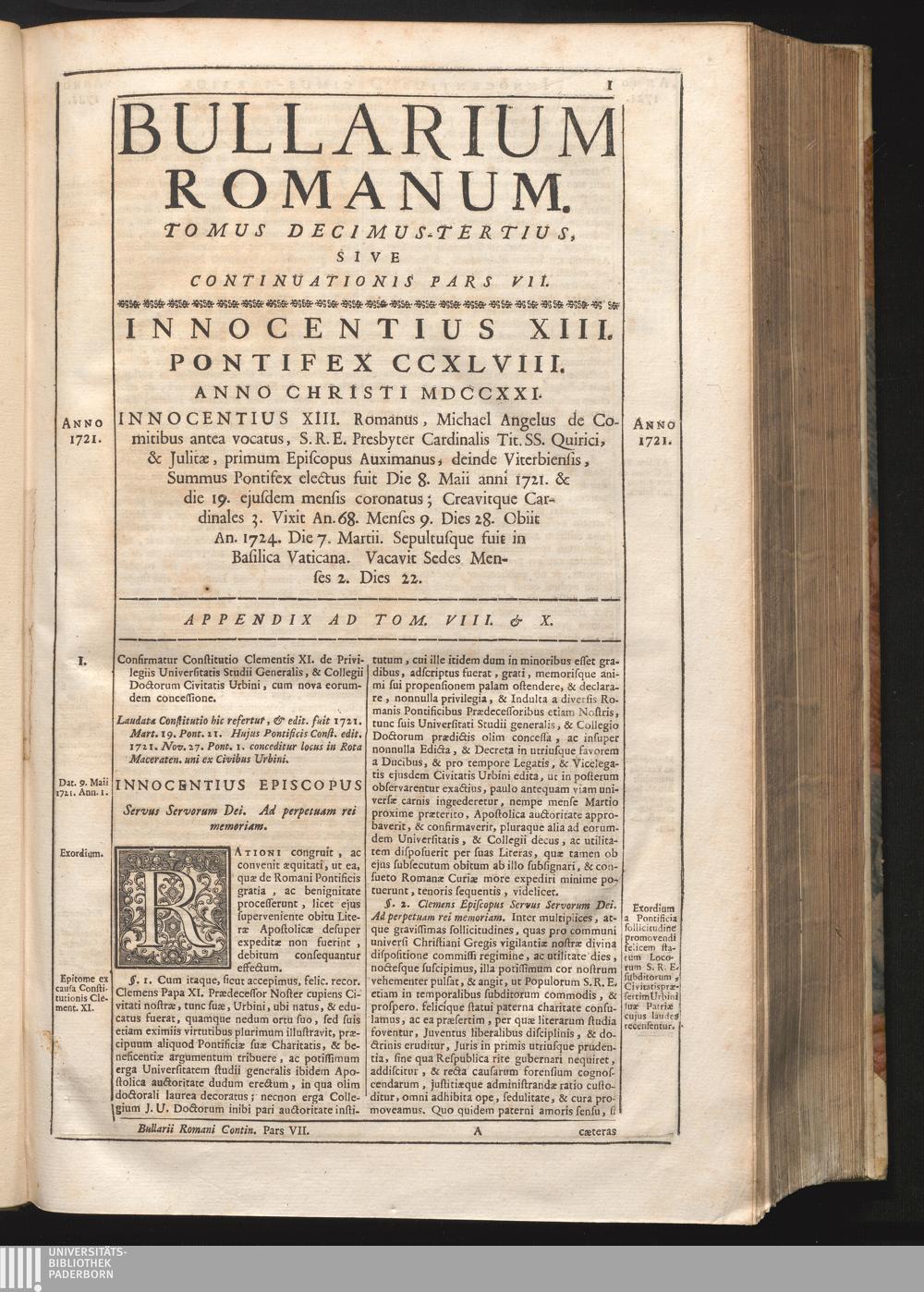 Tomus Decimus-Tertius = Continuationis Pars VII (1740) Complectens Constitutiones ab Innocentio XIII. & Benedicto XIII. editas