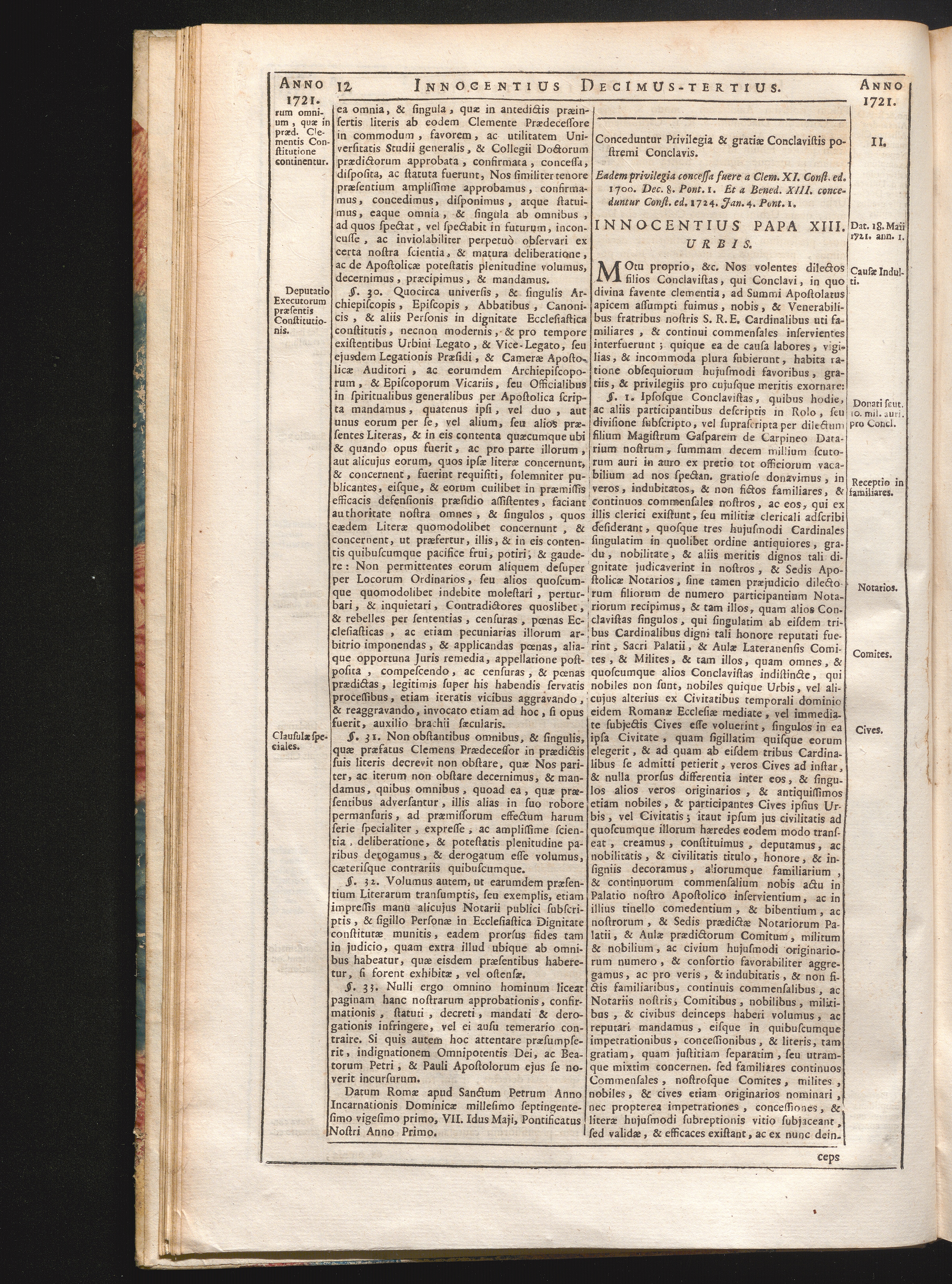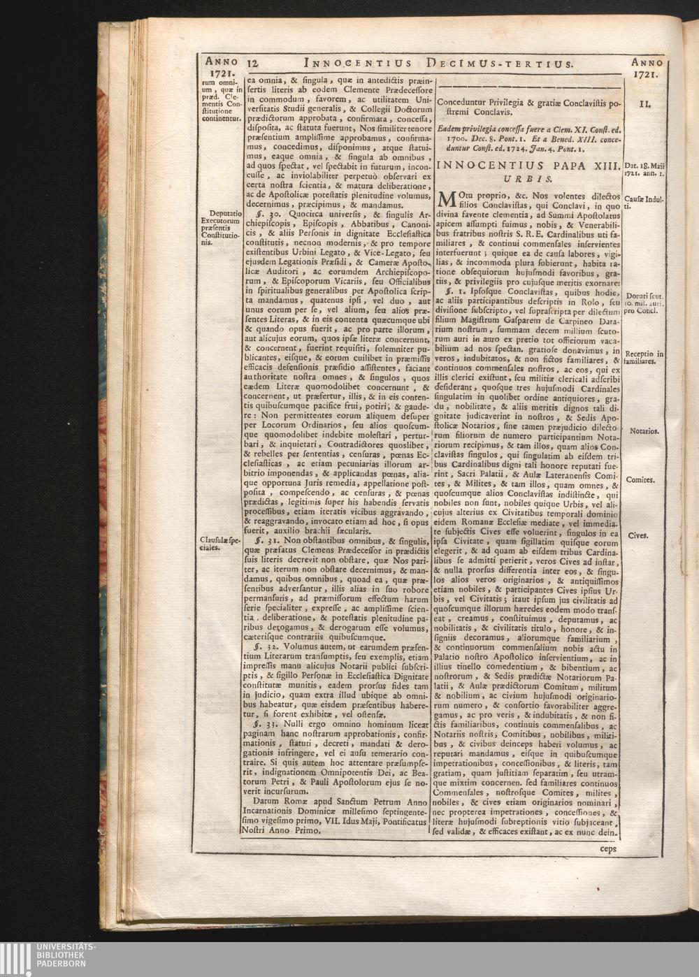 Tomus Decimus-Tertius = Continuationis Pars VII (1740) Complectens Constitutiones ab Innocentio XIII. & Benedicto XIII. editas