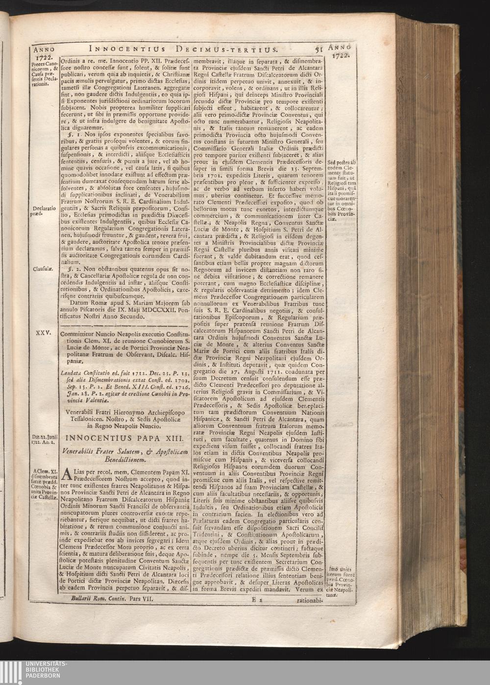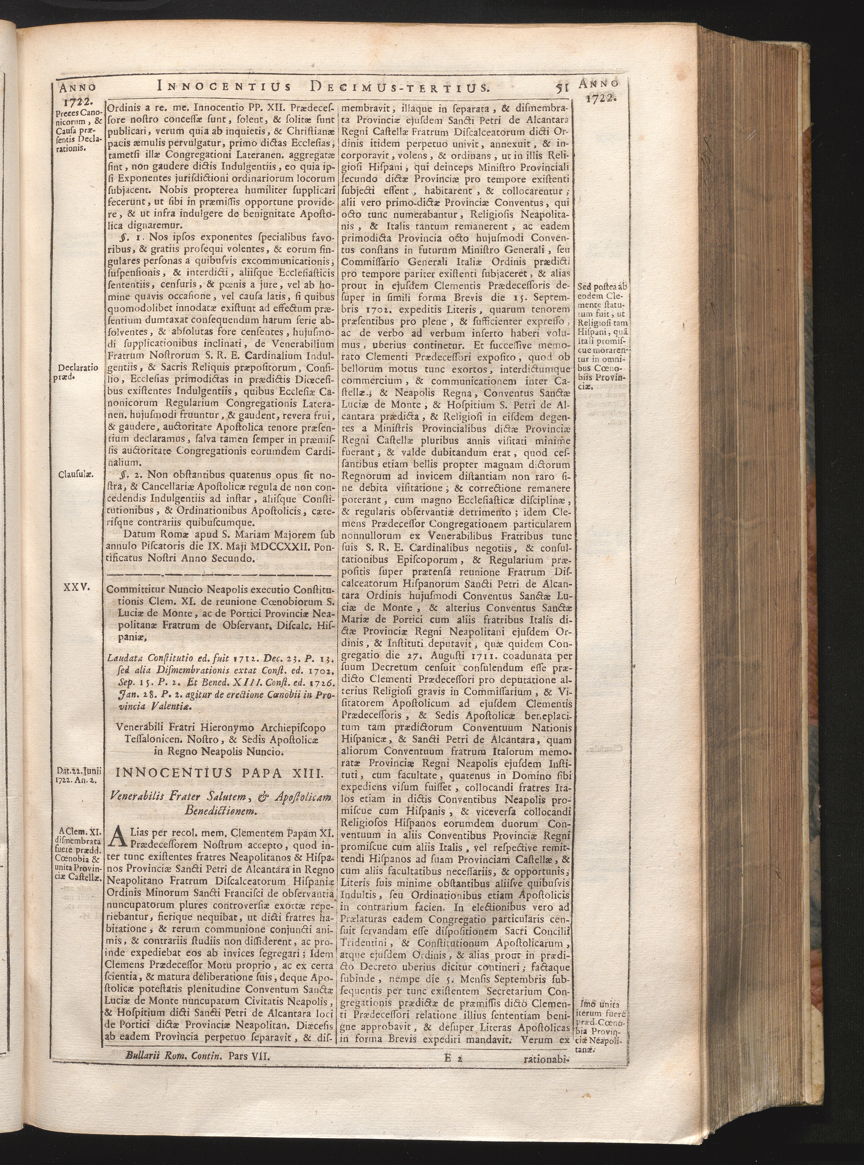 Tomus Decimus-Tertius = Continuationis Pars VII (1740) Complectens Constitutiones ab Innocentio XIII. & Benedicto XIII. editas