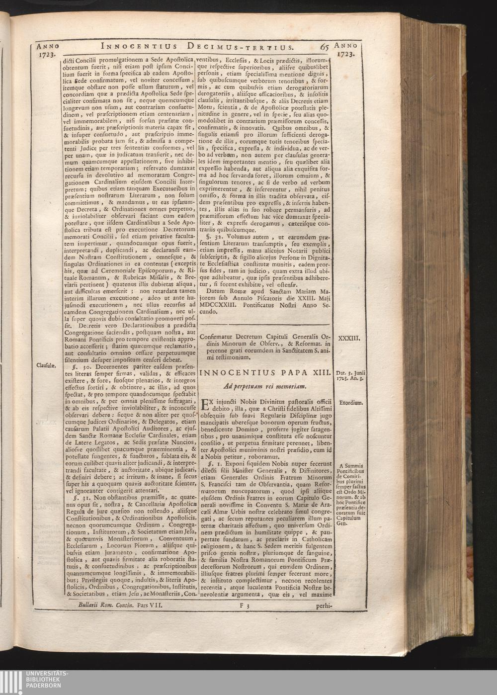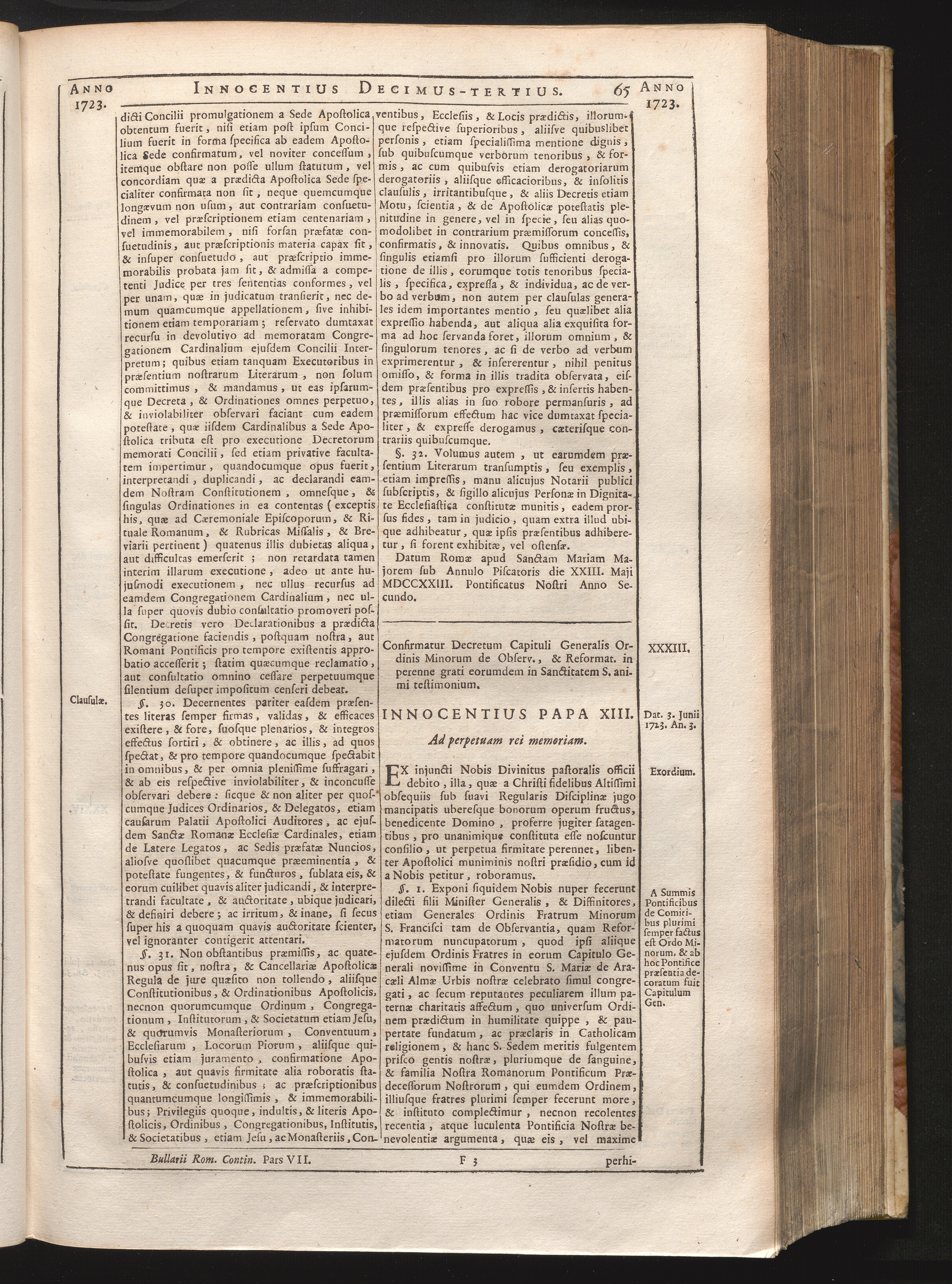Tomus Decimus-Tertius = Continuationis Pars VII (1740) Complectens Constitutiones ab Innocentio XIII. & Benedicto XIII. editas