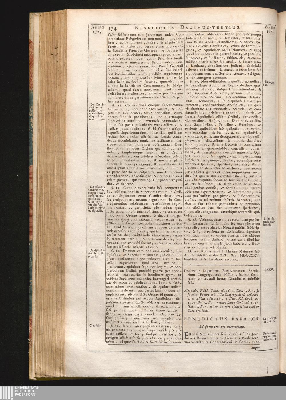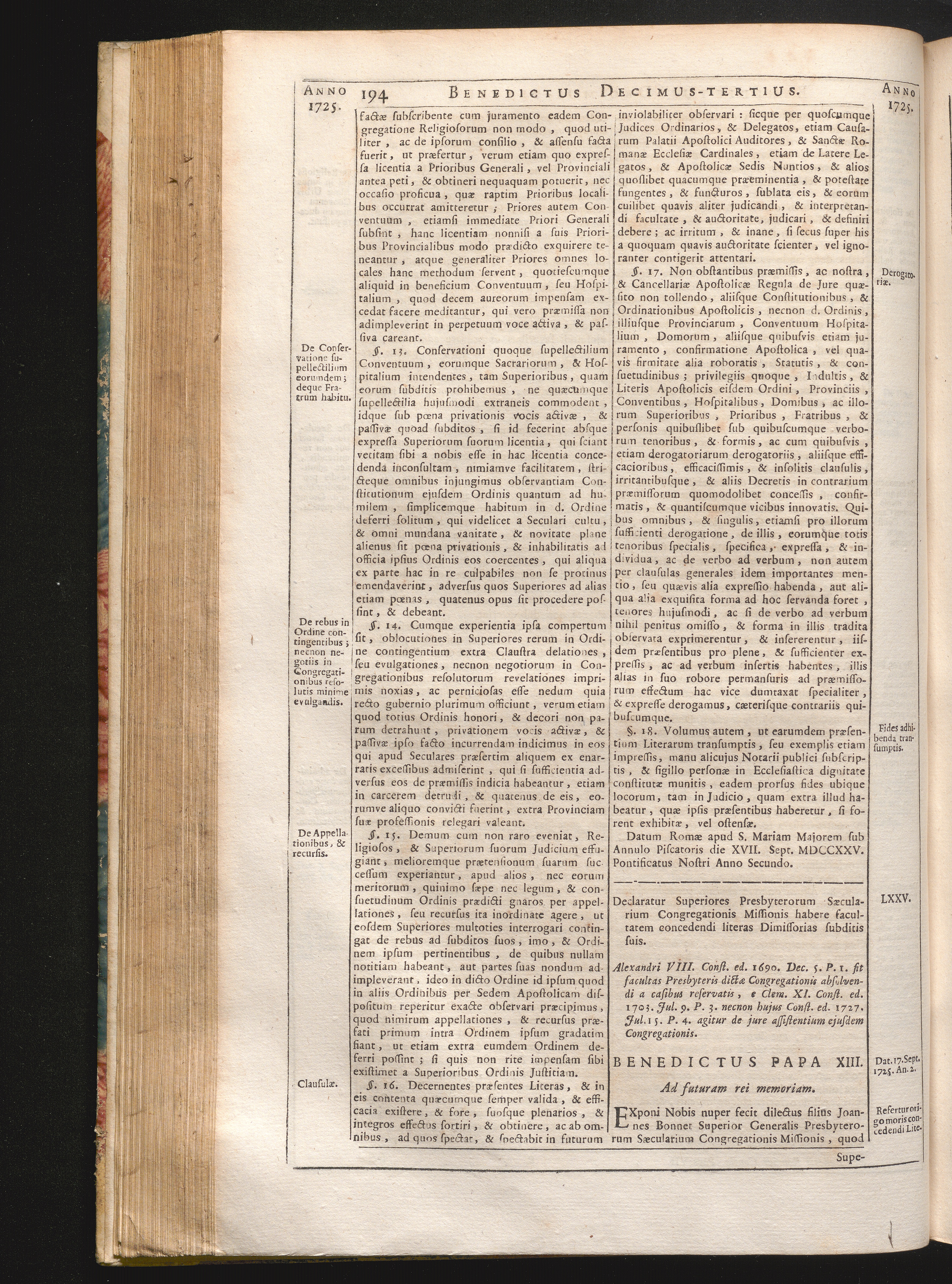 Tomus Decimus-Tertius = Continuationis Pars VII (1740) Complectens Constitutiones ab Innocentio XIII. & Benedicto XIII. editas