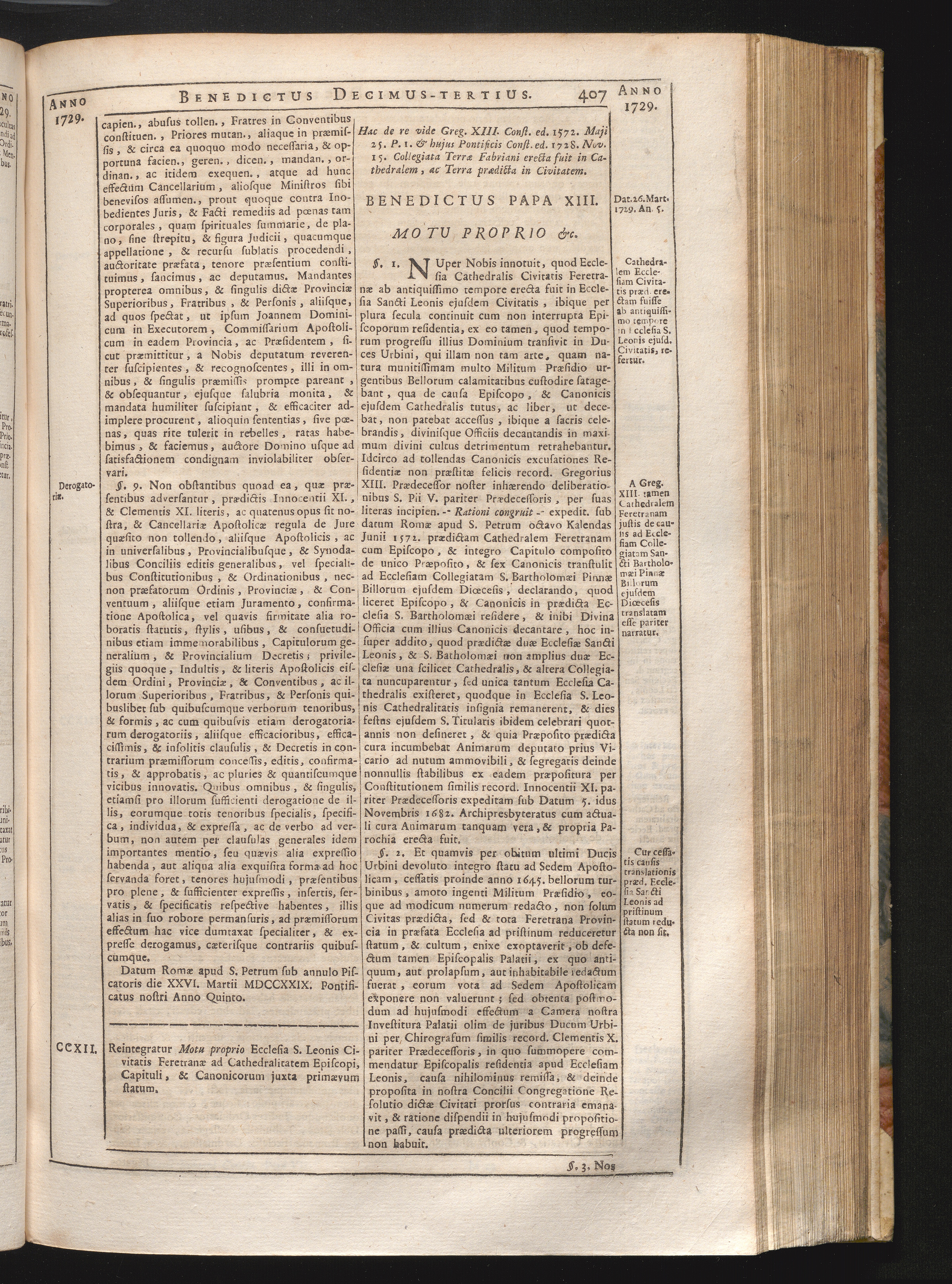 CCXII. De reintegratione Eccl. S. Leonis Civ. Feretranæ juxta primævum statum.