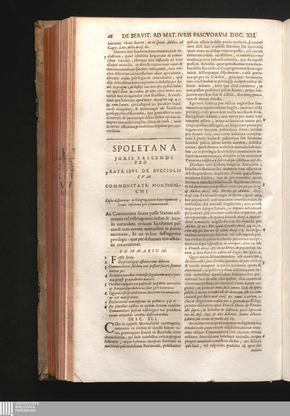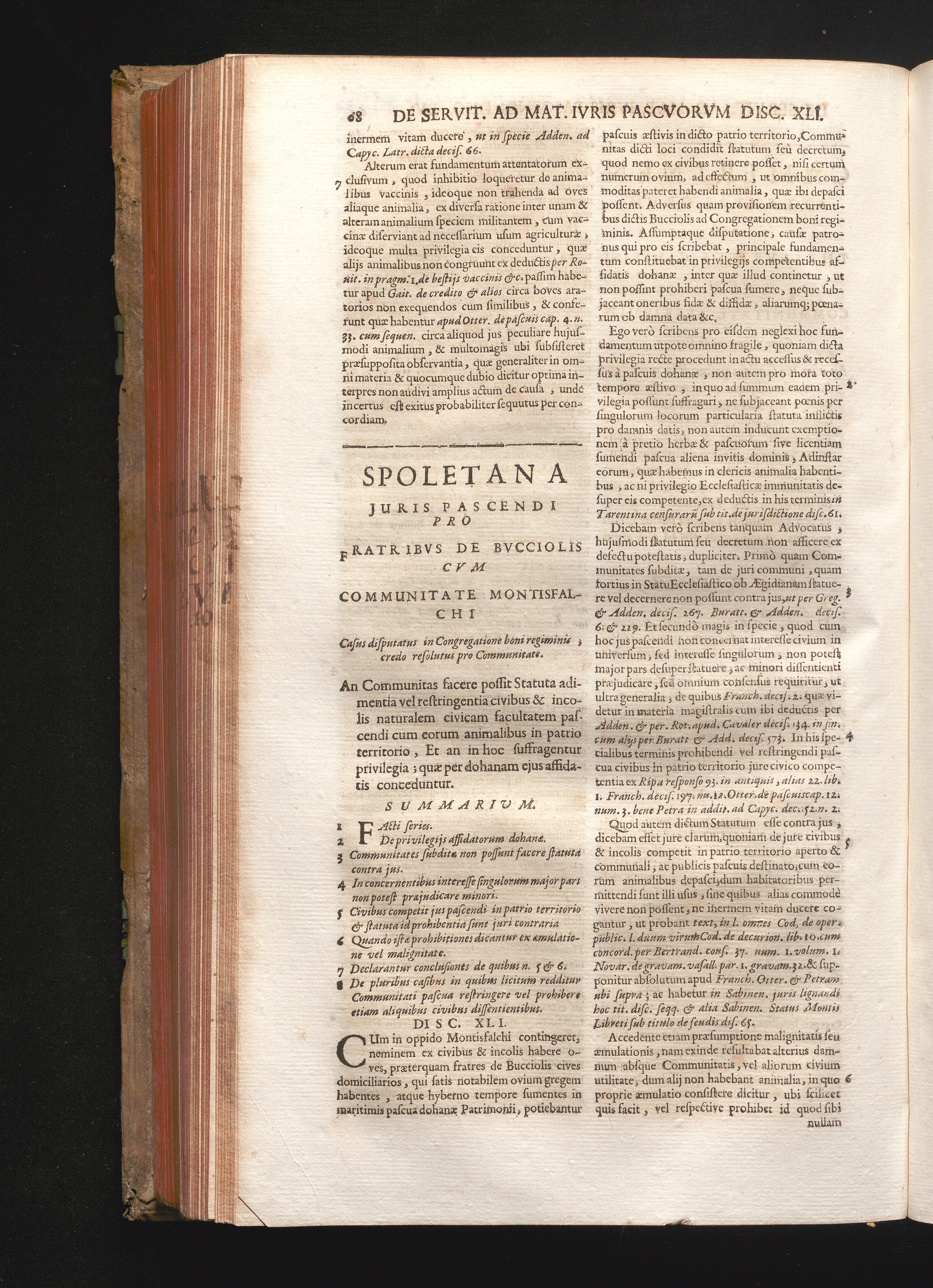 Disc. XLI. Spoletana juris pascendi. An Communitas facere possit Statuta adimenta[...]