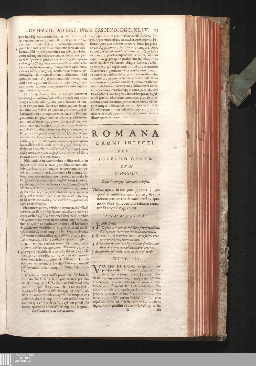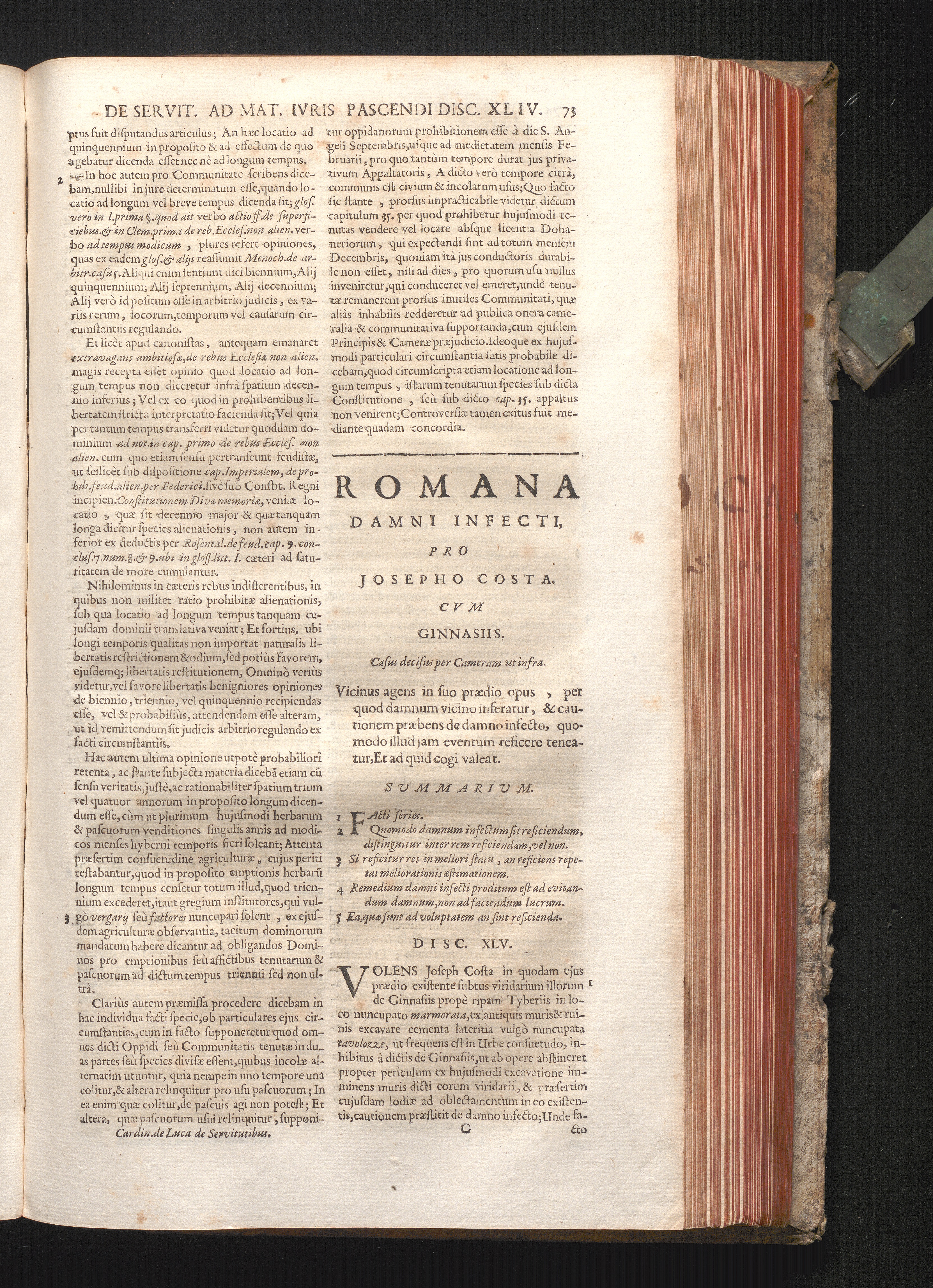 Disc. XLV. Romana damni infecti. Vicinus agens in suo prædio opus, per quod damnum[...]