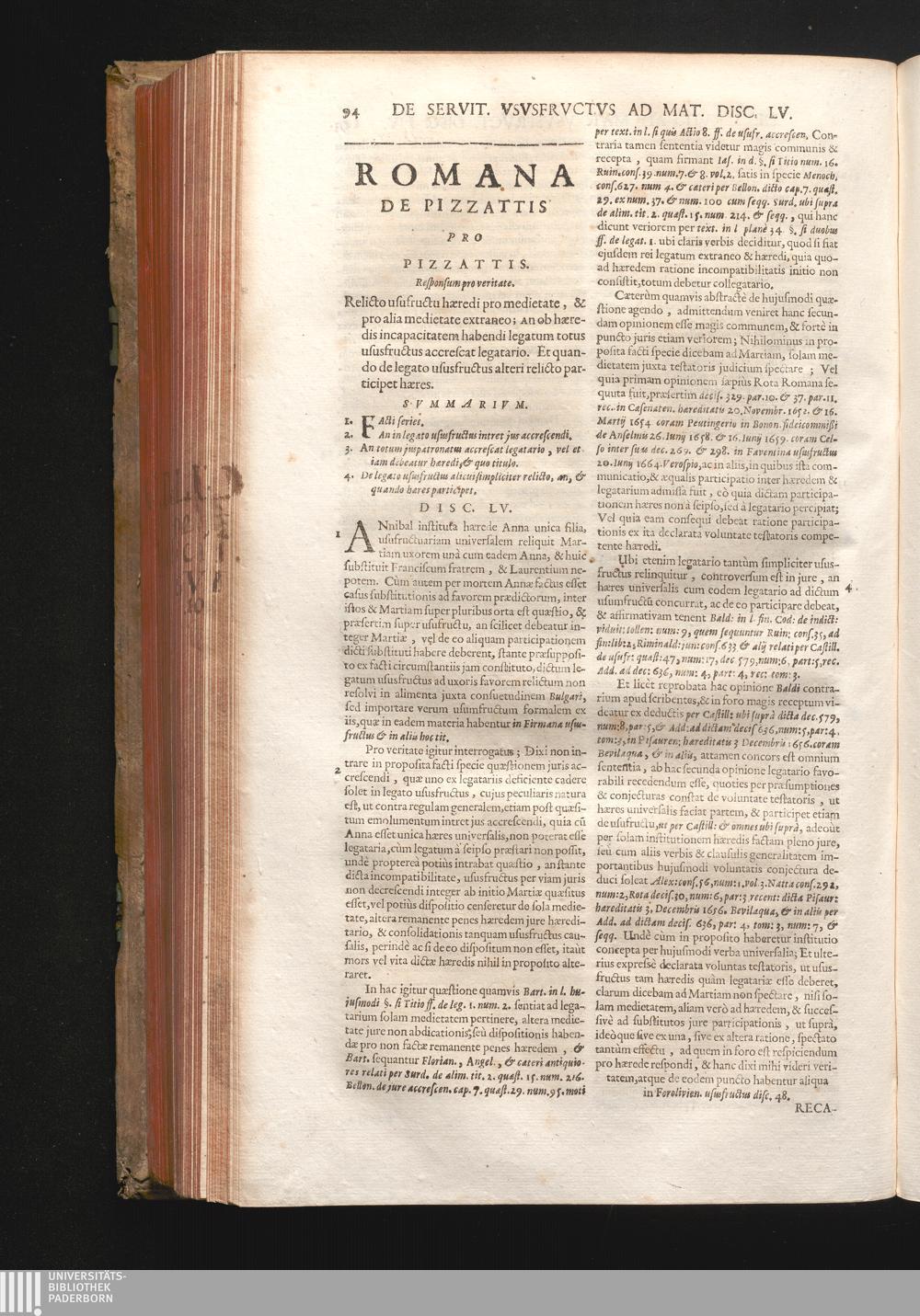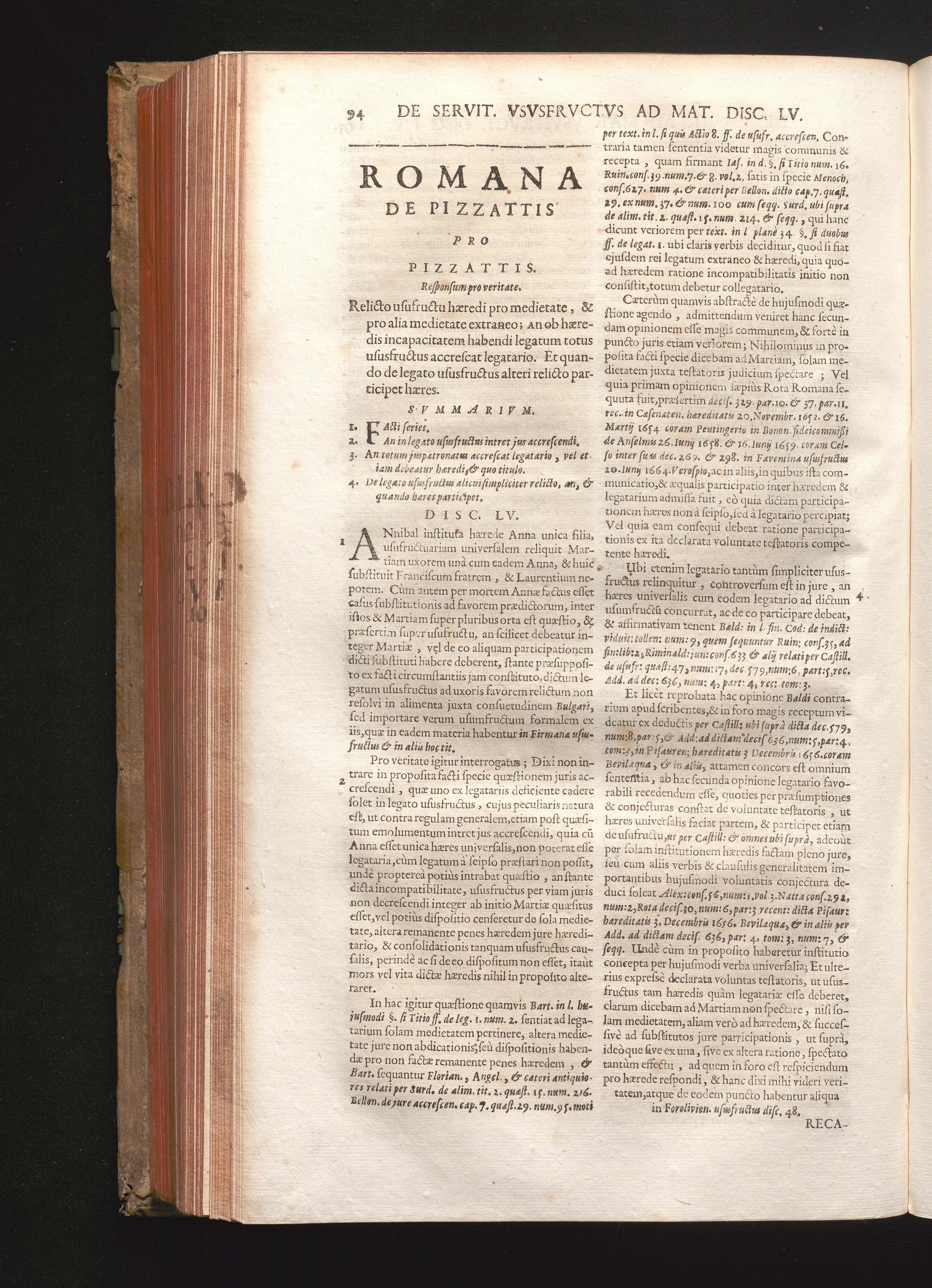 Disc. LV. Romana de Pizzattis. Relicto usufructu hæredi pro medietate, & pro alia[...]