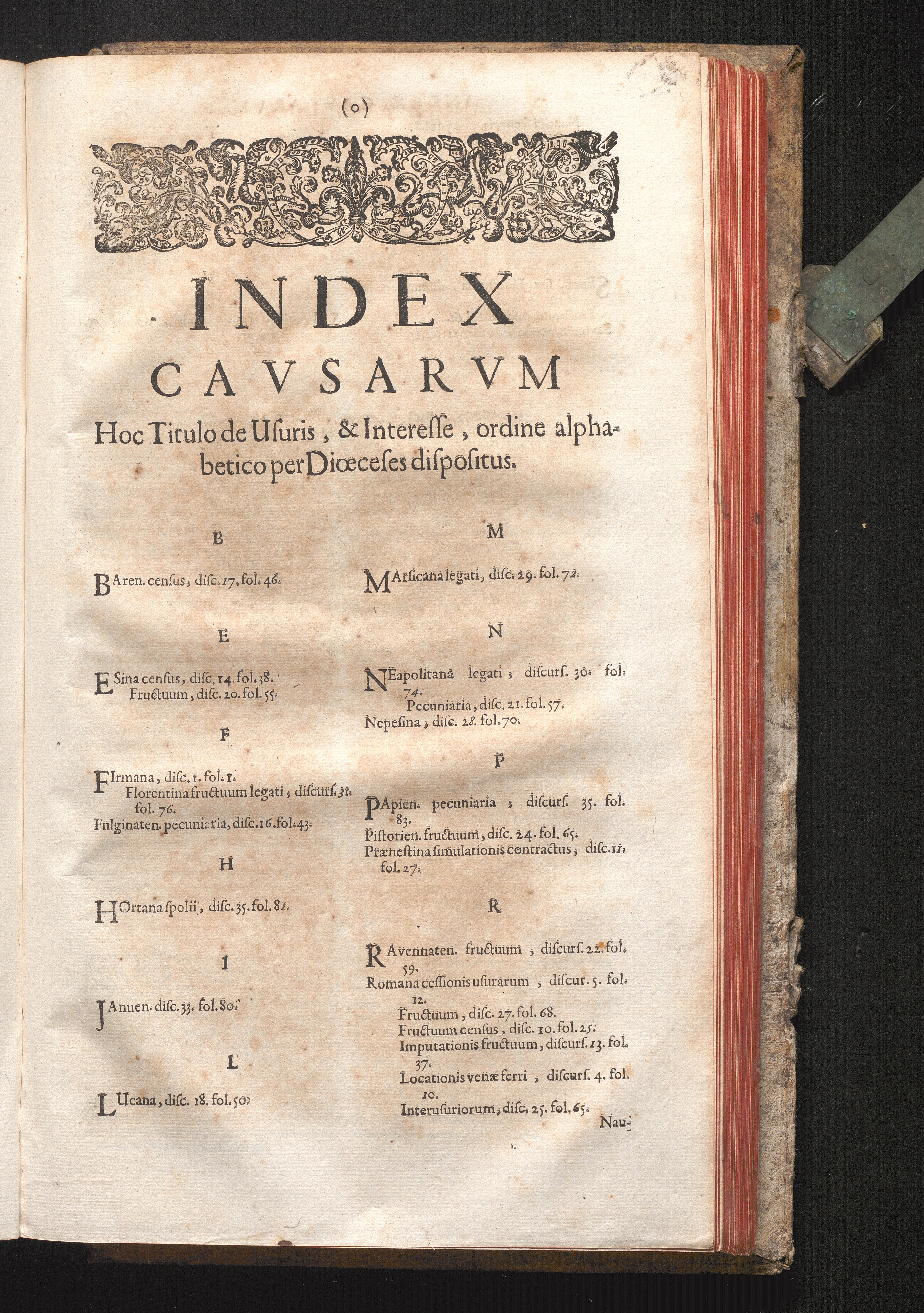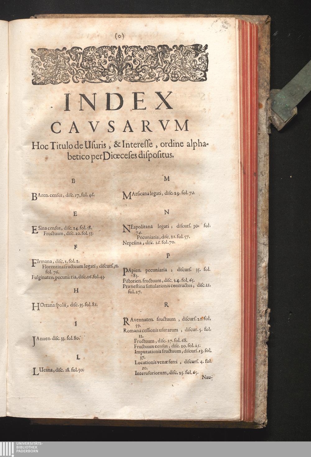 Index Cavsarvm Hoc Titulo de Usuris, & Interesse, ordine alphabetico per Diœceses[...]