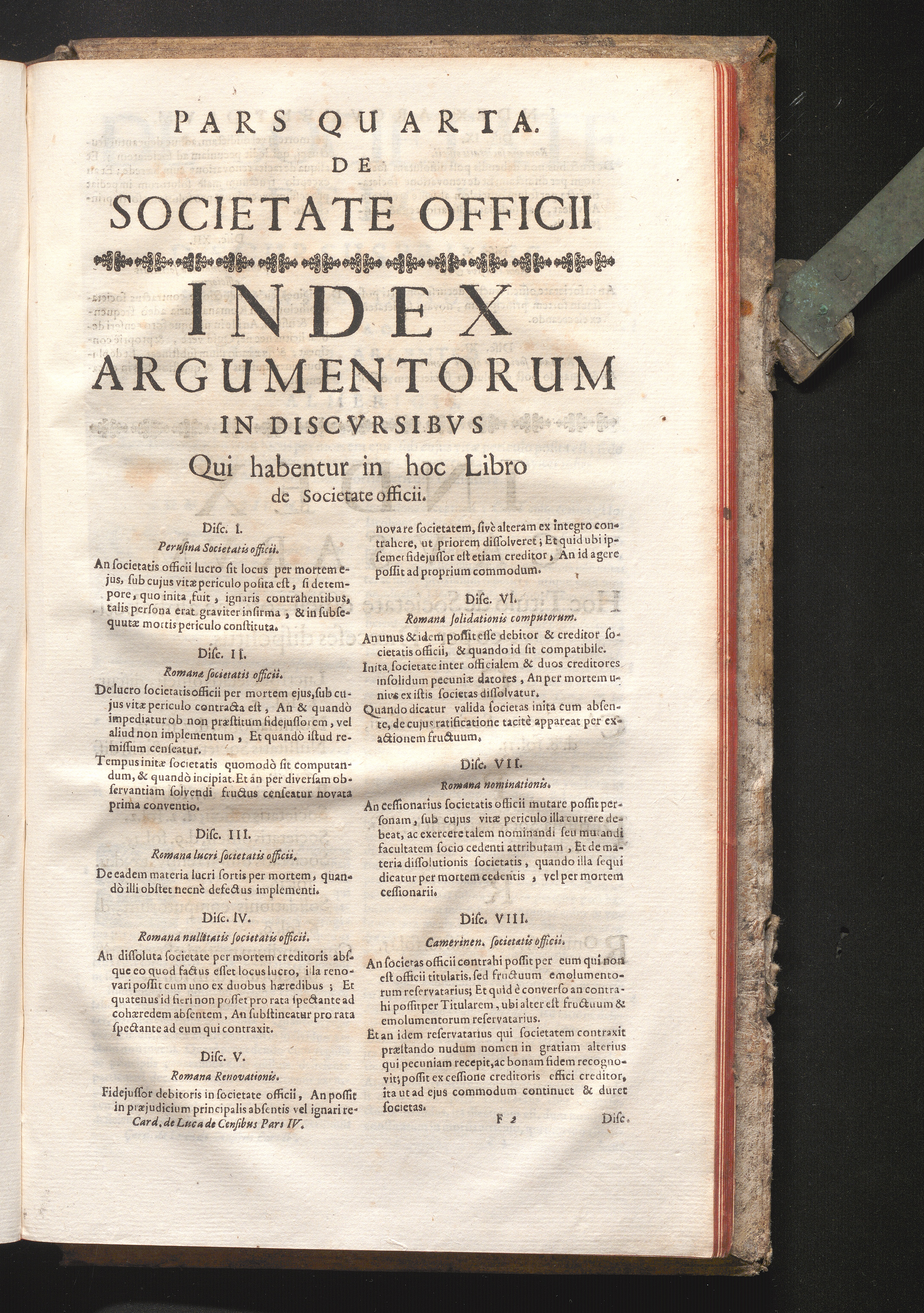 Tomus III. Tractatvs Qvarti (1691) Tractatus Primi Pars I. de Usuris, & interesse, Pars II. de Cambiis, Pars III. de Censibus, Pars IV. de Societatibus Officiorum