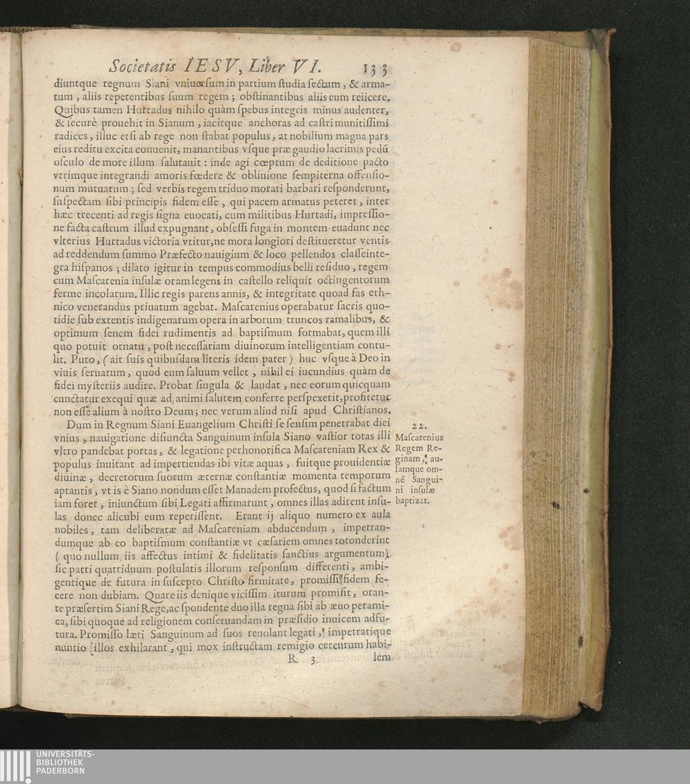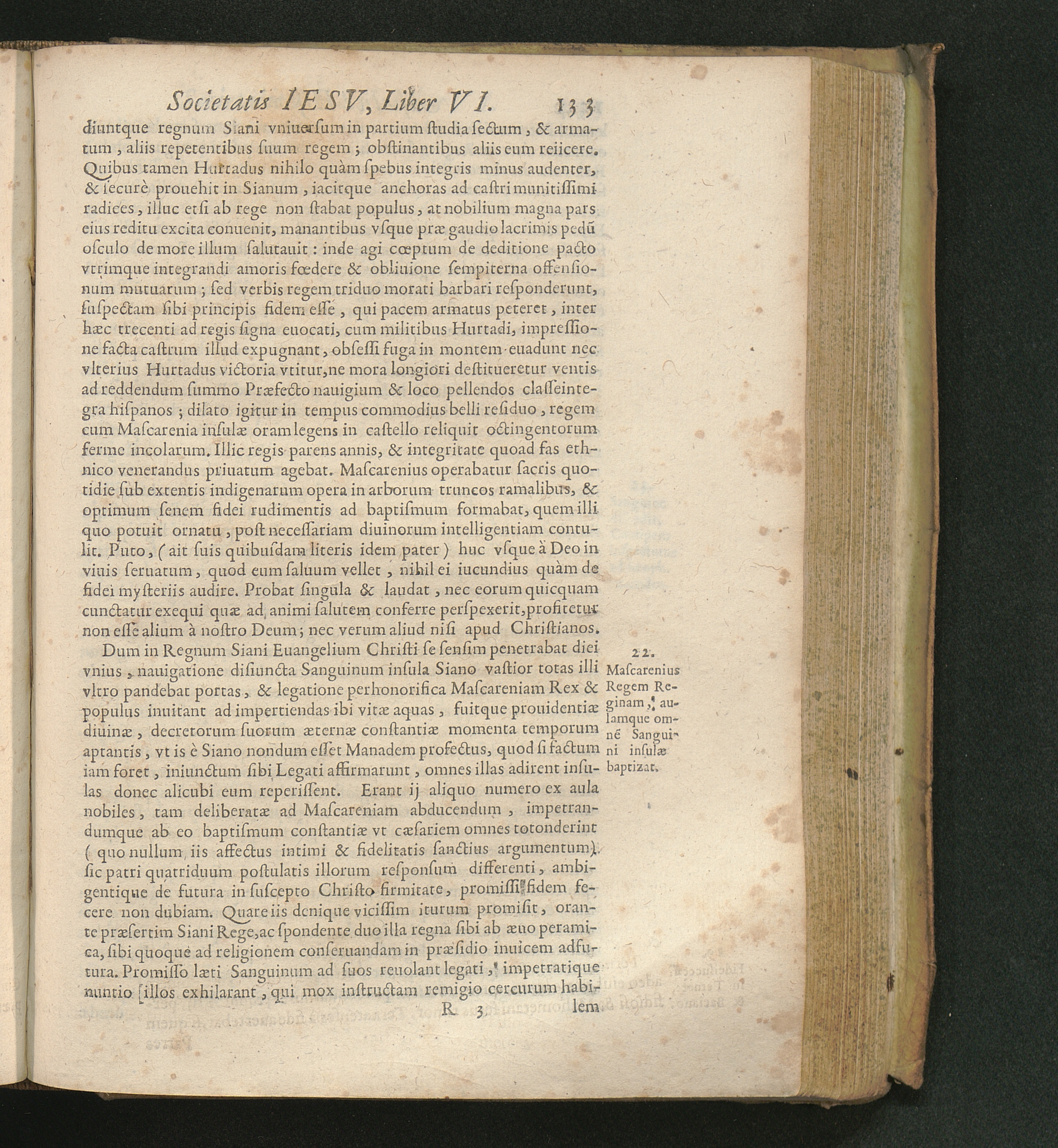 22. Mascarenius Regem Reginam, aulamque omne[m] Sanguini insulæ baptizat.