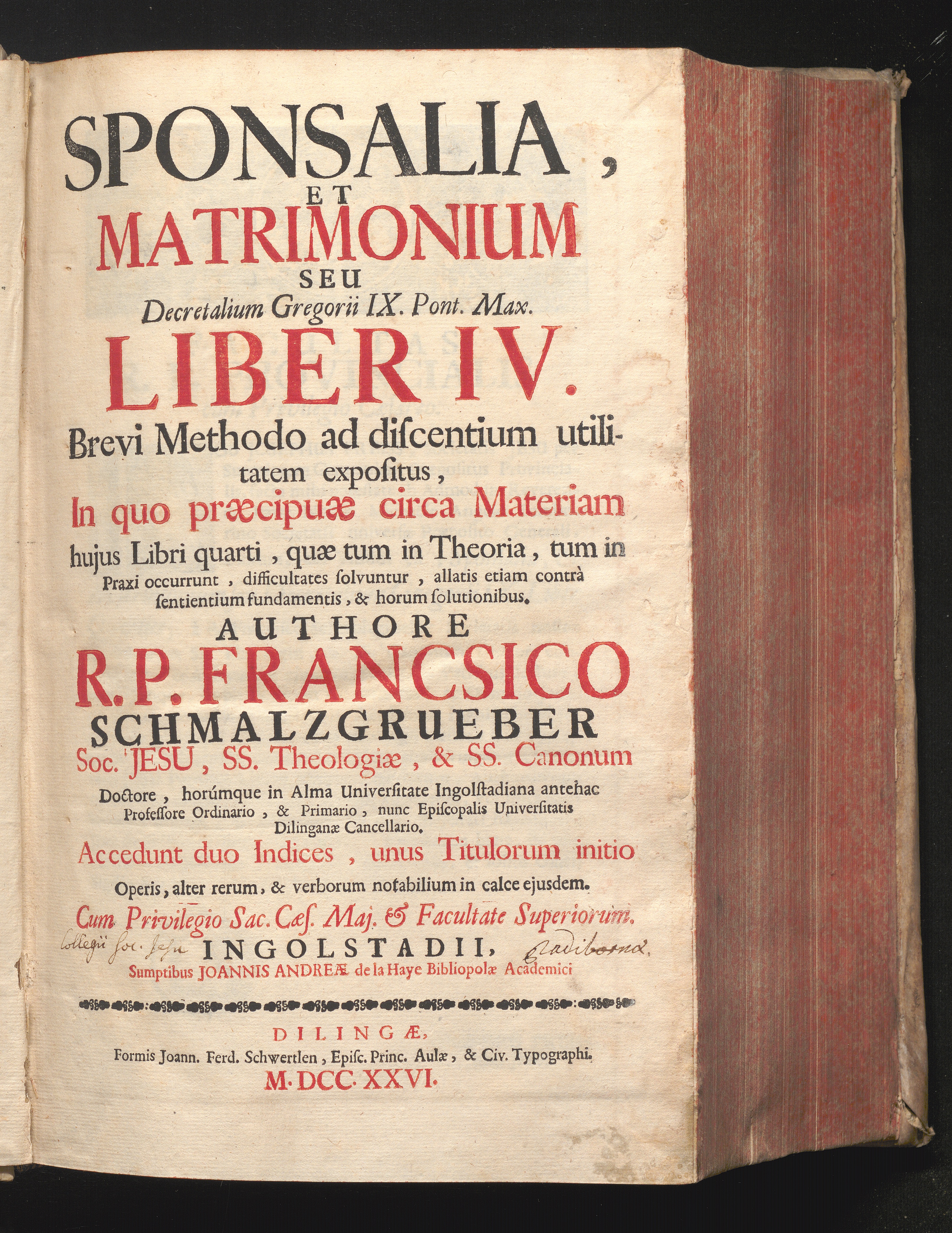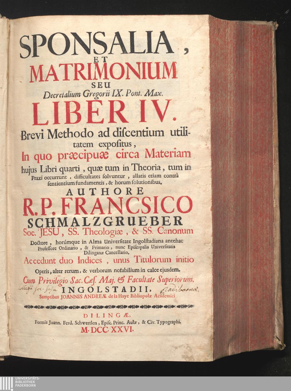 Sponsalia Et Matrimonium : Seu Decretalium Gregorii IX. Pont. Max. Liber IV. ; Brevi Methodo ad discentium utilitatem expositus ... / Authore R. P. Francisco Schmalzgrueber , Soc. Jesu, SS. Theologiæ, & SS. Canonum Doctore, horúmque in Alma Universitate Ingolstadiana antehac Professore Ordinario, & Primario, nunc Episcopalis Universitatis Dilinganæ Cancellario