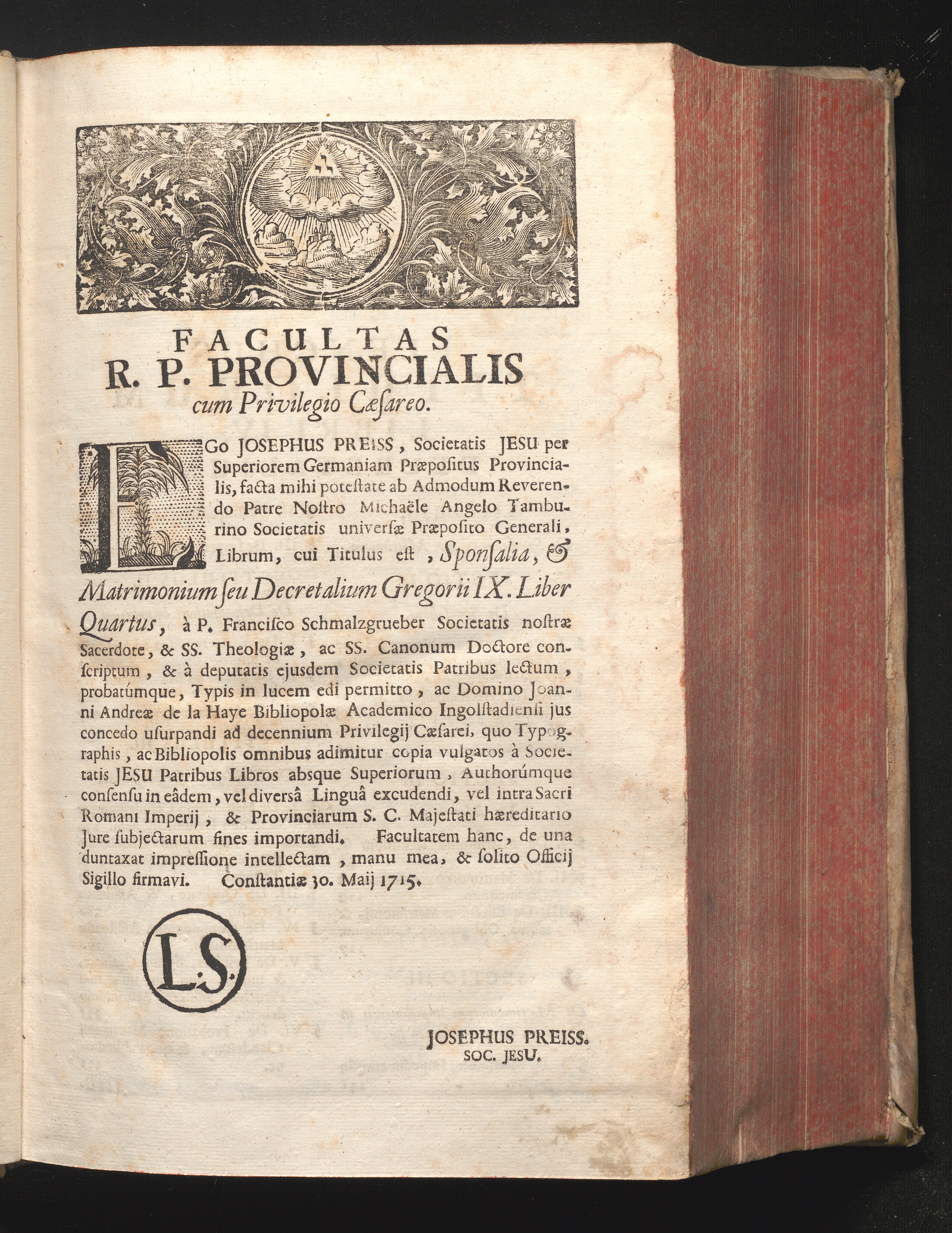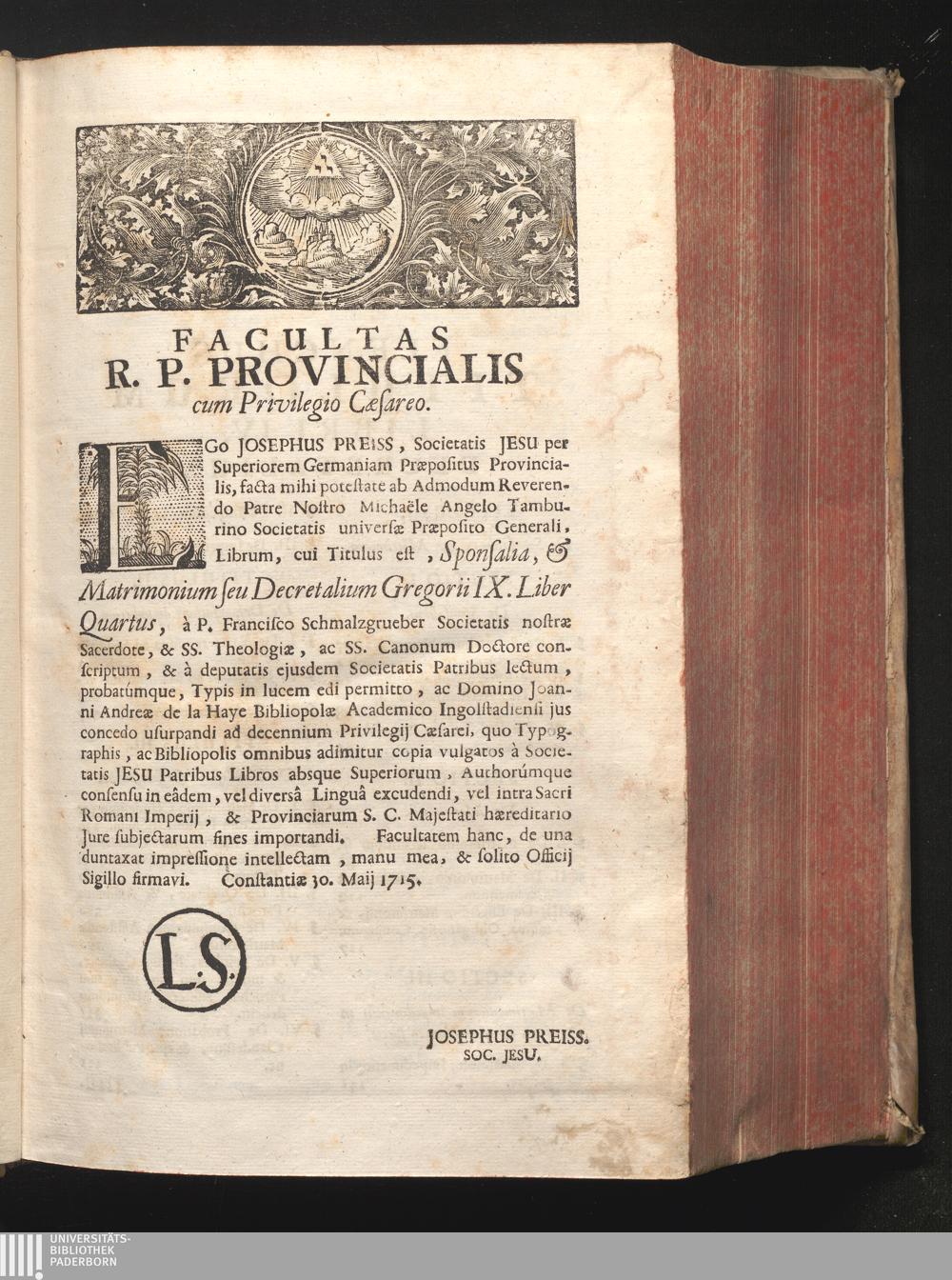 Sponsalia Et Matrimonium : Seu Decretalium Gregorii IX. Pont. Max. Liber IV. ; Brevi Methodo ad discentium utilitatem expositus ... / Authore R. P. Francisco Schmalzgrueber , Soc. Jesu, SS. Theologiæ, & SS. Canonum Doctore, horúmque in Alma Universitate Ingolstadiana antehac Professore Ordinario, & Primario, nunc Episcopalis Universitatis Dilinganæ Cancellario