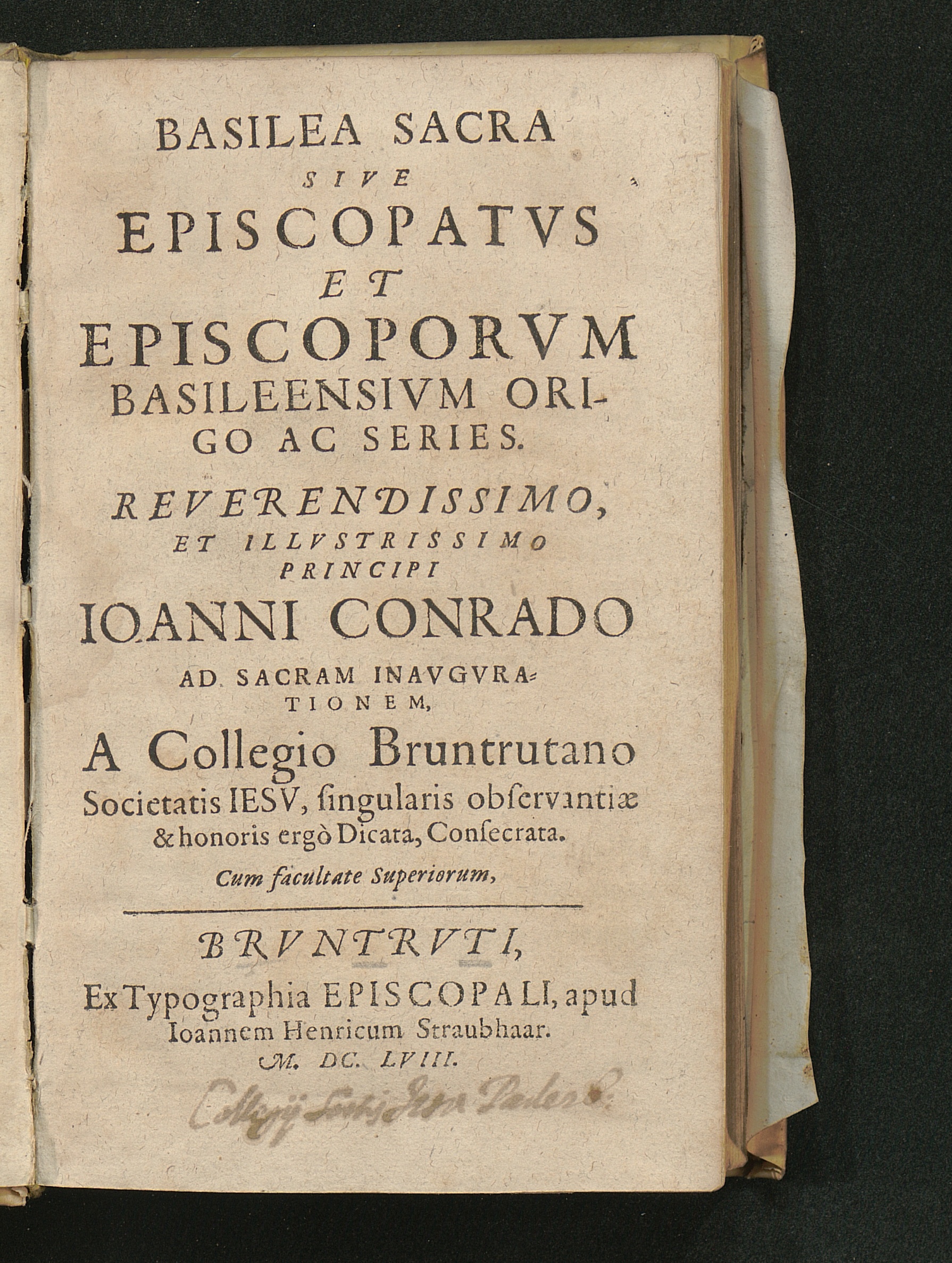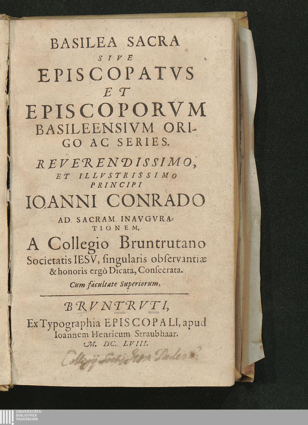Basilea Sacra Sive Episcopatvs Et Episcoporvm Basileensivm Origo Ac Series : Reverendissimo, Et Illvstrissimo Principi Ioanni Conrado Ad Sacram Inavgvrationem, A Collegio Bruntrutano Societatis Iesv, singularis observantiae & honoris ergò Dicata, Consecrata / [Claudius Sudan]