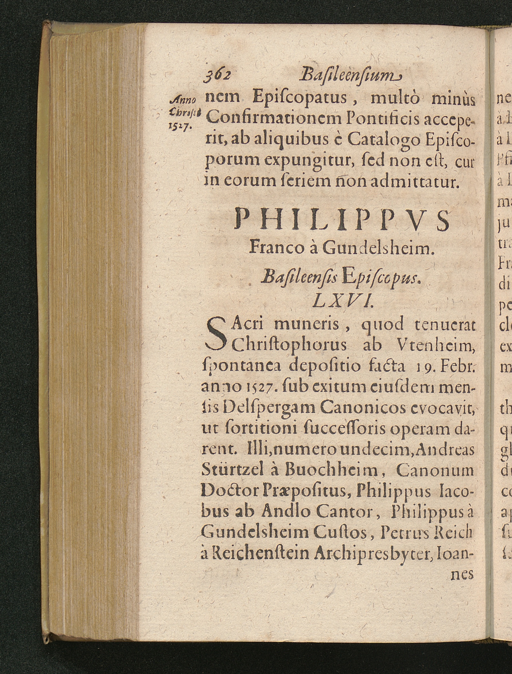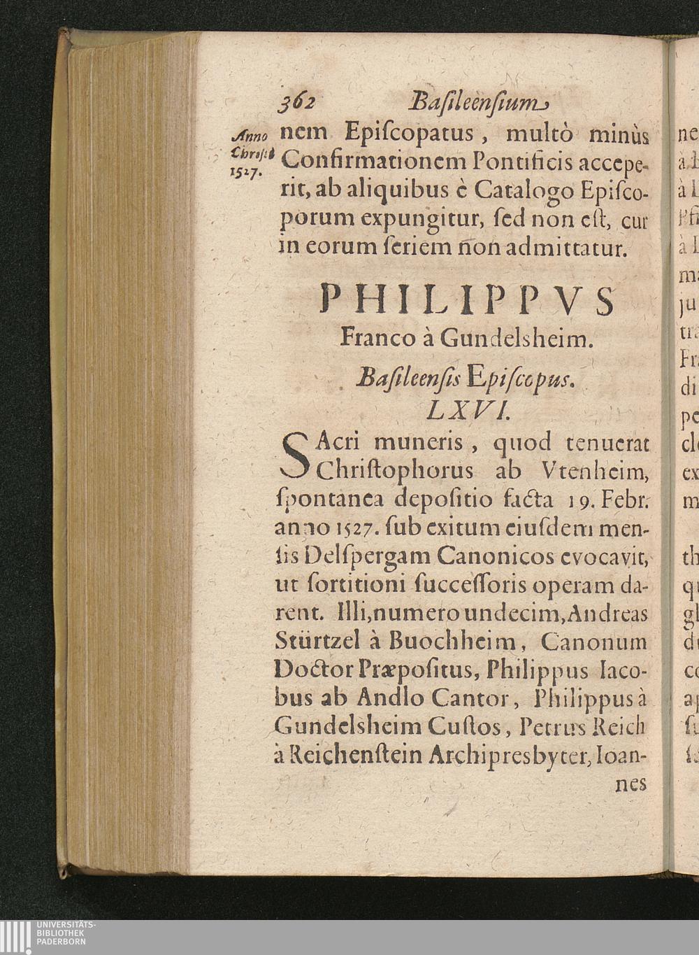 Basilea Sacra Sive Episcopatvs Et Episcoporvm Basileensivm Origo Ac Series : Reverendissimo, Et Illvstrissimo Principi Ioanni Conrado Ad Sacram Inavgvrationem, A Collegio Bruntrutano Societatis Iesv, singularis observantiae & honoris ergò Dicata, Consecrata / [Claudius Sudan]