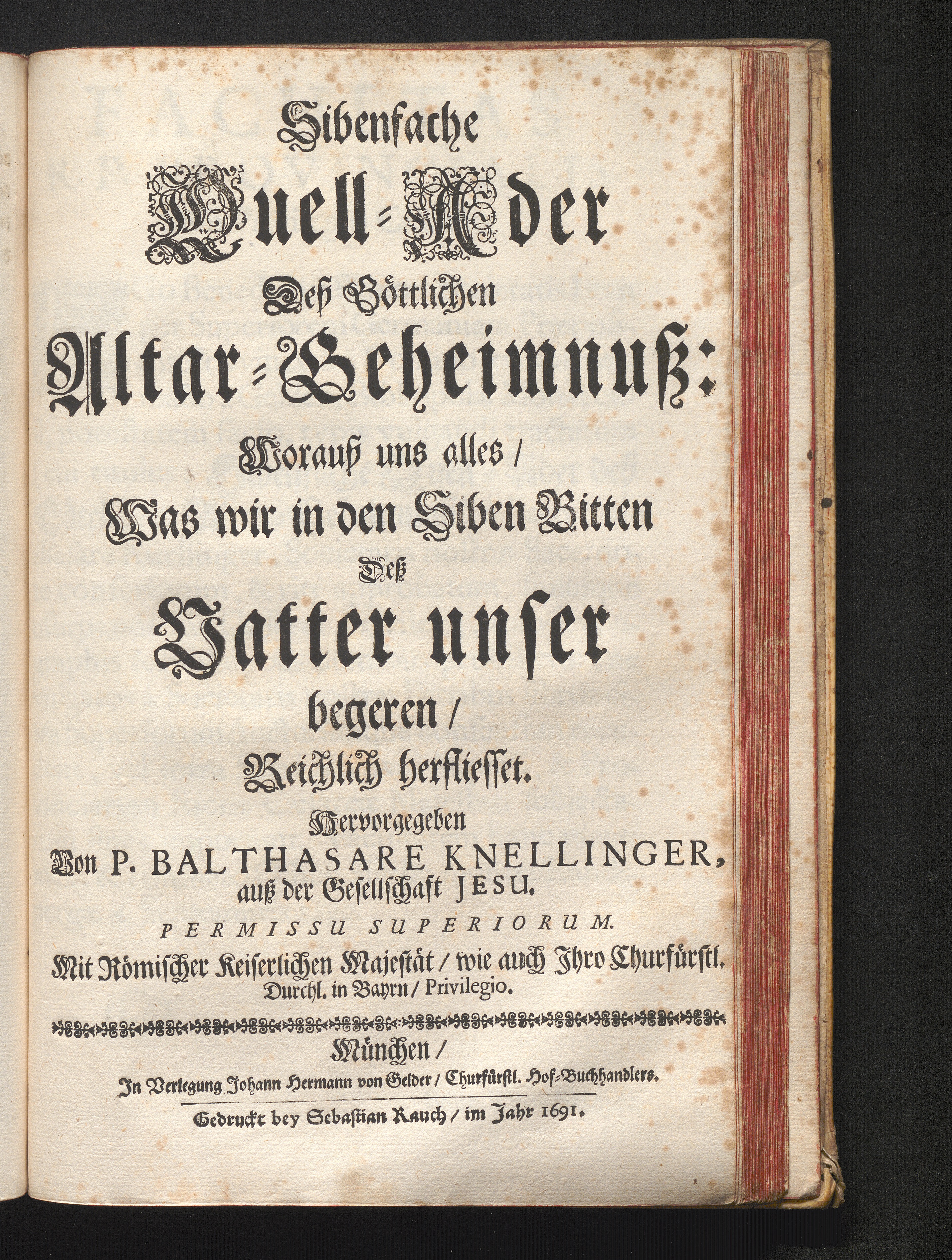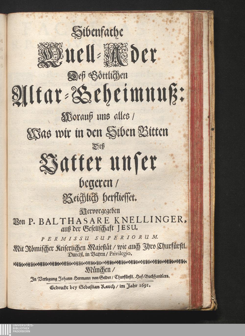 Erster Jahr-Gang (1691) Sibenfache Quell-Ader Deß Göttlichen Altar-Geheimnuß: Worauß uns alles/ Was wir in den Siben Bitten Deß Vatter unser begeren/ Reichlich herfliesset