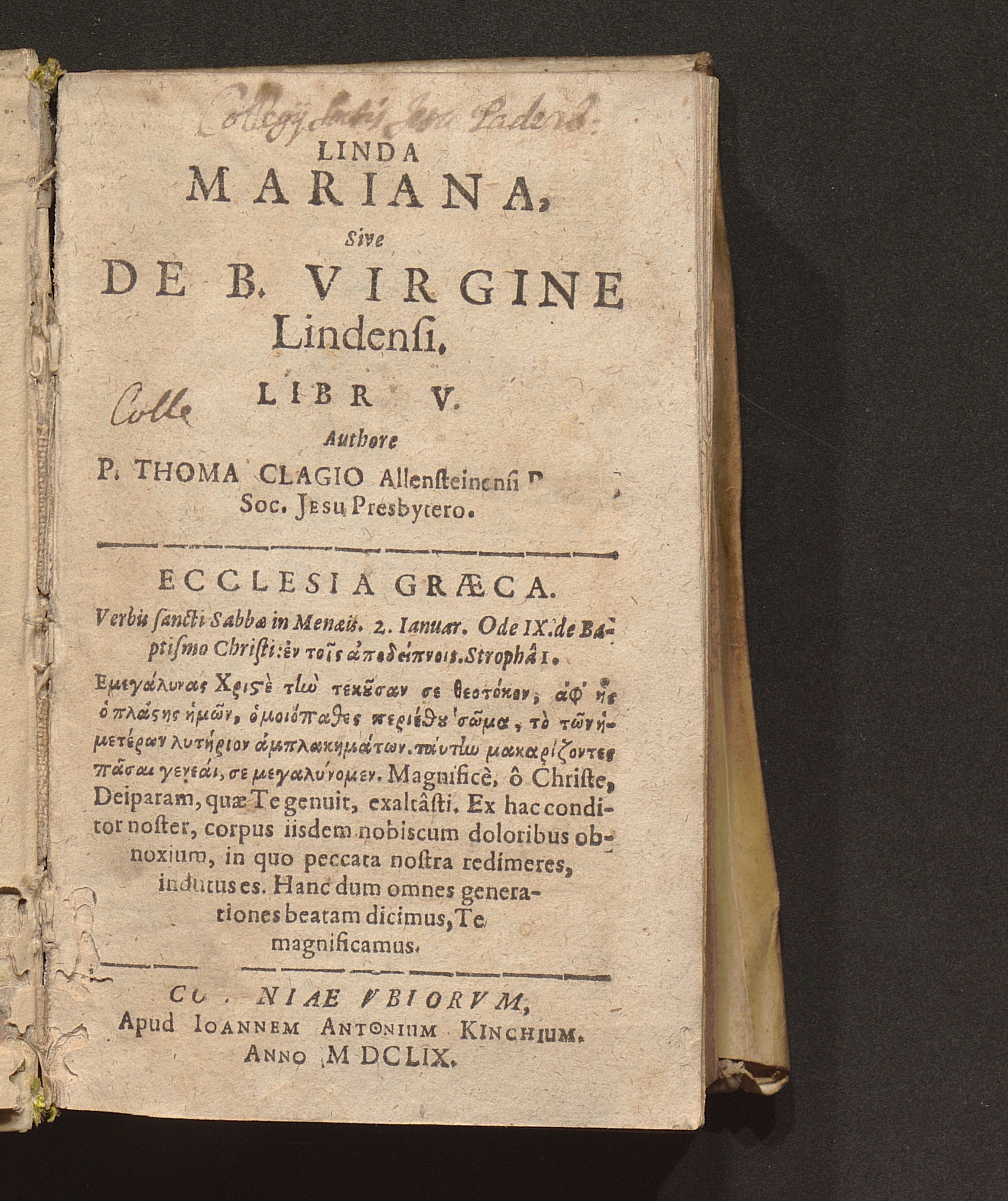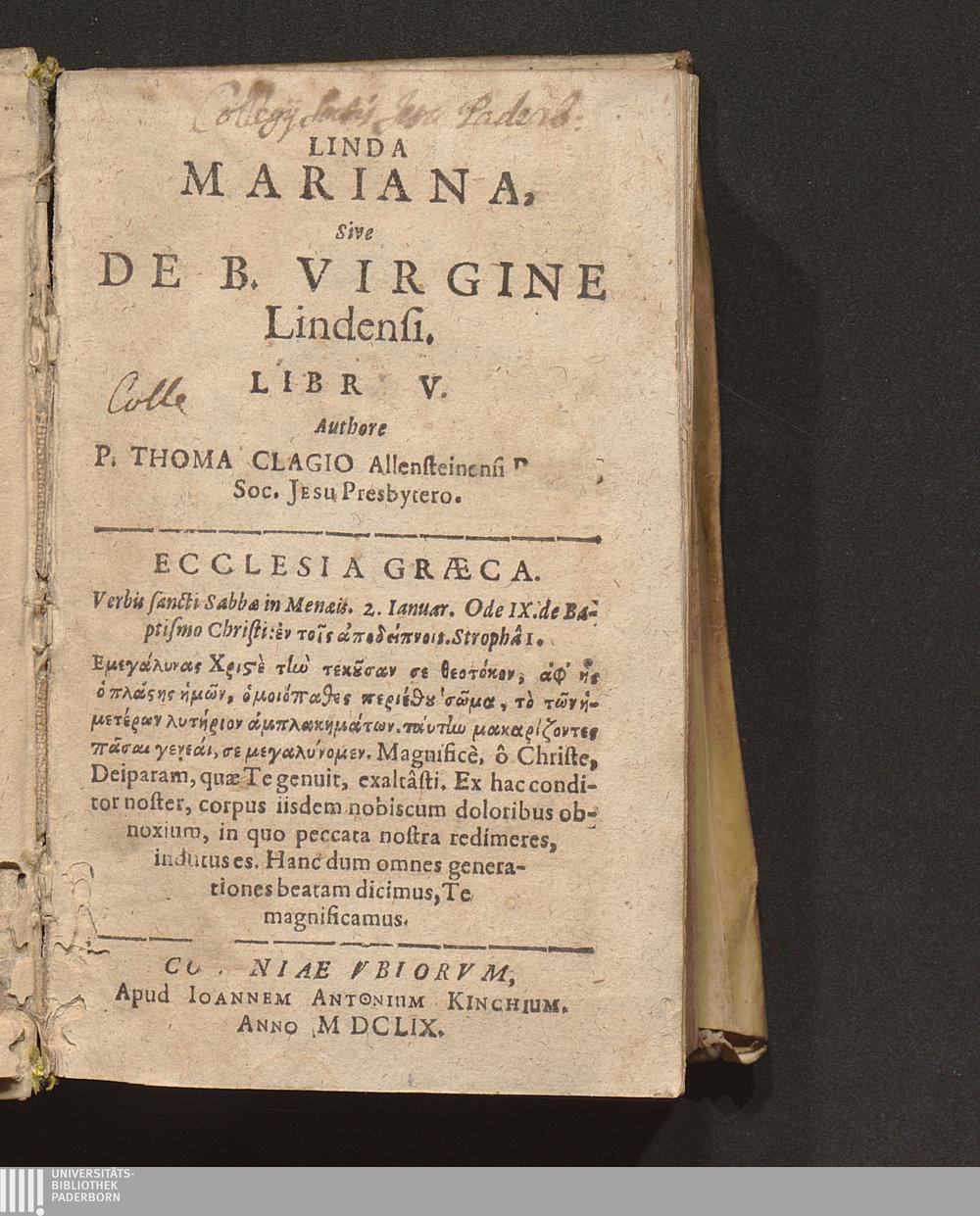 Linda Mariana, Sive De B. Virgine Lindensi : Libri V / Authore P. Thoma Clagio Allensteinensi Pruteno, Soc. Jesu Presbytero