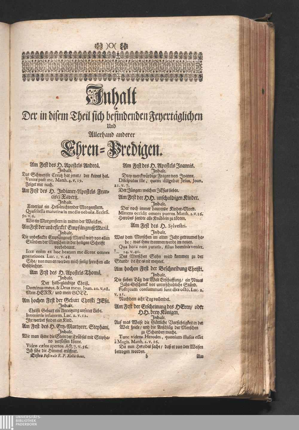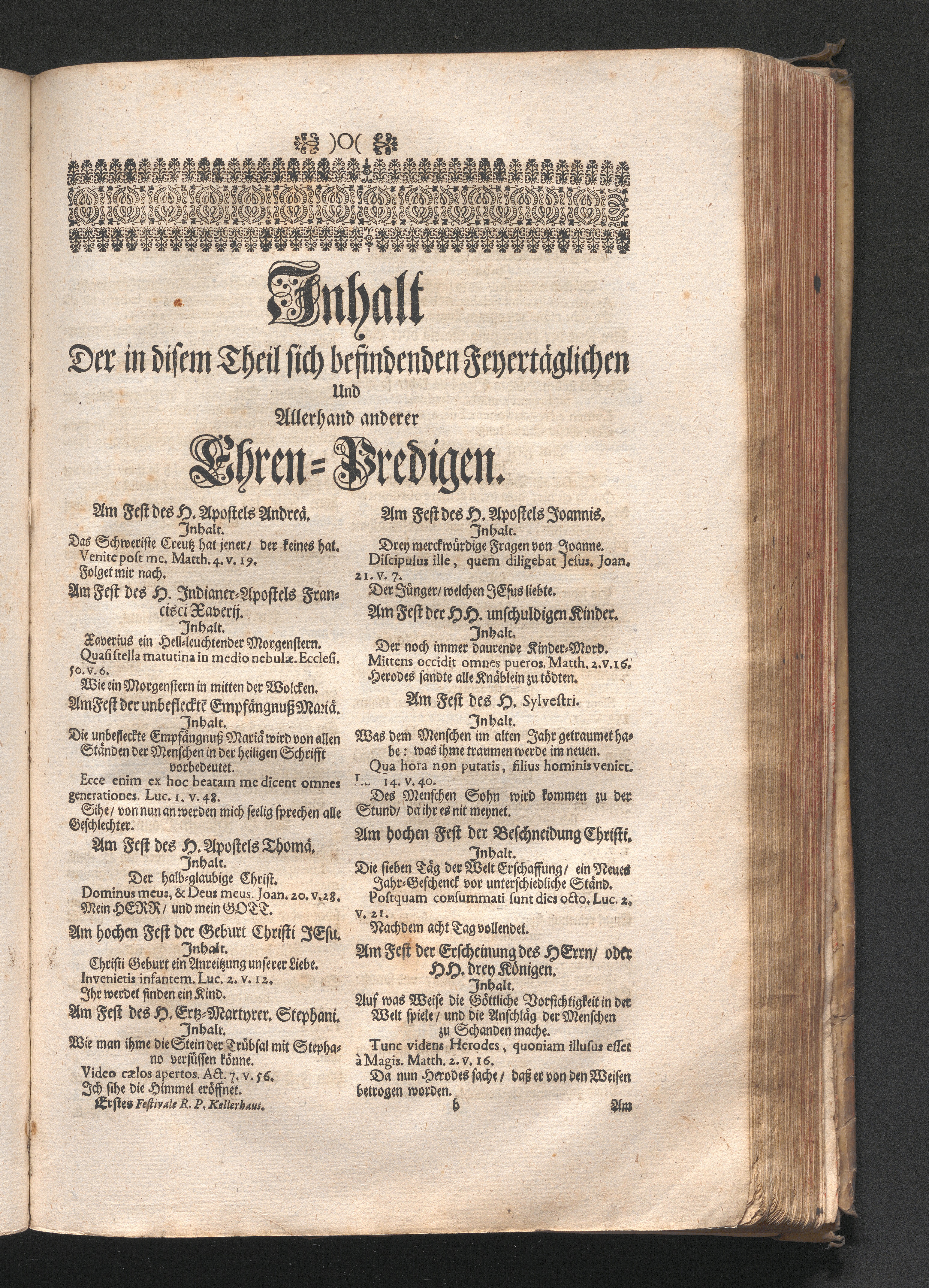 Jnhalt Der in disem Theil sich befindenden Feyertäglichen Und Allerhand anderer [...]