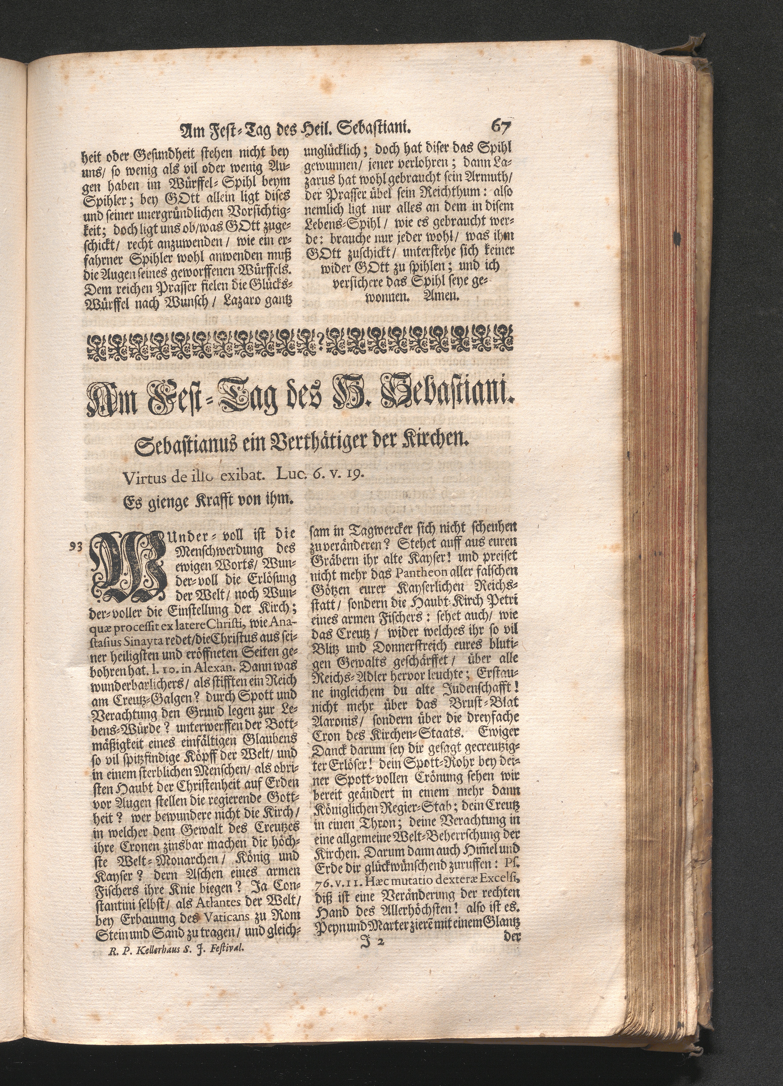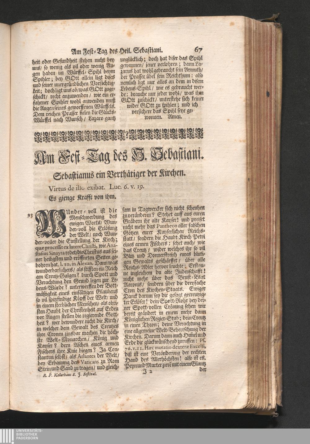 Am Fest des H. Sebastiani. Jnhalt. Sebastianus ein Verthättiger der Kirchen. Virtus[...]