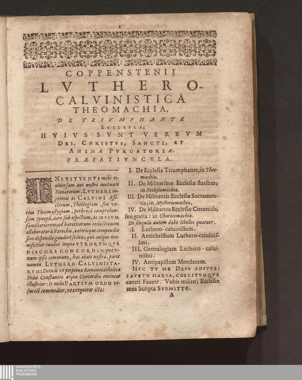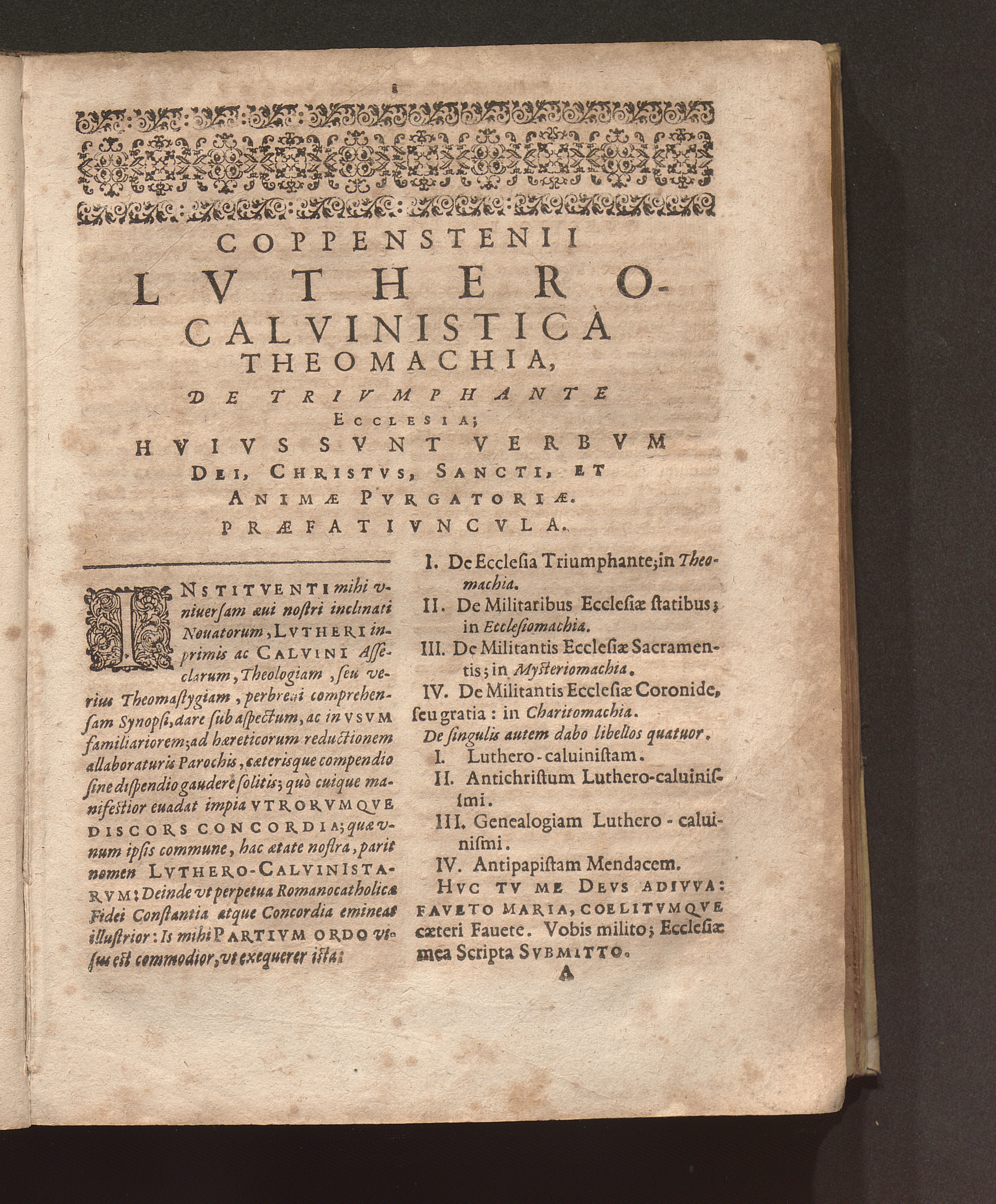 Ex Illvstrissimo Cardinali Bellarmino Epitome Controuersiarum Omnium huius Aeui Lvthero-Calvinisticarvm Sub diuersis Titulis bis Quadripertitis digestarum / Avtore F. Ioanne Andrea Coppenstein Ordinis Praedicatorum Theologo, Parocho Heidelbergae