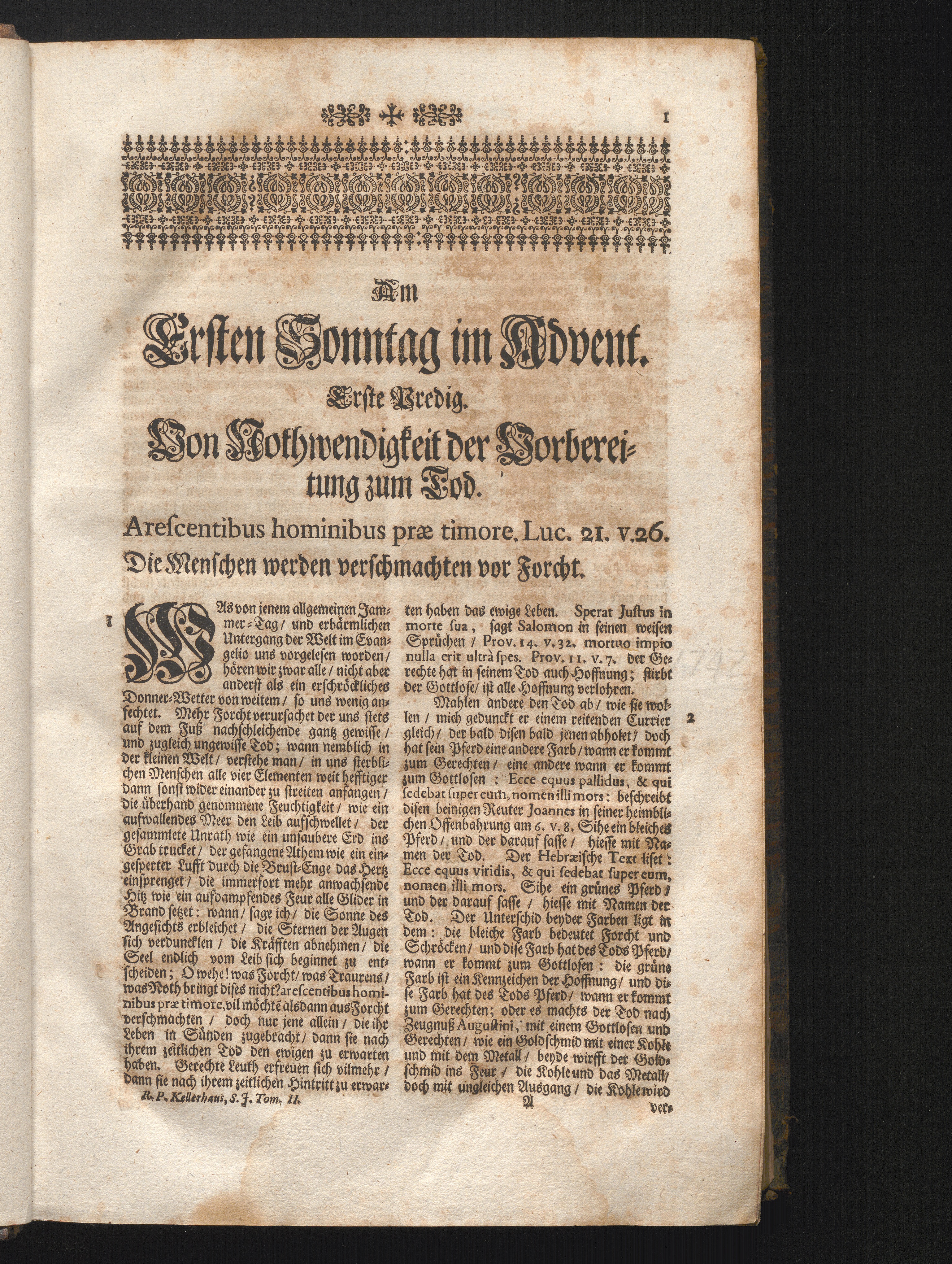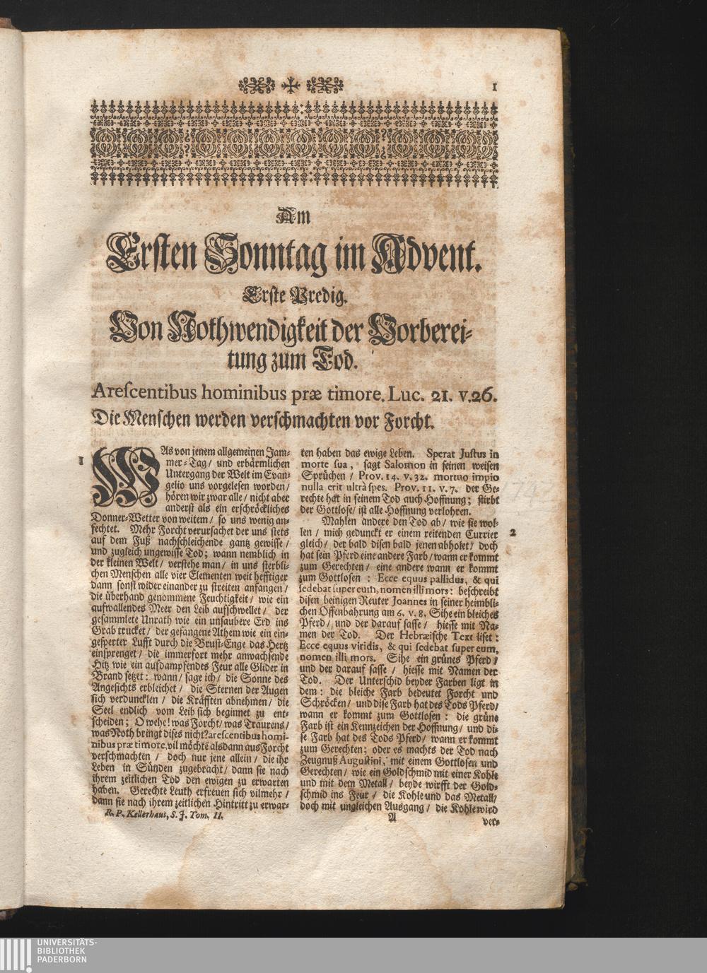 I. Predig. Jnhalt. Von Nothwendigkeit der Vorbereitung zum Tod. Arescentibus hominibus[...]