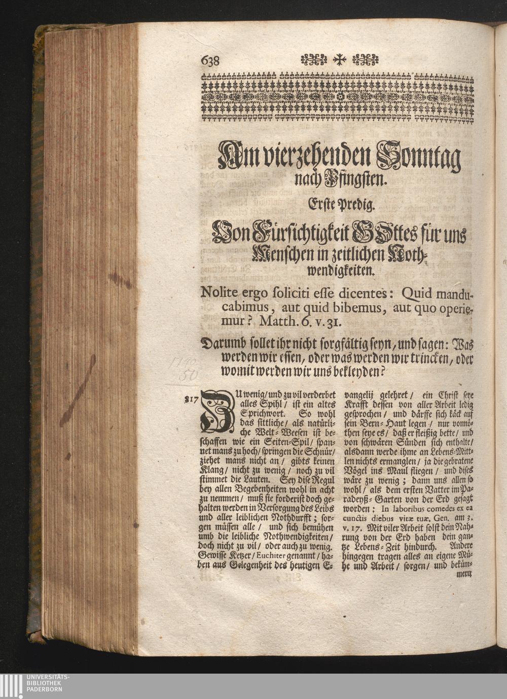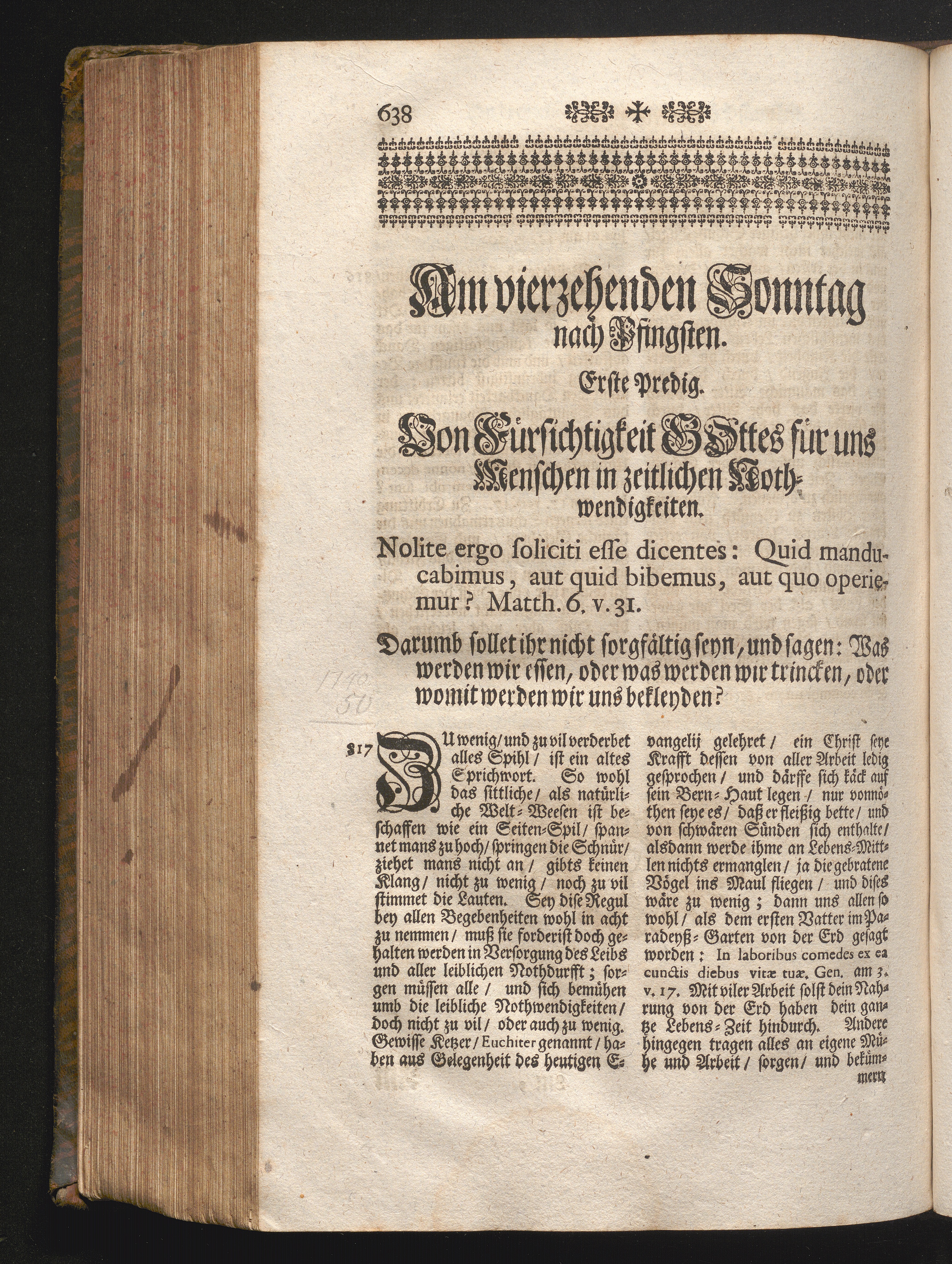 I. Predig. Jnhalt. Von Vorsichtigkeit Gottes für uns Menschen in zeitlichen Nothwendigkeiten.[...]