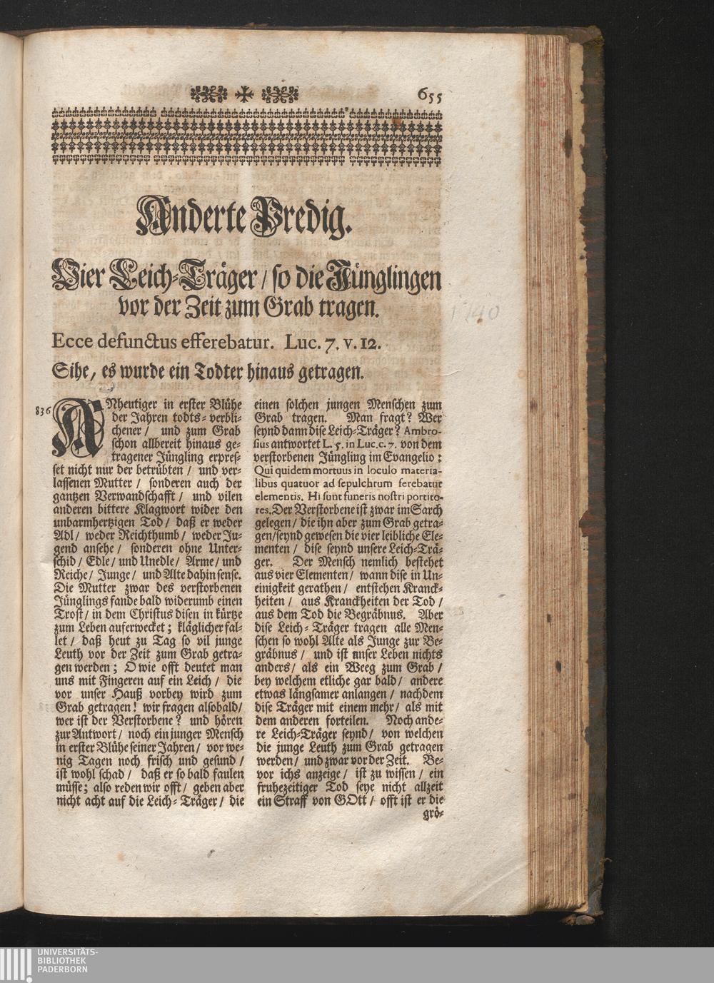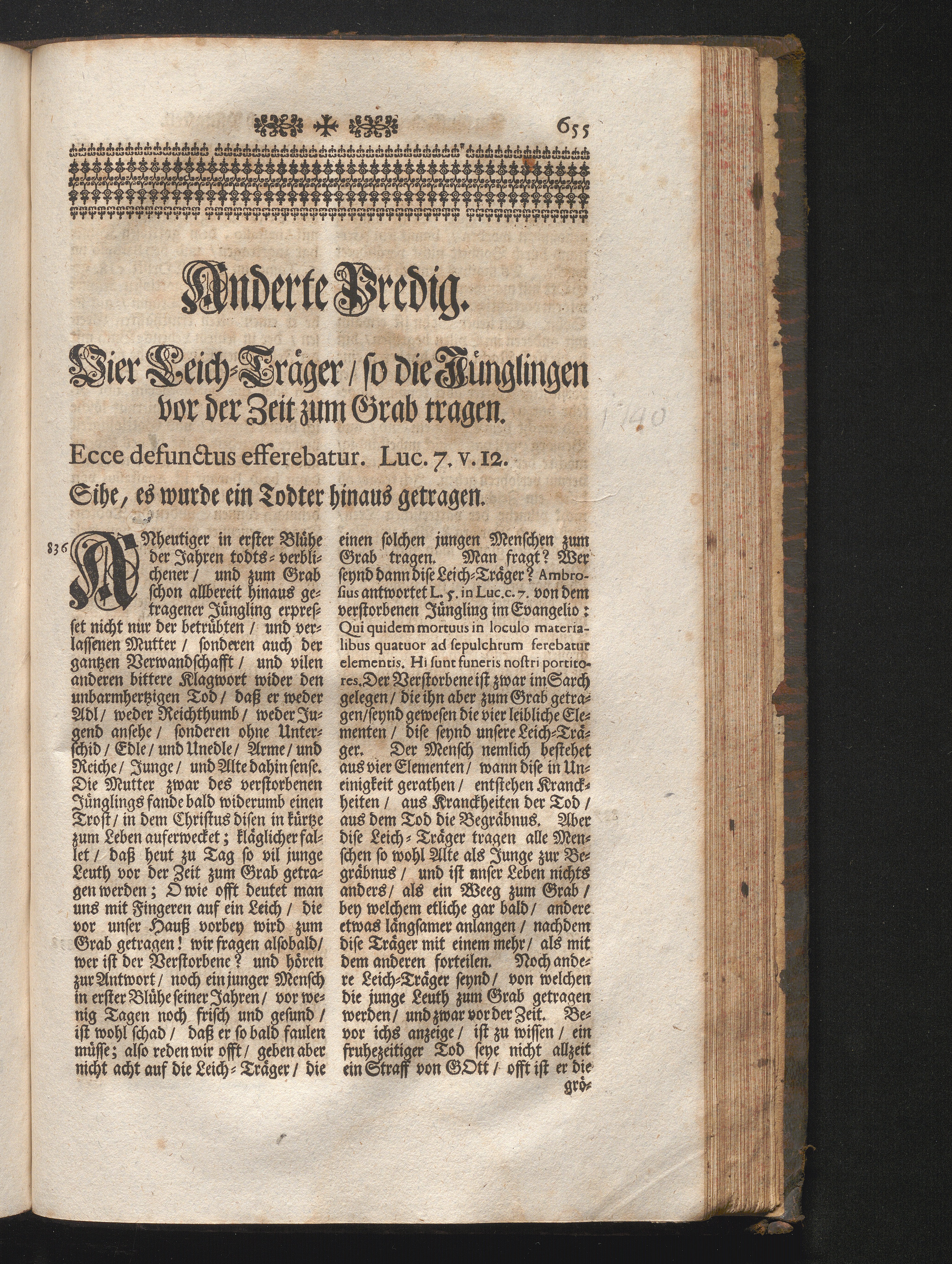 II. Predig. Jnhalt. Vier Leich-Trager/ so die Jünglinge vor der Zeit zum Grab tragen.[...]
