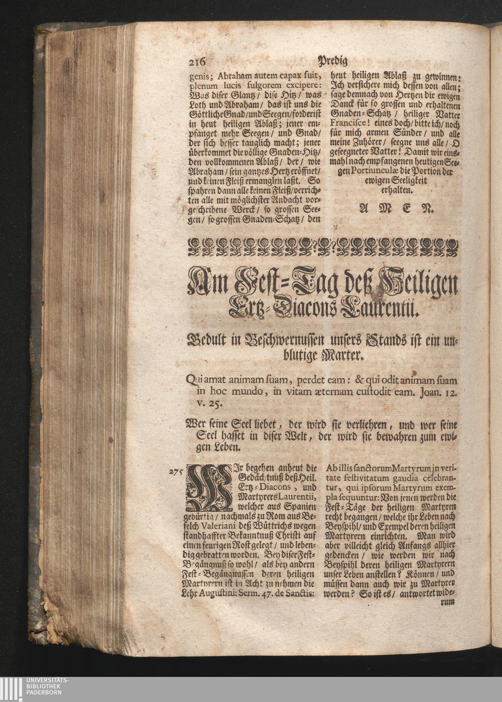 Am Fest des H. Ertz-Diaconi Laurentii. Jnhalt. Gedult in Beschwernussen unseres Stands[...]