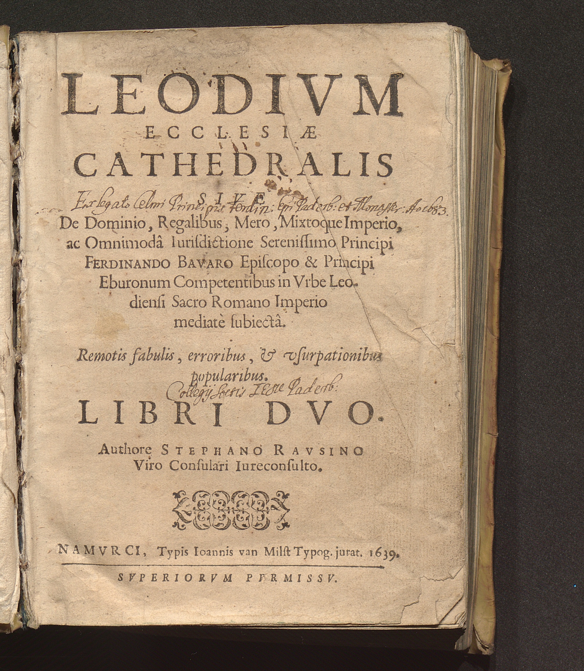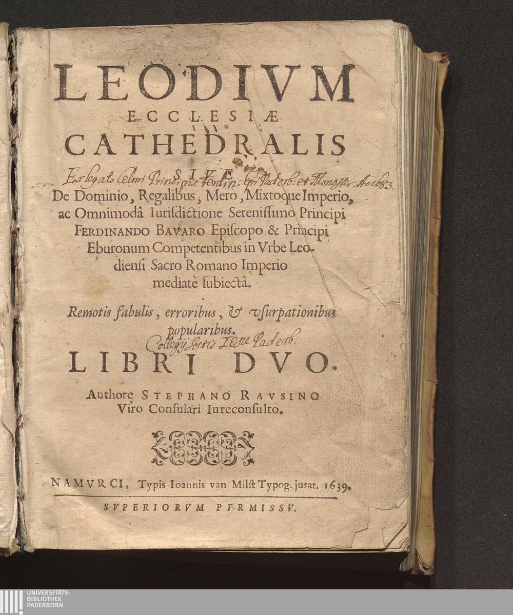 Leodivm Ecclesiae Cathedralis : Sive De Dominio, Regalibus, Mero, Mixtoque Imperio, ac Omnimodâ Iurisdictione Principi Ferdinando Bavaro Episcopo & Principi Eburonum Competentibus in Vrbe Leodiensi Sacro Romano Imperio mediatè subiectâ ; Remotis fabulis, erroribus, [et] vsurpationibus popularibus ; Libri Dvo / Authore Stephano Ravsino Viro Consulari Iureconsulto