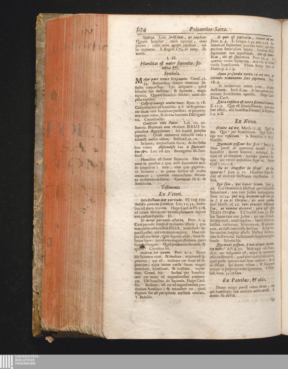 §. 6. Humilitas est mater sapientiæ. Symbola. Testimonia ex Veteri. Novo. Patribus,[...]