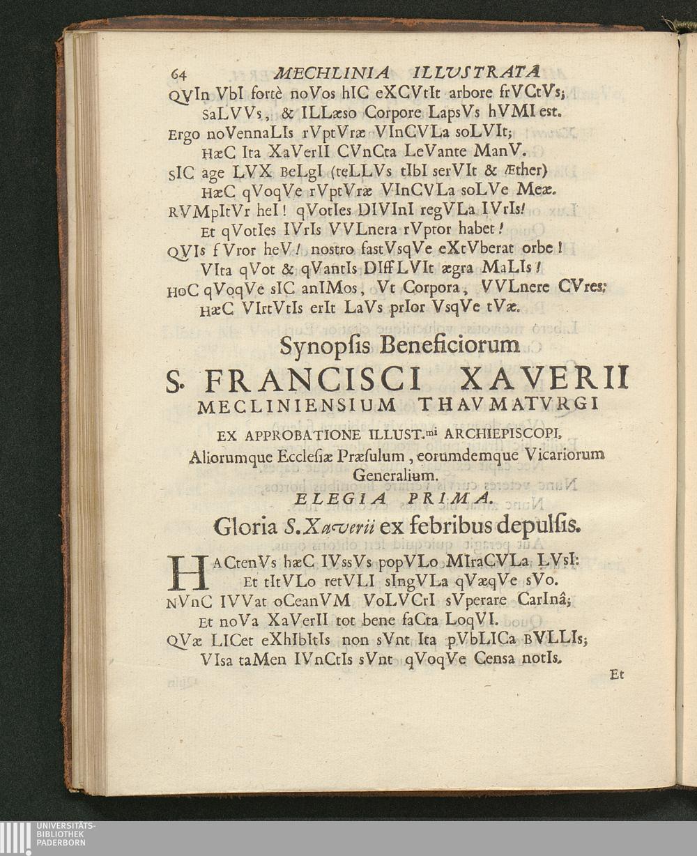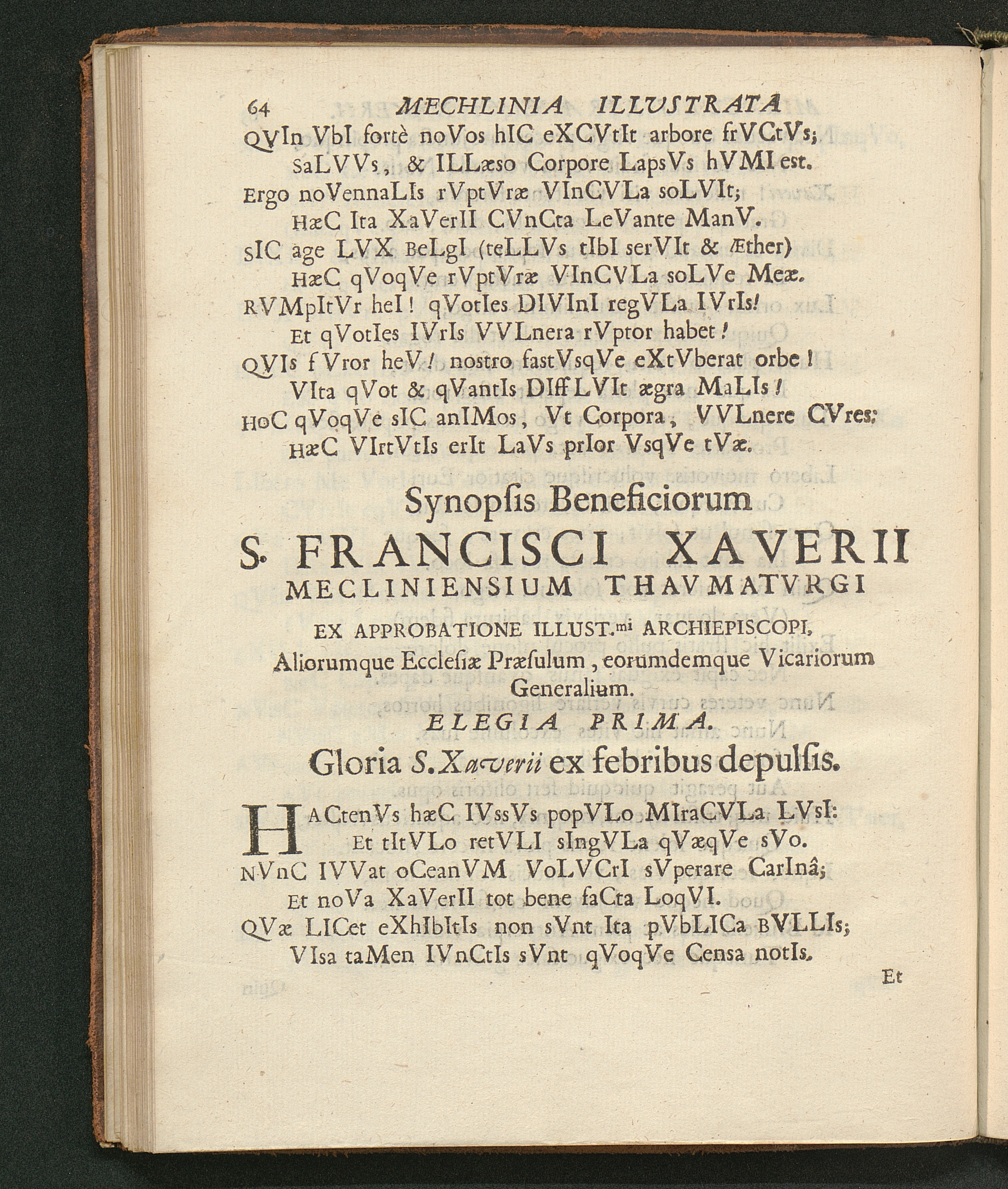 Mechlinia Illustrata Luce Miraculorum S. Francisci Xaverii Orbis Utriusque Solis Ac Thaumaturgi Chronicis Distichis evulgata Anno M.D.C.LXVI. / Auctore Gerardo Grumsel Societatis Jesv Sacerdote
