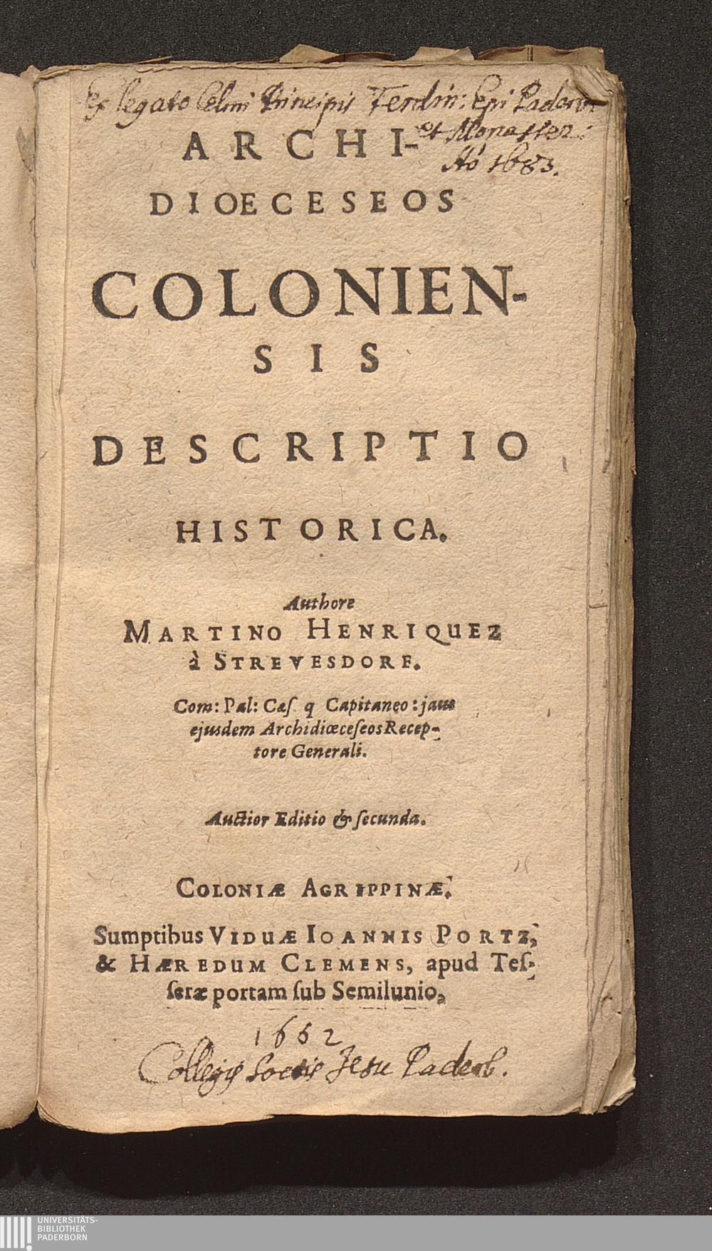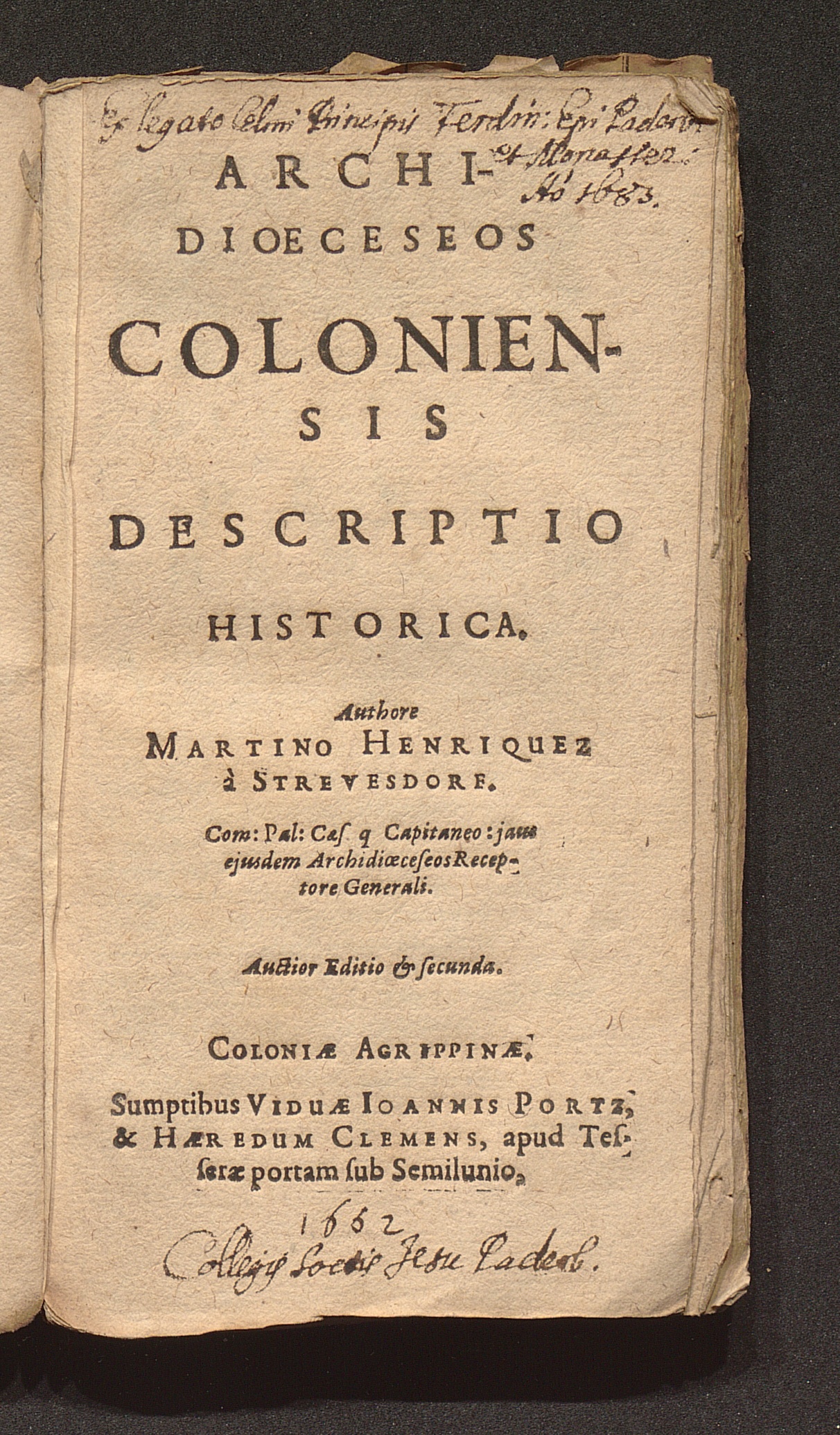 Archi-||dioeceseos || Colonien-||sis Descriptio || Historica / Authore Martino Henriquez à Strevesdorf. Com: Pal: Cæs. q Capitaneo: jam ejusdem Archidiœceseos Receptore Generali