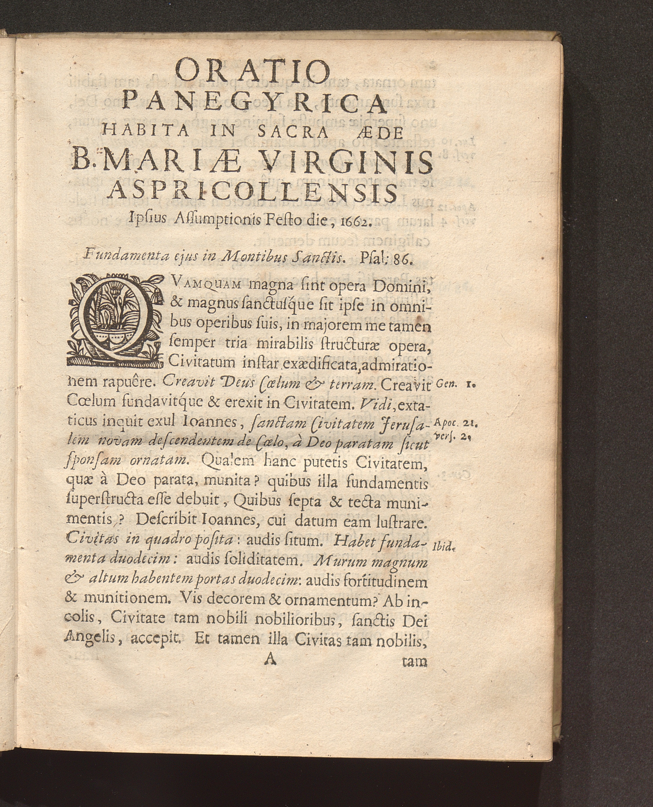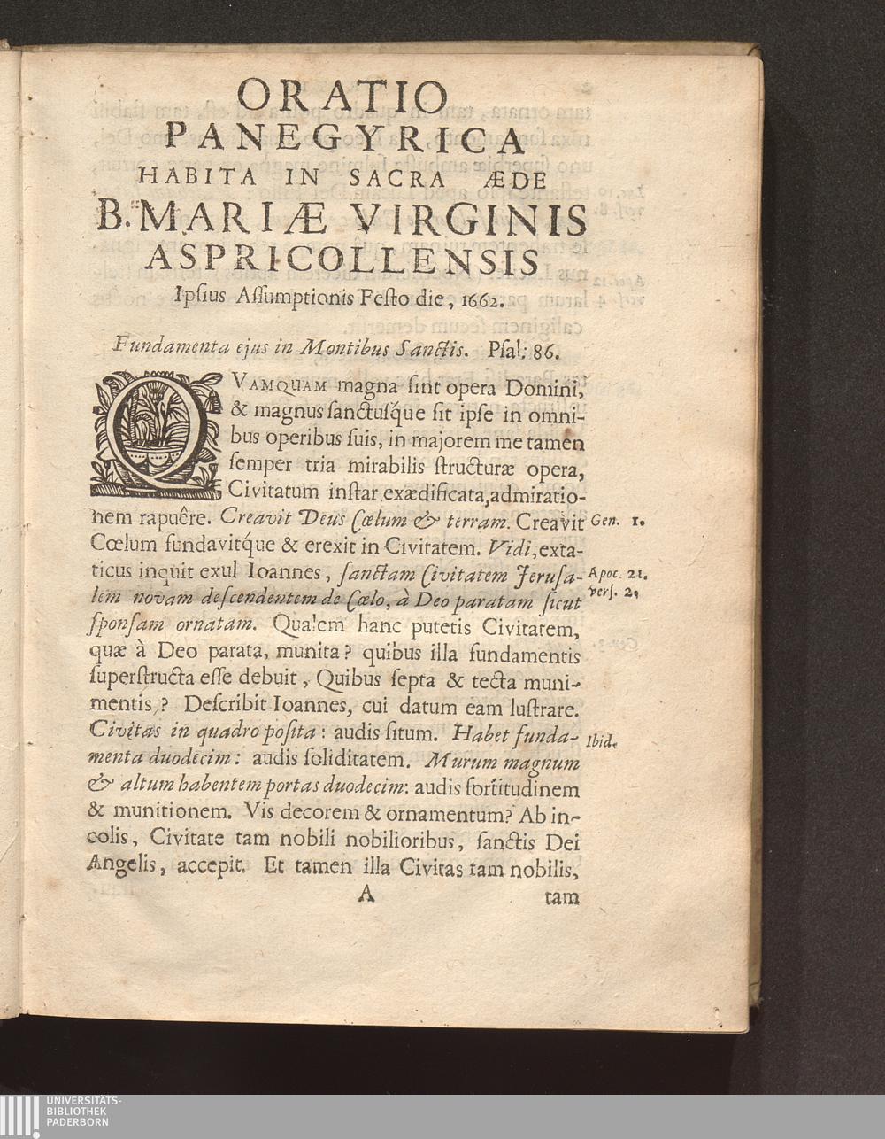 Oratio Panegyrica Habita In Sacra Aede B. Mariae Aspricollensis Ipso Festo Assumptionis ejusdem Die : Qvando Ad Illam Avrevs Tapes Missvs A Sanctissimo Domino Nostro Alexandro VII. Delatvs Fvit Ab Illvstrissimo Et Reverendiss. Domino Hieronymo De Vecchiis ... / [Franciscus Vanden Venne]