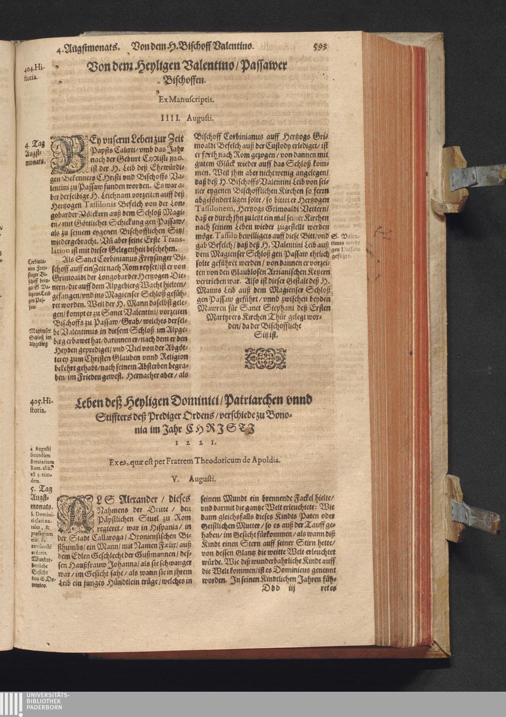 Vitæ Sanctorvm / Etwa von Francisco Haræo S. Theol. lice[n]tiato in latein beschrieben auch folgents augirt. Nachmals auß dem latein mit besonderm fleiß verteutscht, itzt aber widerumb vffs neuw corrigirt vnd vber die helfft verbessert Durch Valentinum Leuchtium SS. Theol. Doct. Proton. Apostolicum, Comitem palenti. & commiss. Cæsareum, Cantorem, & Concion. ad S. Barthol. Francoforti