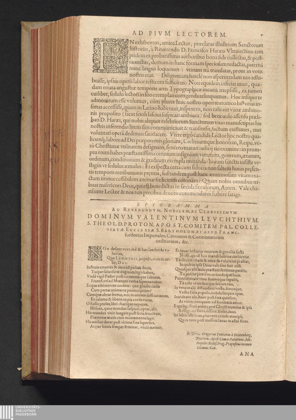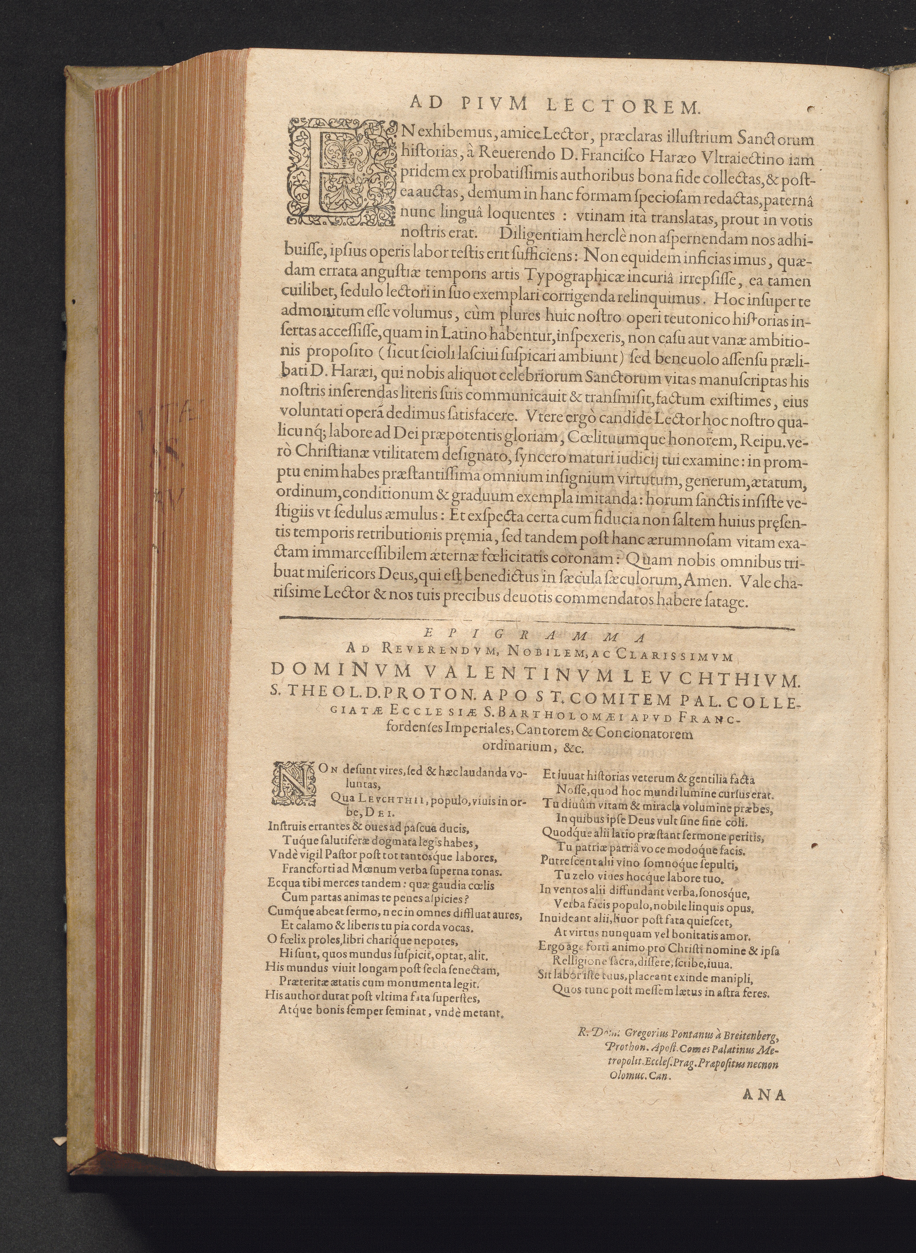 Vitæ Sanctorvm / Etwa von Francisco Haræo S. Theol. lice[n]tiato in latein beschrieben auch folgents augirt. Nachmals auß dem latein mit besonderm fleiß verteutscht, itzt aber widerumb vffs neuw corrigirt vnd vber die helfft verbessert Durch Valentinum Leuchtium SS. Theol. Doct. Proton. Apostolicum, Comitem palenti. & commiss. Cæsareum, Cantorem, & Concion. ad S. Barthol. Francoforti