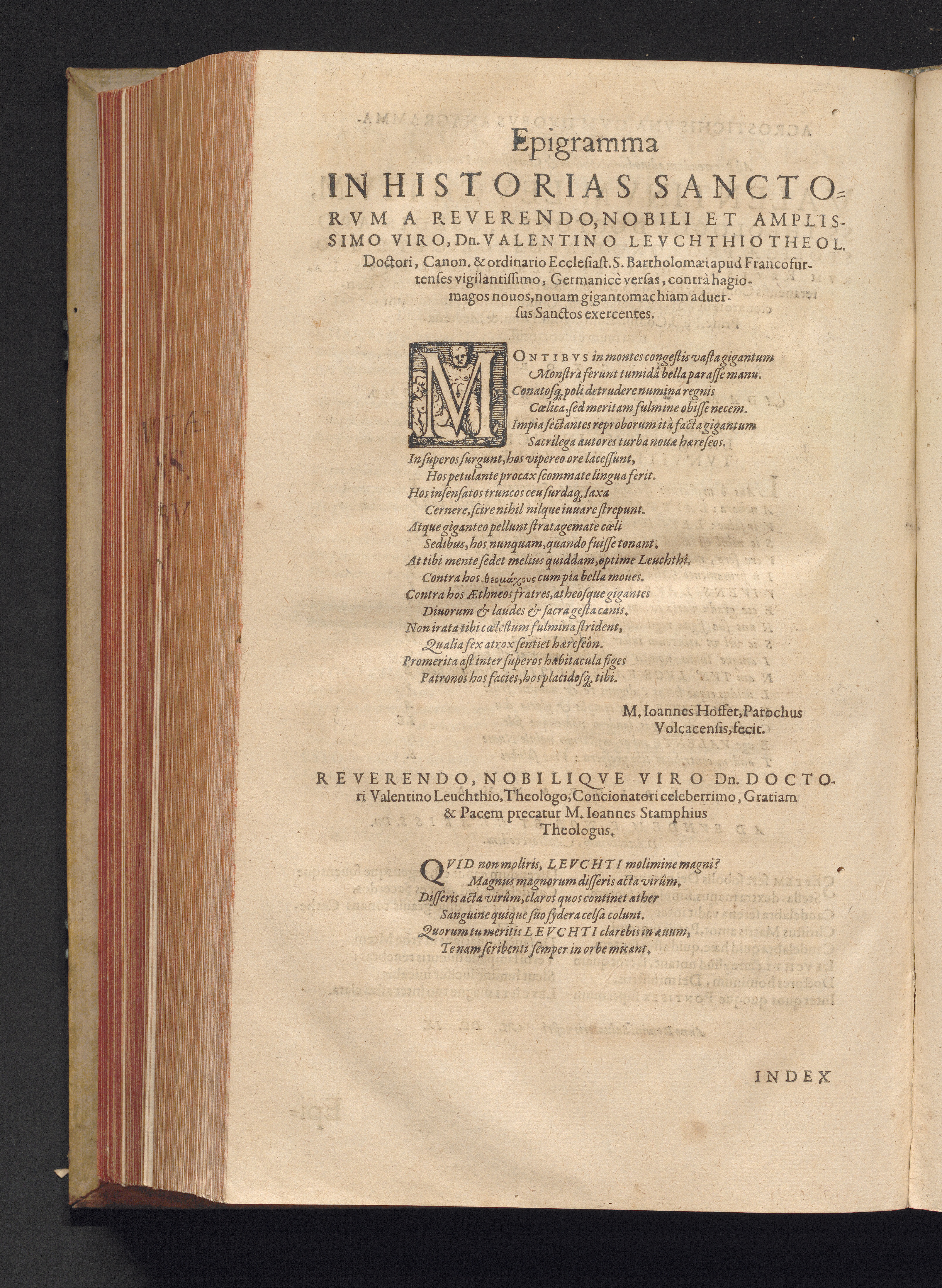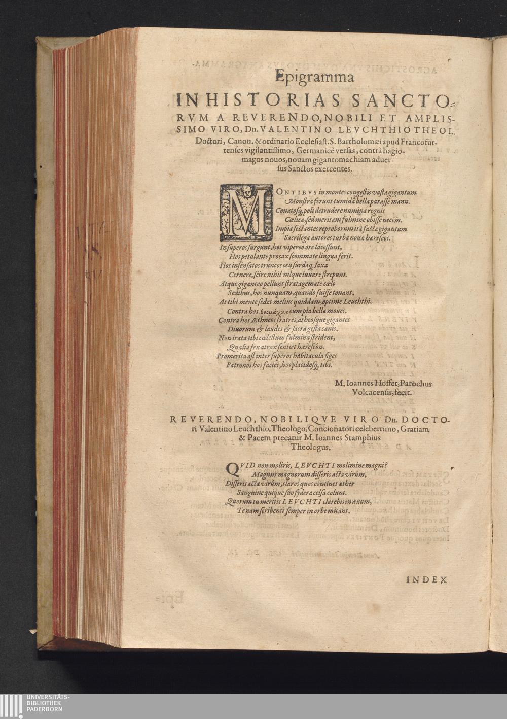 Vitæ Sanctorvm / Etwa von Francisco Haræo S. Theol. lice[n]tiato in latein beschrieben auch folgents augirt. Nachmals auß dem latein mit besonderm fleiß verteutscht, itzt aber widerumb vffs neuw corrigirt vnd vber die helfft verbessert Durch Valentinum Leuchtium SS. Theol. Doct. Proton. Apostolicum, Comitem palenti. & commiss. Cæsareum, Cantorem, & Concion. ad S. Barthol. Francoforti