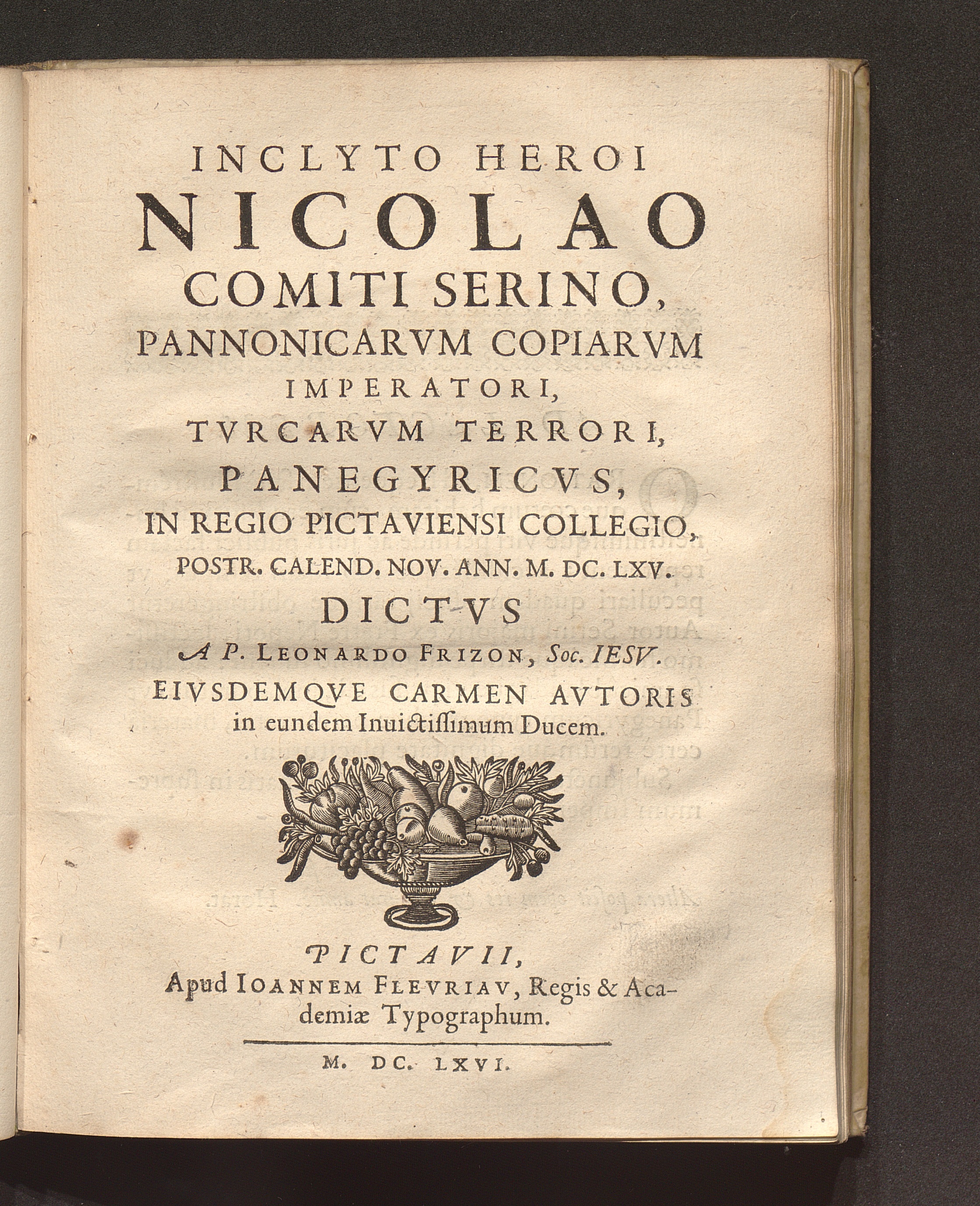 Inclyto Heroi Nicolao Comiti Serino, Pannonicarvm Copiarvm Imperatori, Tvrcarvm Terrori, Panegyricus : In Regio Pictaviensi Collegio, Postr. Calend. Nov. Ann. M.DC.LXV. Dictvs / A P. Leonardo Frizon, Soc. Iesv.