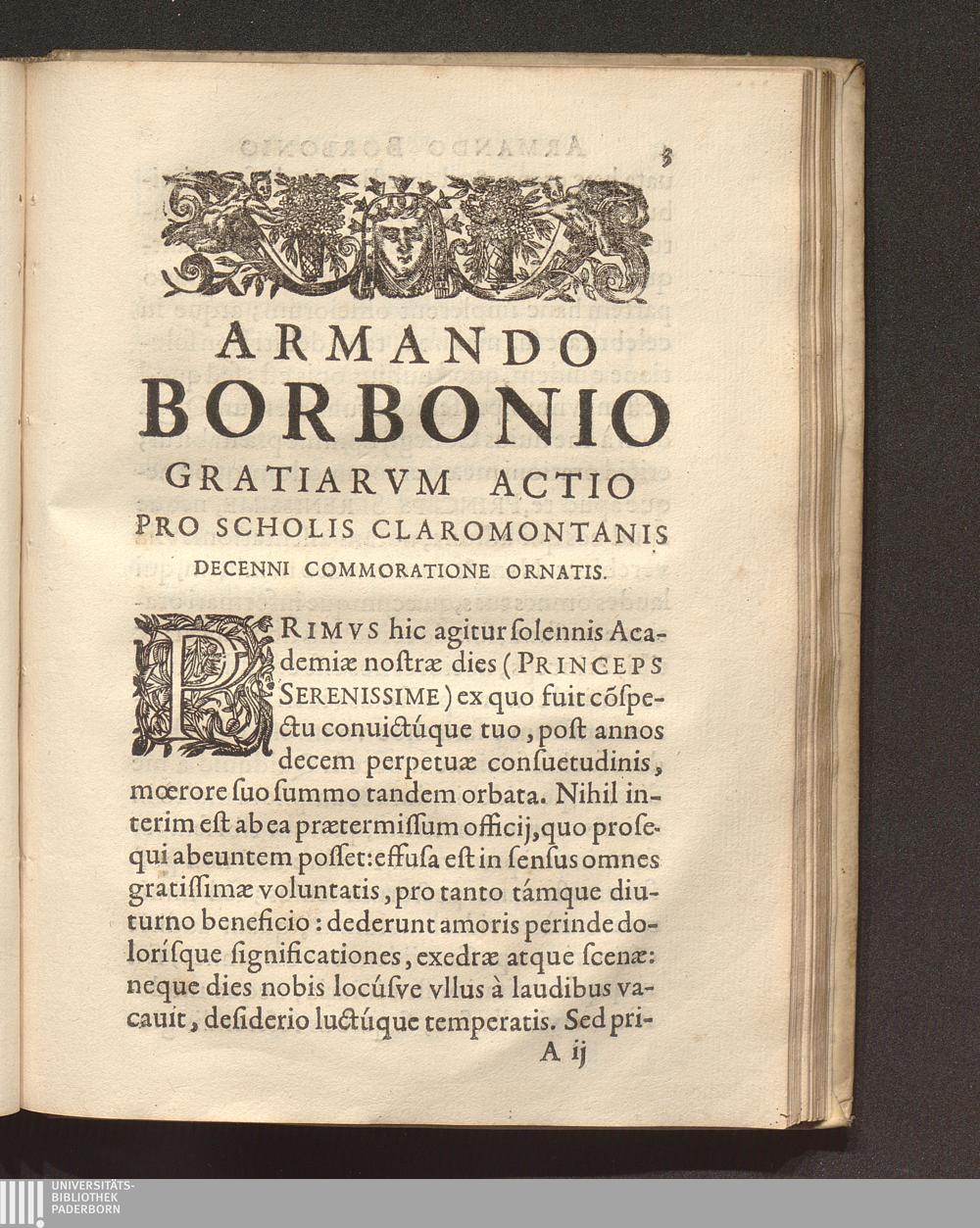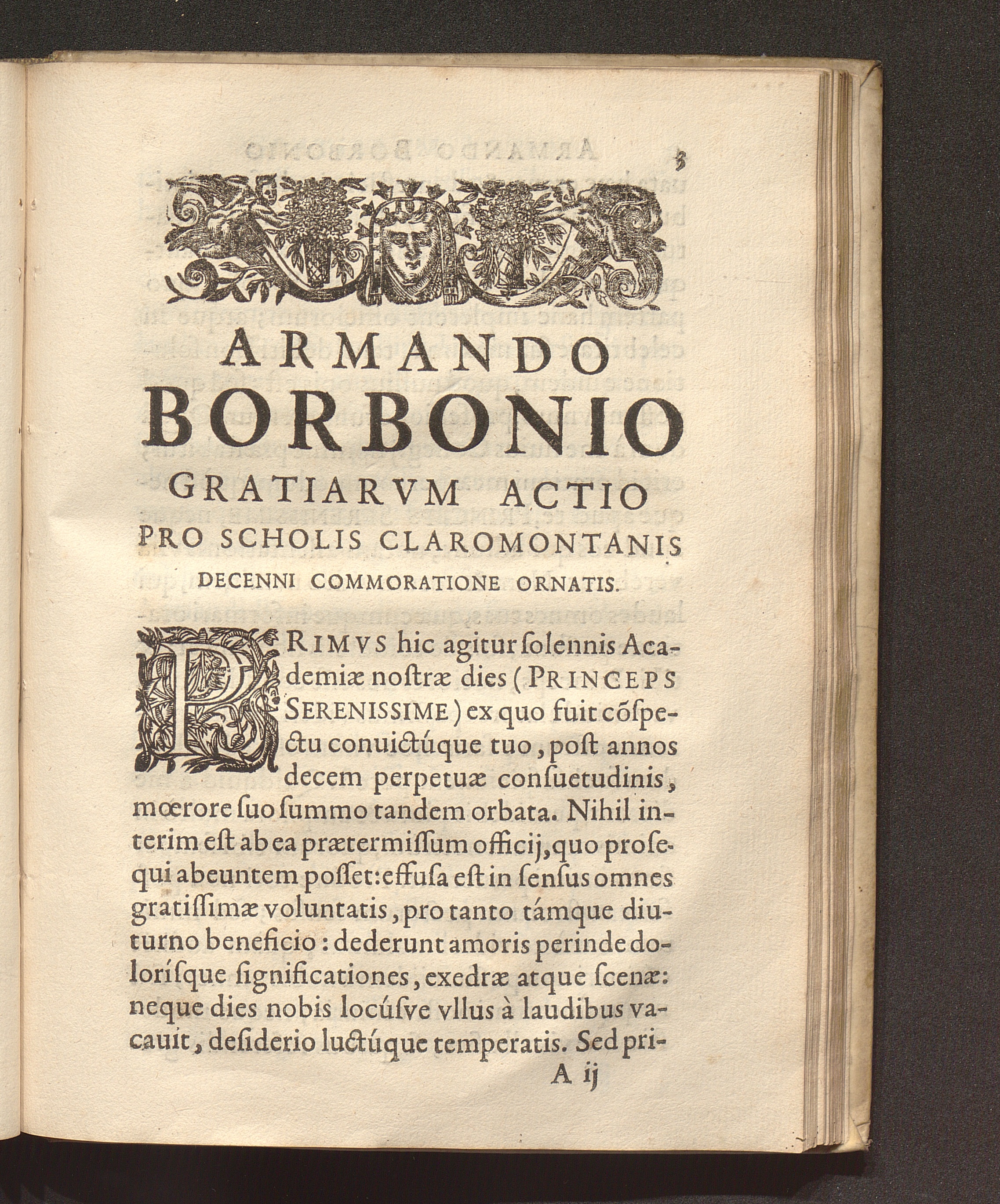 Armando Borbonio Serenissimo Principi De Conty Campaniae & Briae Gubernatori, &c. Gratiarvm Actio Pro Scholis Claromontanis Collegii Parisiensis Societ. Iesv decenni commoratione ornatis : Habita Ad Earvmdem Scholarvm Instavrationem III. Kal. Octob. An. M.DC.XLVII / A Gabriele Cossartio, eiusdem Societatis Sacerdote