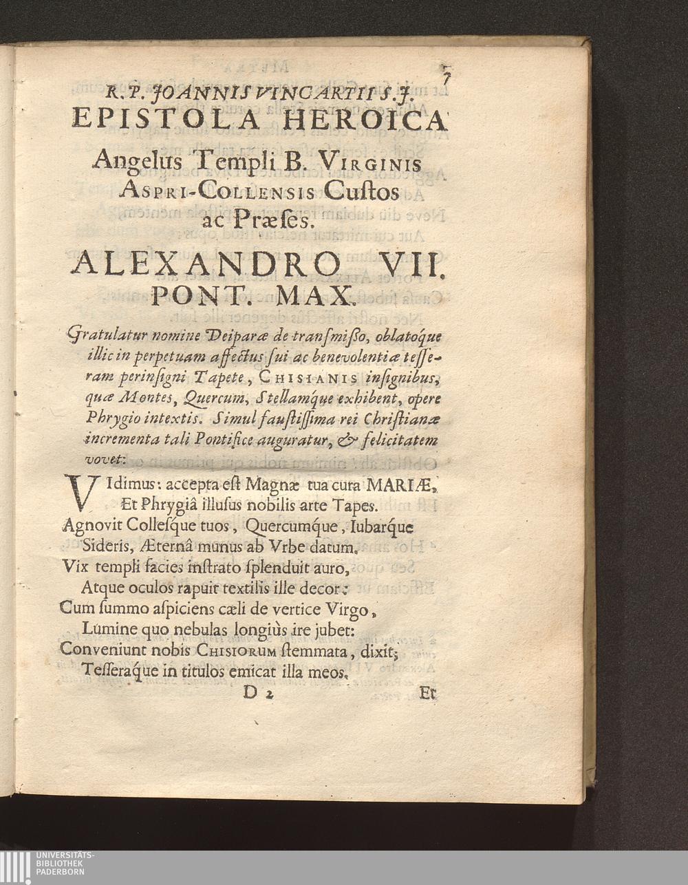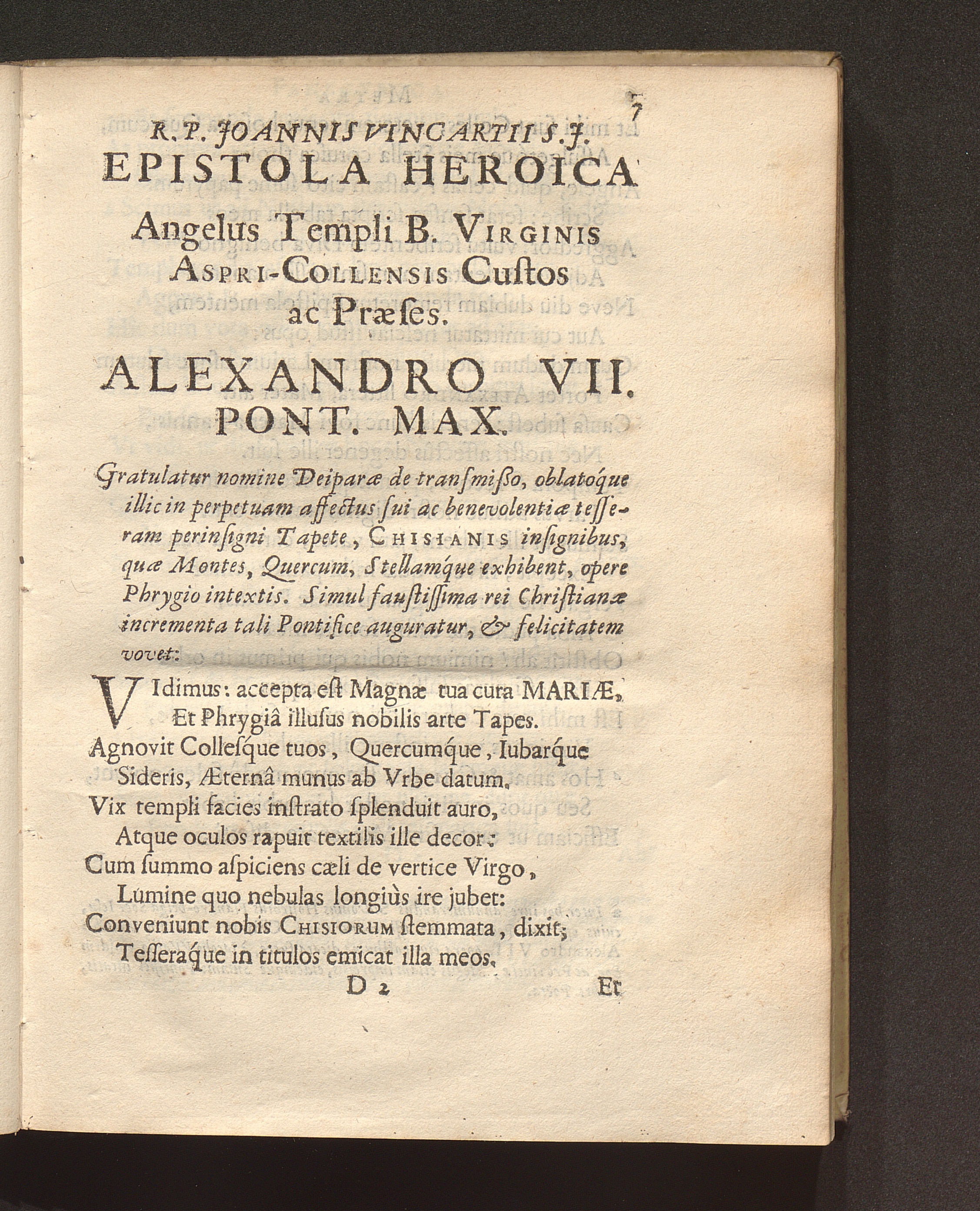 Oratio Panegyrica Habita In Sacra Aede B. Mariae Aspricollensis Ipso Festo Assumptionis ejusdem Die : Qvando Ad Illam Avrevs Tapes Missvs A Sanctissimo Domino Nostro Alexandro VII. Delatvs Fvit Ab Illvstrissimo Et Reverendiss. Domino Hieronymo De Vecchiis ... / [Franciscus Vanden Venne]