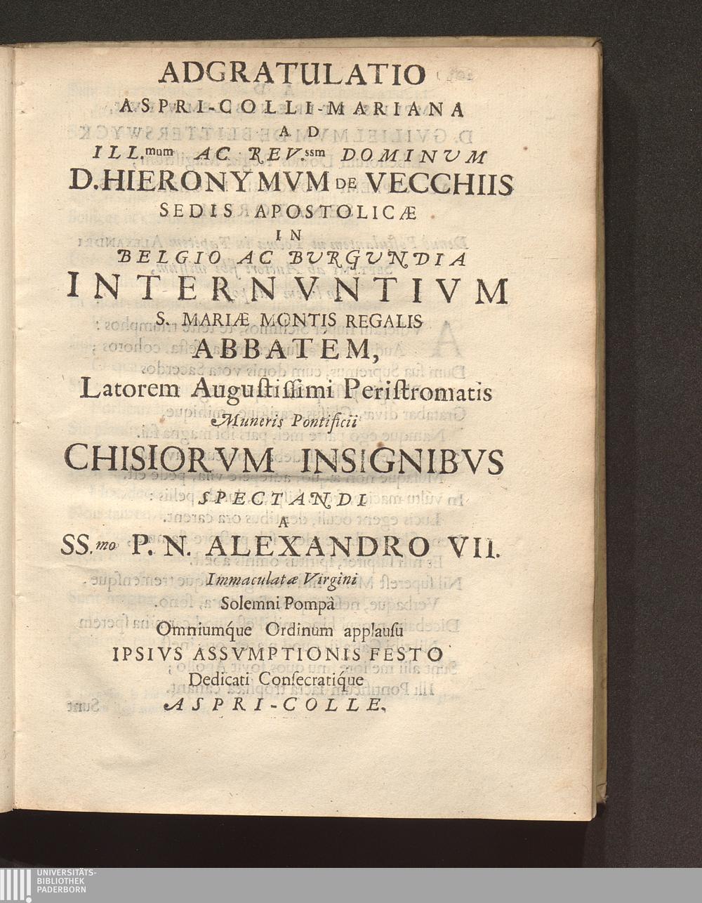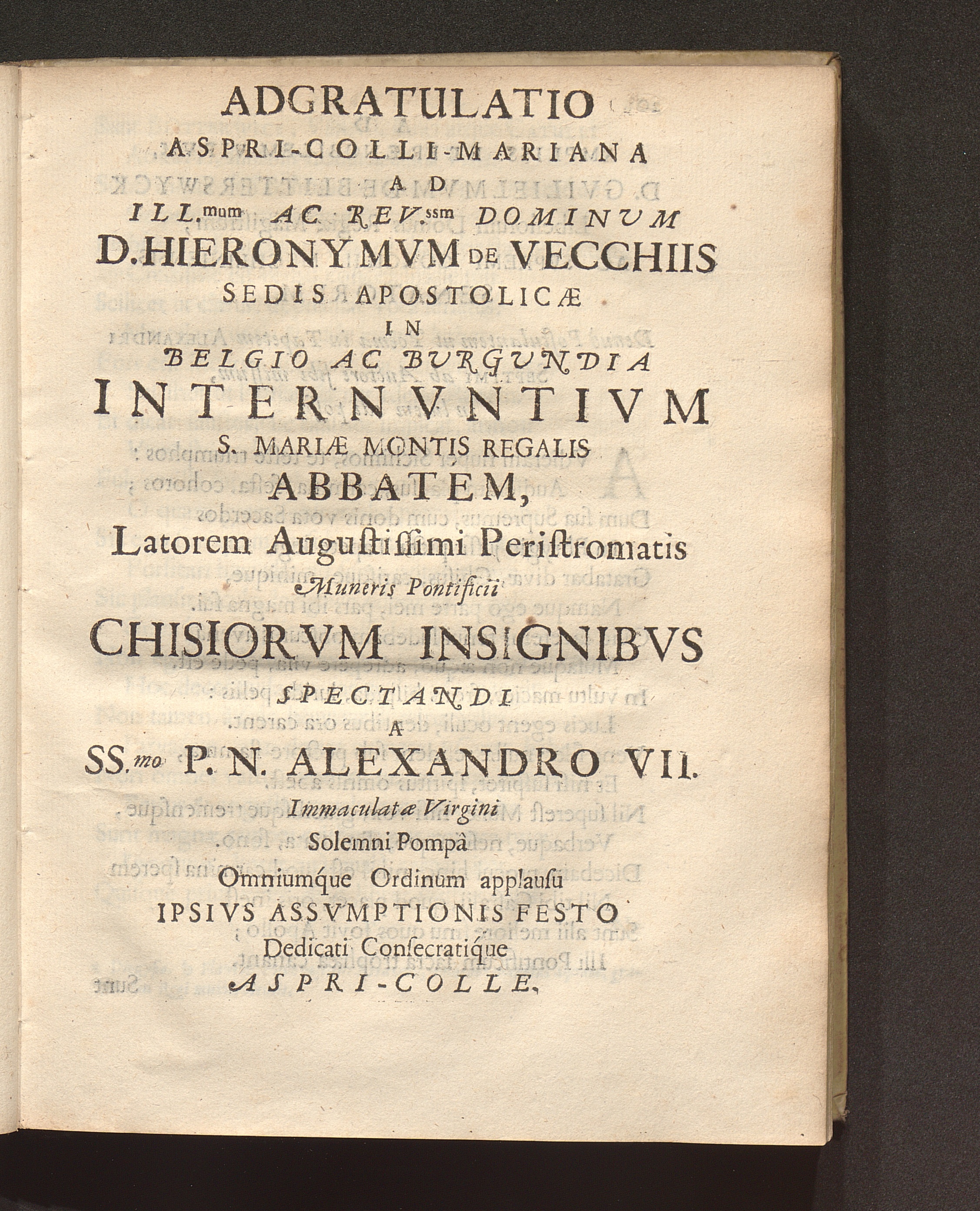 Oratio Panegyrica Habita In Sacra Aede B. Mariae Aspricollensis Ipso Festo Assumptionis ejusdem Die : Qvando Ad Illam Avrevs Tapes Missvs A Sanctissimo Domino Nostro Alexandro VII. Delatvs Fvit Ab Illvstrissimo Et Reverendiss. Domino Hieronymo De Vecchiis ... / [Franciscus Vanden Venne]