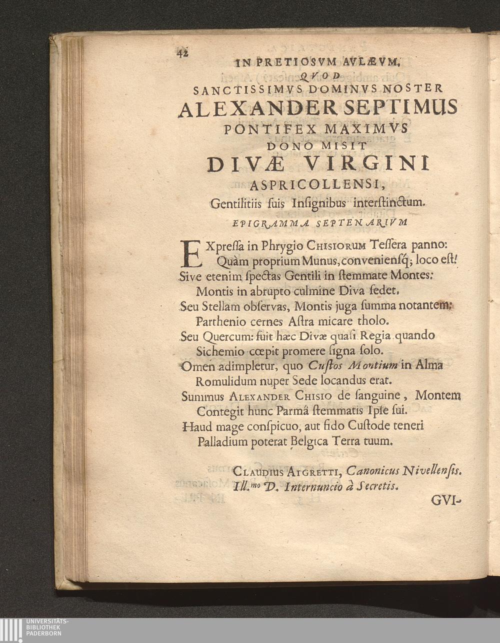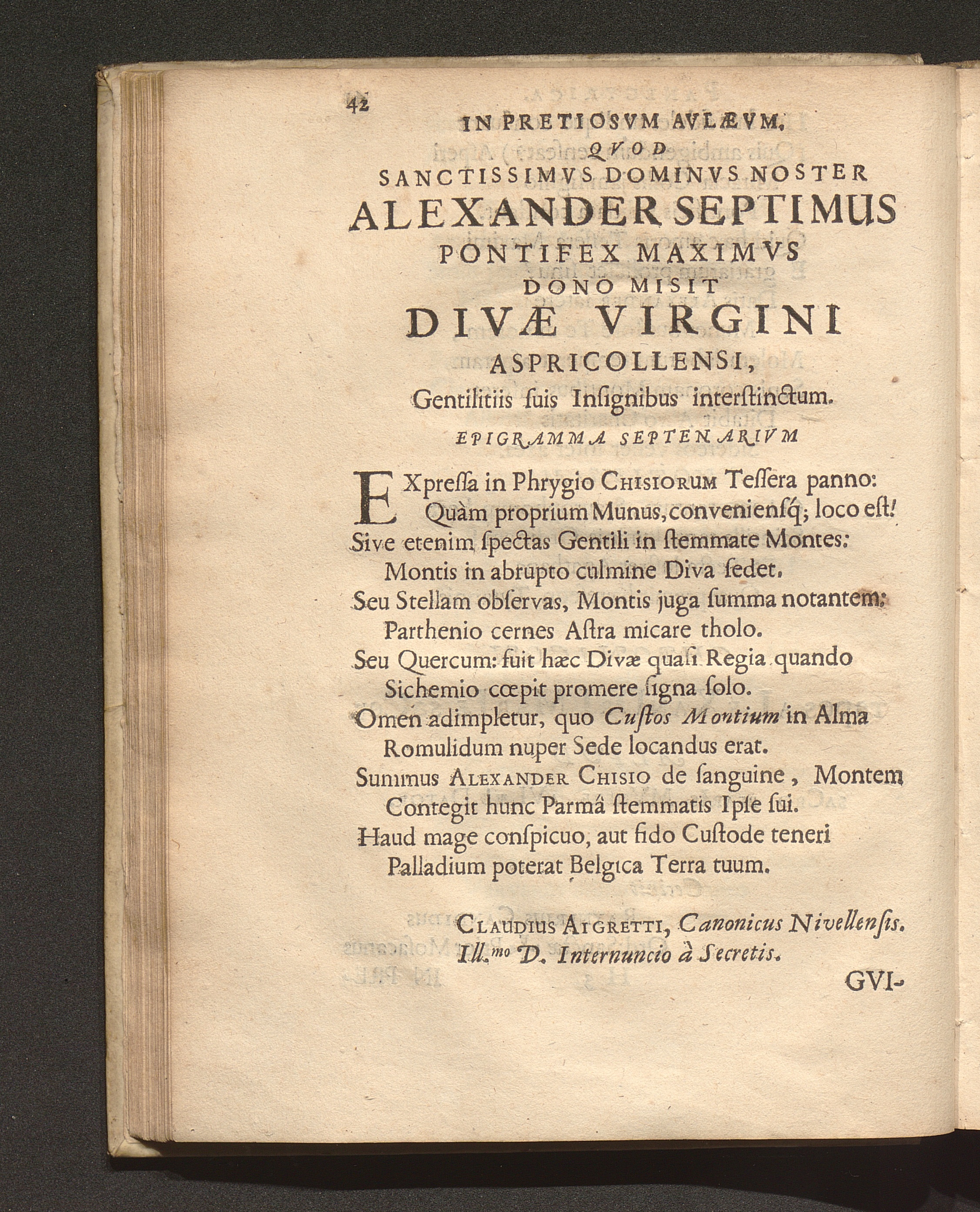 Oratio Panegyrica Habita In Sacra Aede B. Mariae Aspricollensis Ipso Festo Assumptionis ejusdem Die : Qvando Ad Illam Avrevs Tapes Missvs A Sanctissimo Domino Nostro Alexandro VII. Delatvs Fvit Ab Illvstrissimo Et Reverendiss. Domino Hieronymo De Vecchiis ... / [Franciscus Vanden Venne]