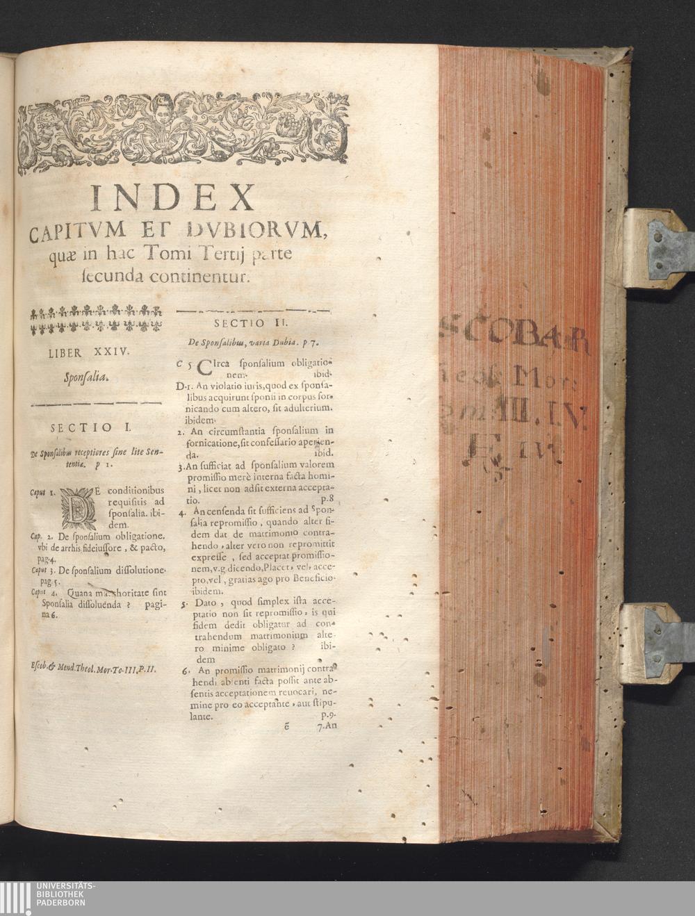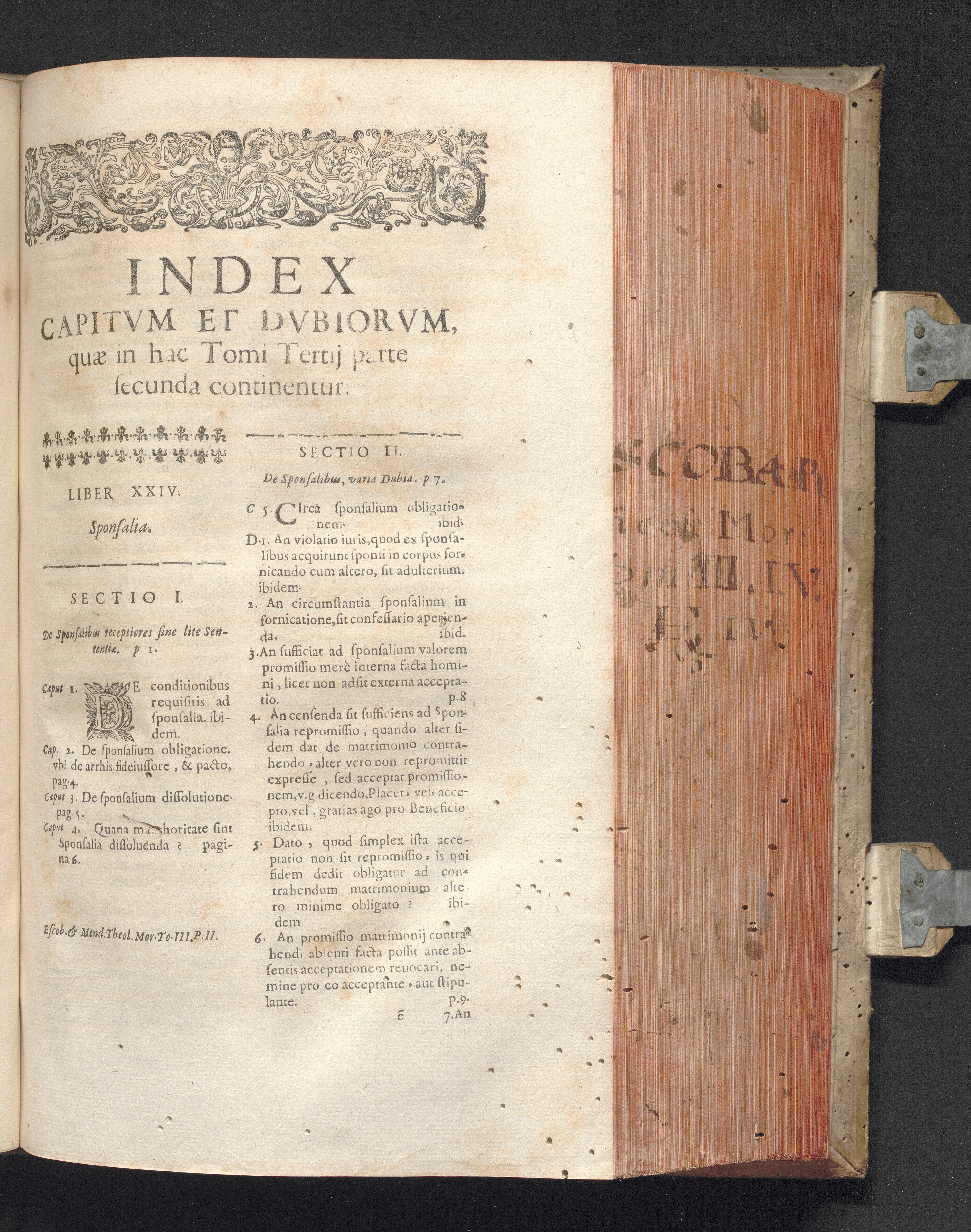 3,2: R. P. Antonii De Escobar Et Mendoza, Vallisoletani, Societatis Iesv Theologi, Vniversæ Theologiæ Moralis, Receptiores Absqve Lite Sententiæ nec-non Problematicae Disquisitiones ... Tomus ... : . Tomi Tertii Pars Altera / Matrimonii Sacramentum. Quatuor Libris Tractatus continet de Sponsalibus, de Matrimonij Essentia, Consensu Recto, Clandestino, Coacto, ac Conditionato, de Debito coniugali, ac Diuortio, de Impedimentis, & Dispensationibus
