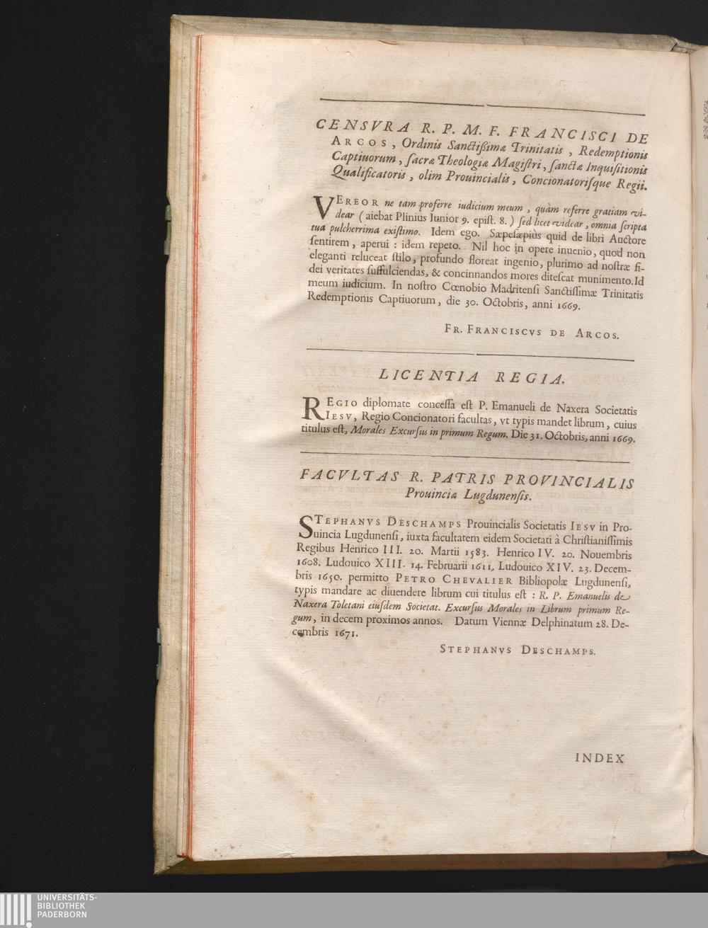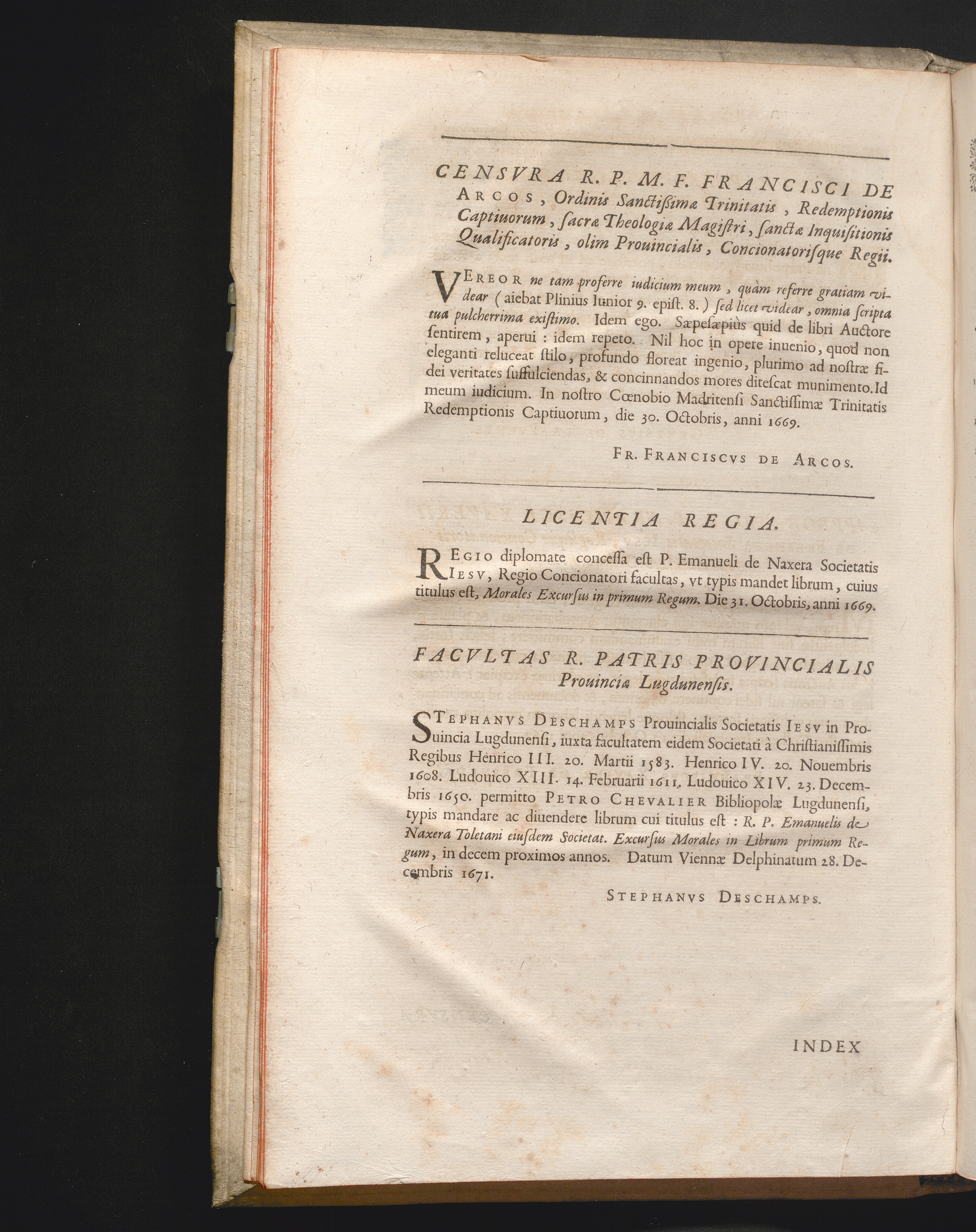 1 (1672) R. P. Emanvelis De Naxera Toletani, E Societate Iesv, Sacrarvm Litterarvm Interpretis, Regiiqve Concionatoris. Excvrsvs Morales In Librum primum Regum : Opus non solùm Theologis; sed etiam verbi Divini Præconibus perutile. Cum quatuor Indicibus, Primo Paragraphorum, Secundo ad Conciones construendas, Tertio Locorum Sacræ Scripturæ, Quarto Rerum & Verborum. Pars Prima.