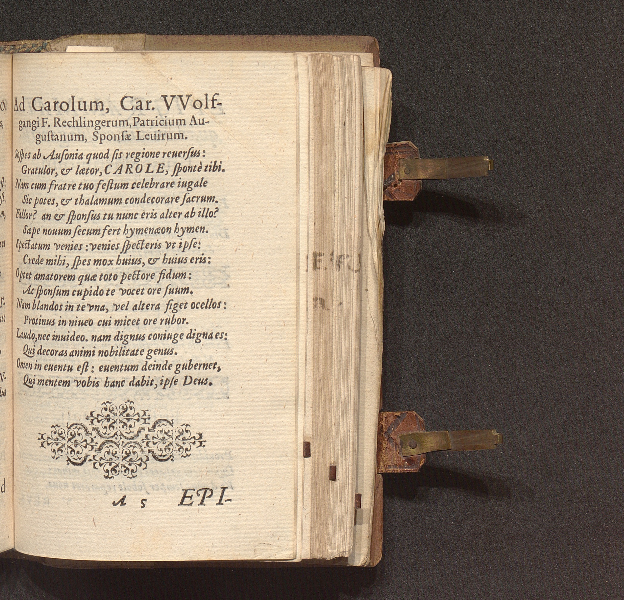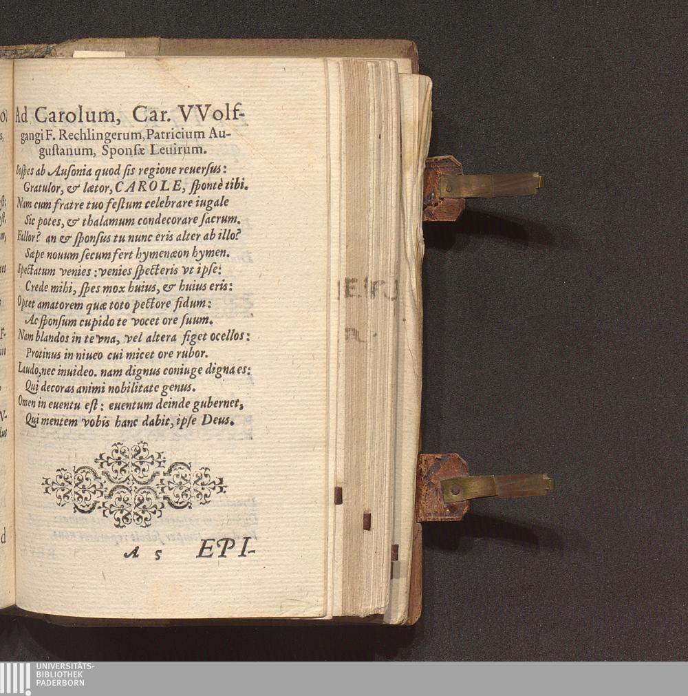 MELOS, SIVE || Oda || DE NVPTIIS || VVOLFGANGI || RECHLINGERI, Caroli || VVolfgangi F. Patricij Augustani,|| Sponsi nobilissimi: Et Euphrosynæ || Hainzeliæ, Magni illius Ioan. Ba-||ptistæ Septemuiri F. Patriciæ || Augustanæ, Sponsæ || nobilissimæ.|| : Cum eiusdem argumenti Epigram-||matis quibusdam.|| / NICOLAVS REVSNERVS || IC. & P. C.||