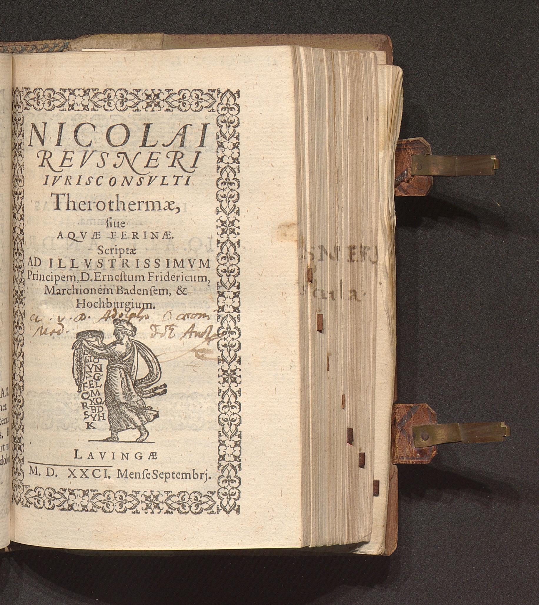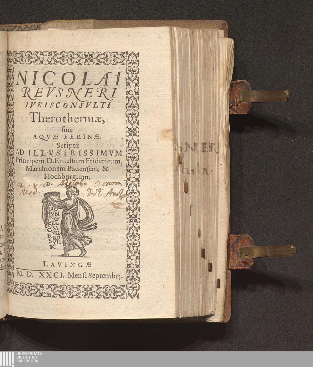 Nicolai Revsneri Ivrisconsvlti Therothermae, siue Aqvae Ferinae : Scriptae Ad Illvstrissimvm Principem, D. Ernestum Fridericum, Marchionem Badensem, & Hochburgium