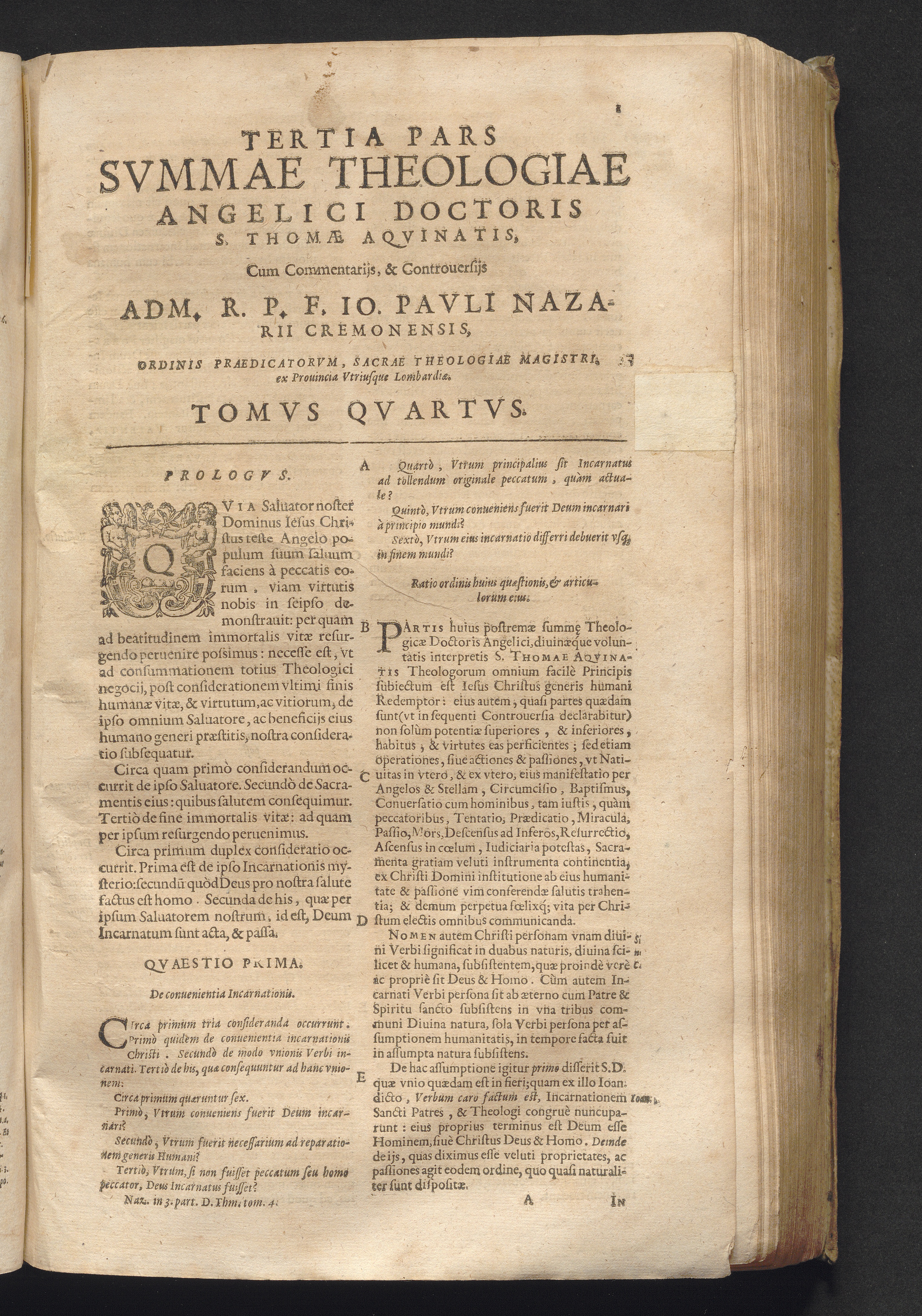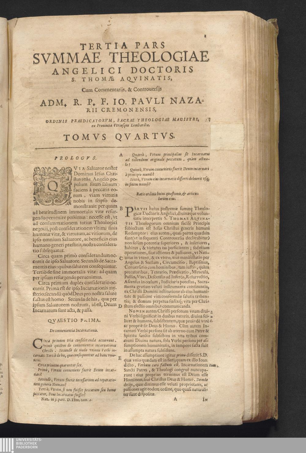 4 (1621) Commentaria et disputationes scholastica in Summam D. Thomae Aquinatis / auctore Joanne Paulo Nazario. Tomvs Qvartvs / Jn Qvo Controversiæ Jnter Theologos Veteres Ac Recentiores De Incarnationis Christi Mysterio
