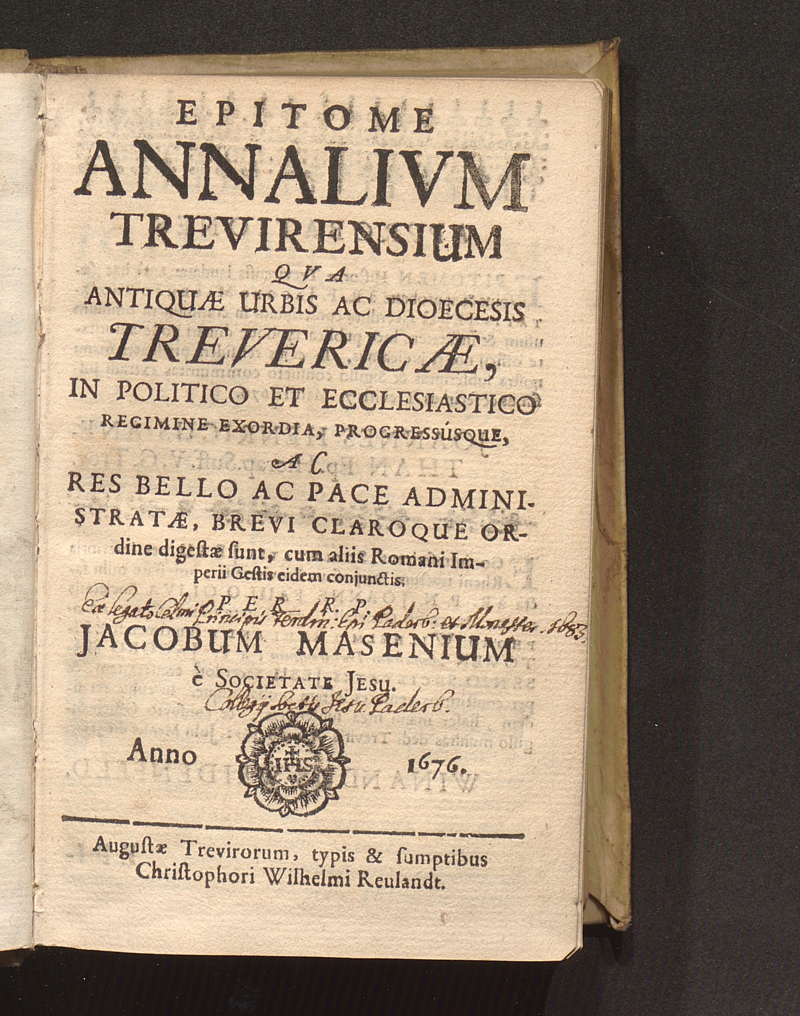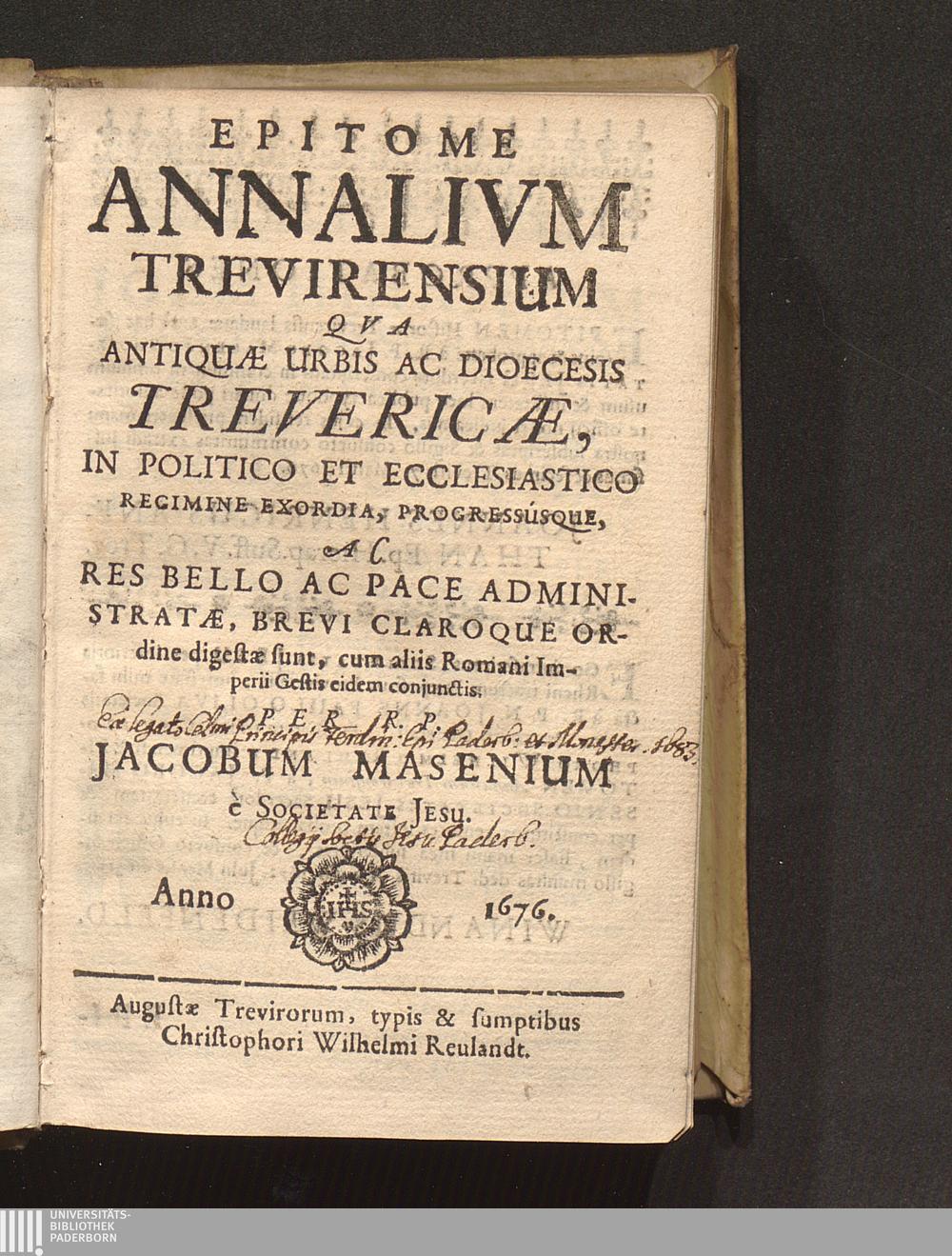 Epitome Annalivm Trevirensium : Qva Antiquae Urbis Ac Dioecesis Trevericae, In Politico Et Ecclesiastico Regimine Exordia, Progressúsque, Ac Res Bello Ac Pace Administratae, Brevi Claroque Ordine digestae sunt, cum aliis Romani Imperii Gestis eidem conjunctis / Per R. P. Jacobum Masenium è Societate Jesu
